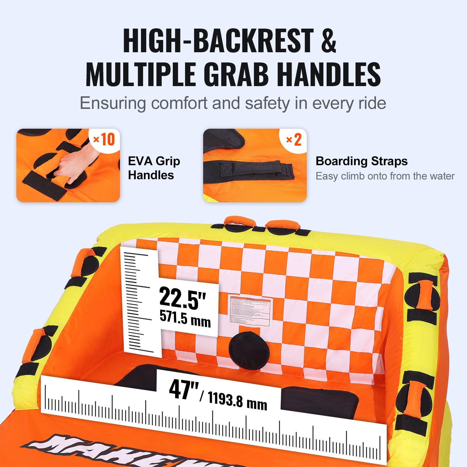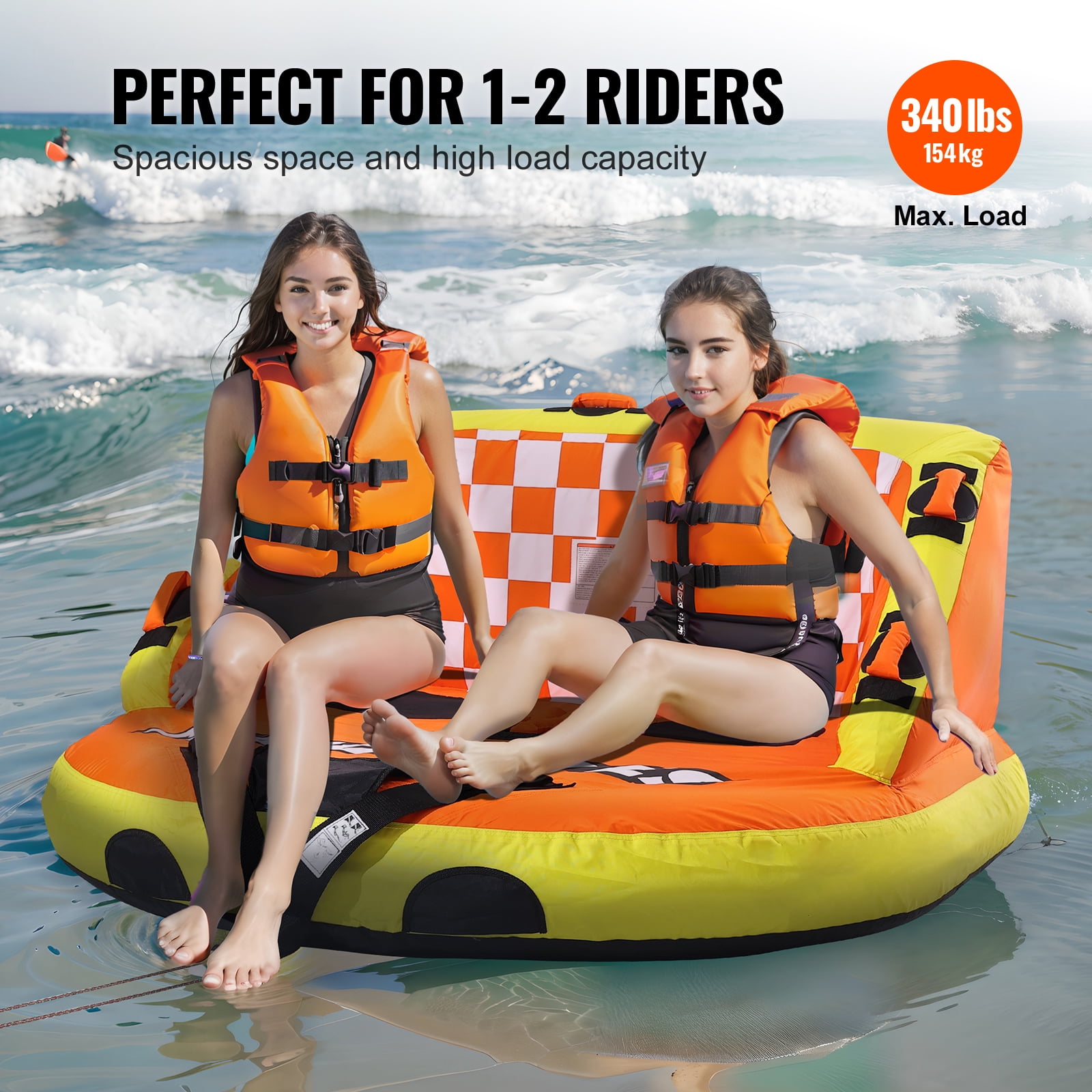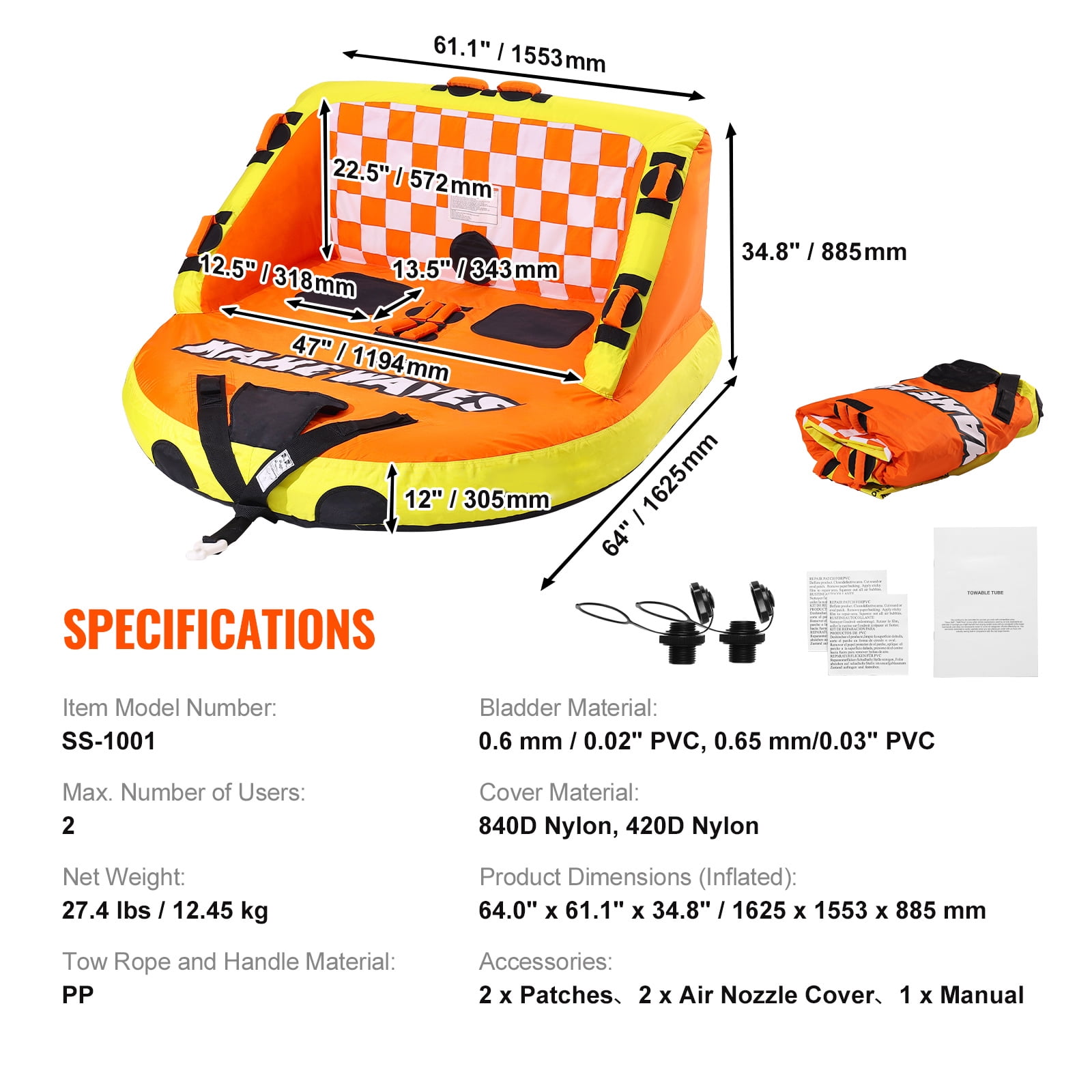 Product Description 2-Person Couch Towable Tube Introducing our incredible towable tube, specially designed to withstand punctures and provide a safe and comfortable ride. With its eye-catching colors, ergonomic high back, wide side walls, and 10 EVA grips, you’ll feel secure and exhilarated as you glide across the water. Switching between towing modes is a breeze, allowing you to customize your adventure. Thanks to the Boston valve, inflation and deflation are quick and effortless. Measuring 64.0″ x 61.1″ x 34.8″ after inflation, this boating towable tube is perfect for up to two riders. We also include two repair patches for added convenience. Get ready to create unforgettable memories with your loved ones as you embark on thrilling water escapades! Exciting and Secure Water Adventure Experience the thrill of high-speed fun with the KFFKFF towable tube for boating. Feel secure as you lean back on the comfortable 22.5″ high backrest and hold onto the handle for an exhilarating wave-riding experience without any fear of being thrown off. Unleash Your Inner Adventurer Embark on an unforgettable sea surfing adventure with our inflatable towable tube! Crafted with durable 840D and 420D nylon cloth, and featuring inner tubes made of 0.02″/0.6 mm and 0.03″/0.65 mm thick PVC, our boat tubes and towables are built to withstand rough waters and provide long-lasting enjoyment. Effortless 4-Step Inflation Inflating our 2-person inflatable boat tube is a breeze with its fast and secure air valve. Simply unscrew the top cover counterclockwise to inflate, and deflate quickly by turning the entire valve counterclockwise. It’s as easy as 1-2-3-4! Endless Riding Possibilities Discover a world of riding possibilities with the KFFKFF towable tube for boating. With front and rear traction points, you can enjoy different riding positions and experiences. Adjust the nylon belt for the perfect setup and unlock new thrills on the water. Designed for Unforgettable Moments Create unforgettable memories with your companion on our 2-person boat tube. Its wide and secure deck seats ensure stability and balance for both children and adults, making it perfect for couples, friends, and families. Long-Term Enjoyment Guaranteed We prioritize your long-term enjoyment. That’s why our water sport towables come with 2 nylon repair patches. Easily patch up any defects to continue having fun – simply deflate, clean, apply the patch, and get back to riding the waves. Specifications Item Model Number: SS-1001 Bladder Material: 0.6 mm/0.02″ PVC, 0.65 mm/0.03″ PVC Cover Material: 840D Nylon, 420D Nylon Capacity: 340 lbs/154 kg Tow Rope and Handle Material: PP Max. Number of Users: 2 Net Weight: 27.4 lbs/12.45 kg Product Dimensions (Inflated) : 64.0″ x 61.1″ x 34.8″ / 1625 x 1553 x 885 mm Package Content 1 x Towable Tube 2 x Patches 2 x Air Nozzle Covers 1 x Manual