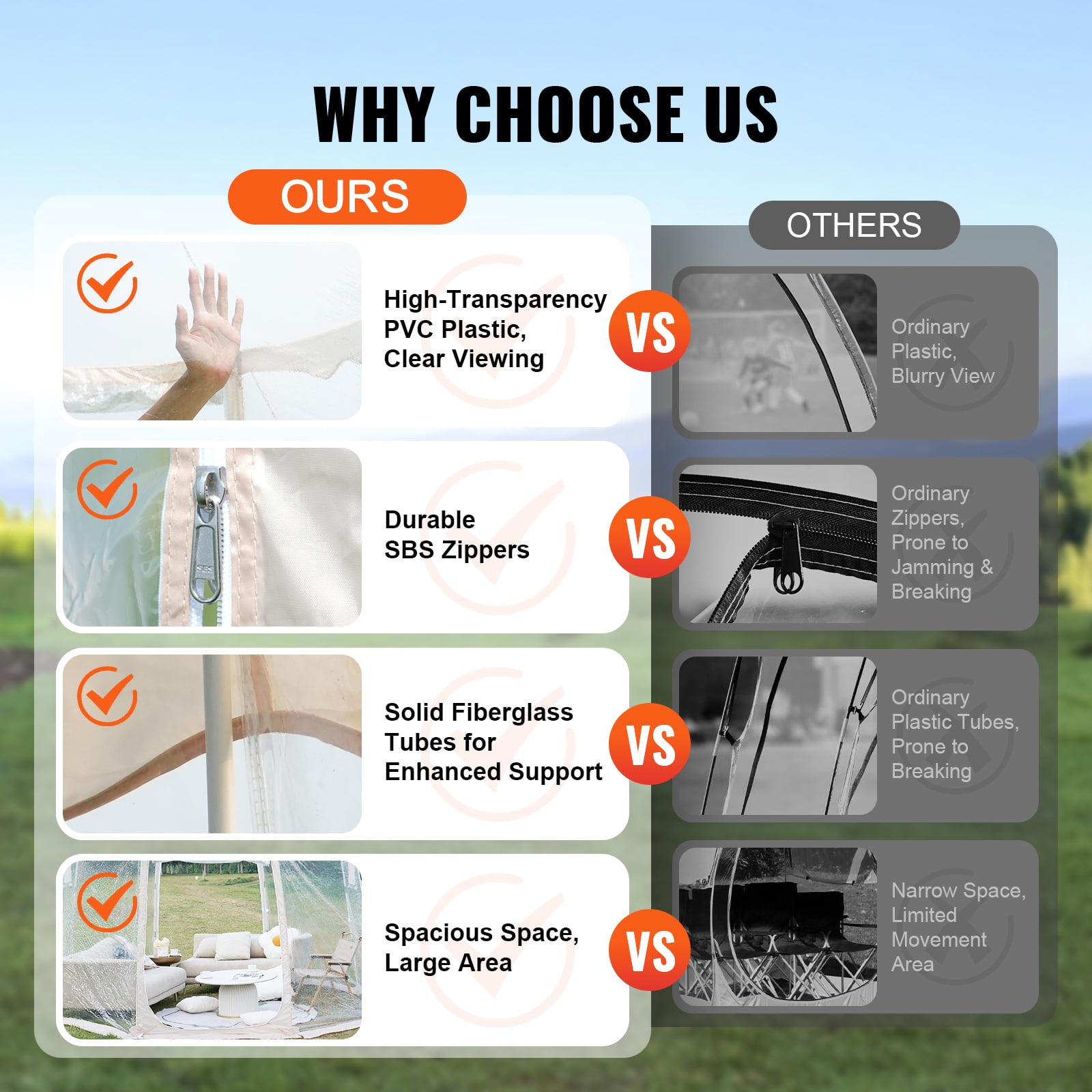 10 x 10 ft Waterproof & Cold-Resistant Tent: The KFFKFF sports tent is designed to keep you cozy while providing a crystal-clear view. Its tear-proof material and heat-sealed seams ensure no leaks, even in snowy conditions. With its roomy eight-sided design and two windows, you’ll have plenty of space to enjoy the outdoors. Stable, Wind-Resistant & Durable: The KFFKFF football tent is made to stand up to gusts with its sturdy fiberglass poles and wind ropes. We’ve included glow-in-the-dark stakes and sandbags for extra stability, ensuring the tent won’t budge or crack in the wind. Plus, the easy-to-use double-sided zippers make getting in and out a breeze! Easy Setup & Carry-On Ready: Set up the KFFKFF rain tent for sports in minutes with its simple fiberglass pole system. Lightweight and compact, it folds down into the included carrying bag for hassle-free transport on your outdoor adventures. Perfect for Any Outdoor Fun: The KFFKFF sports bubble tent offers a 540° panoramic view, making outdoor events even more enjoyable. Whether you’re catching a game, stargazing, or enjoying camping, picnics, and parties, this tent is ready for it all in your yard, on the lawn, by the river, or in the woods. What’s in the Box: The KFFKFF sports pod kit includes 1 x tent, 13 x support poles, 16 x ground stakes, 8 x wind ropes, 1 x tension strap, 4 x sandbags, 1 x carrying bag, and 1 x instruction manual.