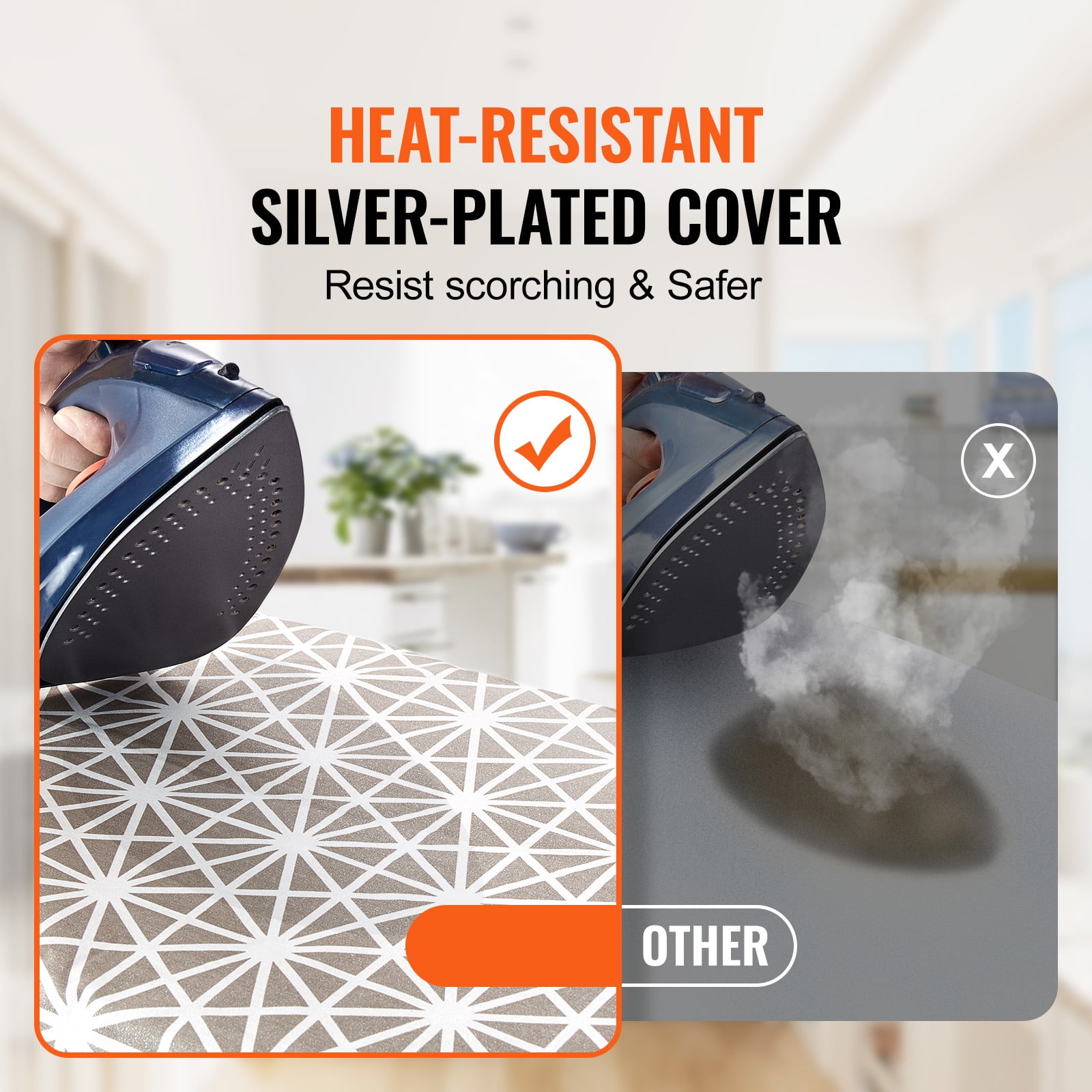 Product Description Smooth out Wrinkles with KFFKFF Full Size Ironing Boards Elevate your ironing routine with our ironing board. With a 4-layer design, 2 different covers, height-adjustable feature, and foldable frame, this ironing board effortlessly transforms your ironing process into a breeze, ensuring perfectly pressed garments every time. No More Scorching & Staining No more wrinkle struggles or scorching worries! Our heat-resistant silver-plated cover ensures smooth, wrinkle-free results while prioritizing your safety. Even if you receive a call while ironing, confidently place the iron on the board without any burn concerns. 4 Layers Heat Resistant Structure KFFKFF ironing table stands out with its 4 layers design. Featuring a removable cover, 7mm thickened sponge padding layer, 7mm thickened needle cotton layer, and heat-resistant breathable panel, it ensures efficient wrinkle elimination. Bonus 100% Cotton Covers For easy replacement and washing, we provide you with two covers: one heat-resistant and one 100% cotton. The cotton cover provides a smooth, soft surface, perfect for ironing delicate fabrics with utmost care and convenience. Height Adjustable Discover unparalleled comfort with our adjustable ironing board. With 7 height levels spanning from 28 to 36 inches, you have the freedom to iron while seated or standing, ensuring the utmost comfort while achieving wrinkle-free perfection. Perfect Size & Space-Saving Measuring 51 inches in length and 13 inches in width. The ironing board full size provides you with abundant space for all your ironing needs. The iron stand effortlessly folds, allowing for convenient storage in the closet, behind doors, or in the laundry room, without occupying much space. Heavy Sturdy Ironing Boards Our large ironing board’s heavy-duty steel frame provide unparalleled durability. With a sleek black powder coating finish, the whole metal frame ensures long-lasting performance and a timeless appearance. Specifications Product Size: 50.9×13.1×36 in/1292x334x915 mm Ironing Board Size: 43.3”x13.1”/1100×334 mm Item Model Number: P1343H1-22 Adjustable Height: 28.1-36in/715-915 mm Max. Loading: 44 lbs/20 kg Layer Material: PP Panel+Sponge+ Needle Cotton + Heat-resistant Silver-plated Cover Cover: 1 x 100% Cotton Cover + 1 x Heat-resistant Cover Main Material: PP Panel+Sponge+ Needle Cotton + Heat-resistant Silver-plated Cover + Q235 frame Product Weight: 9.59 lbs/4.35 kg Package Content 1 x Ironing Board 1 x 100% Cotton Cover 1 x Manual