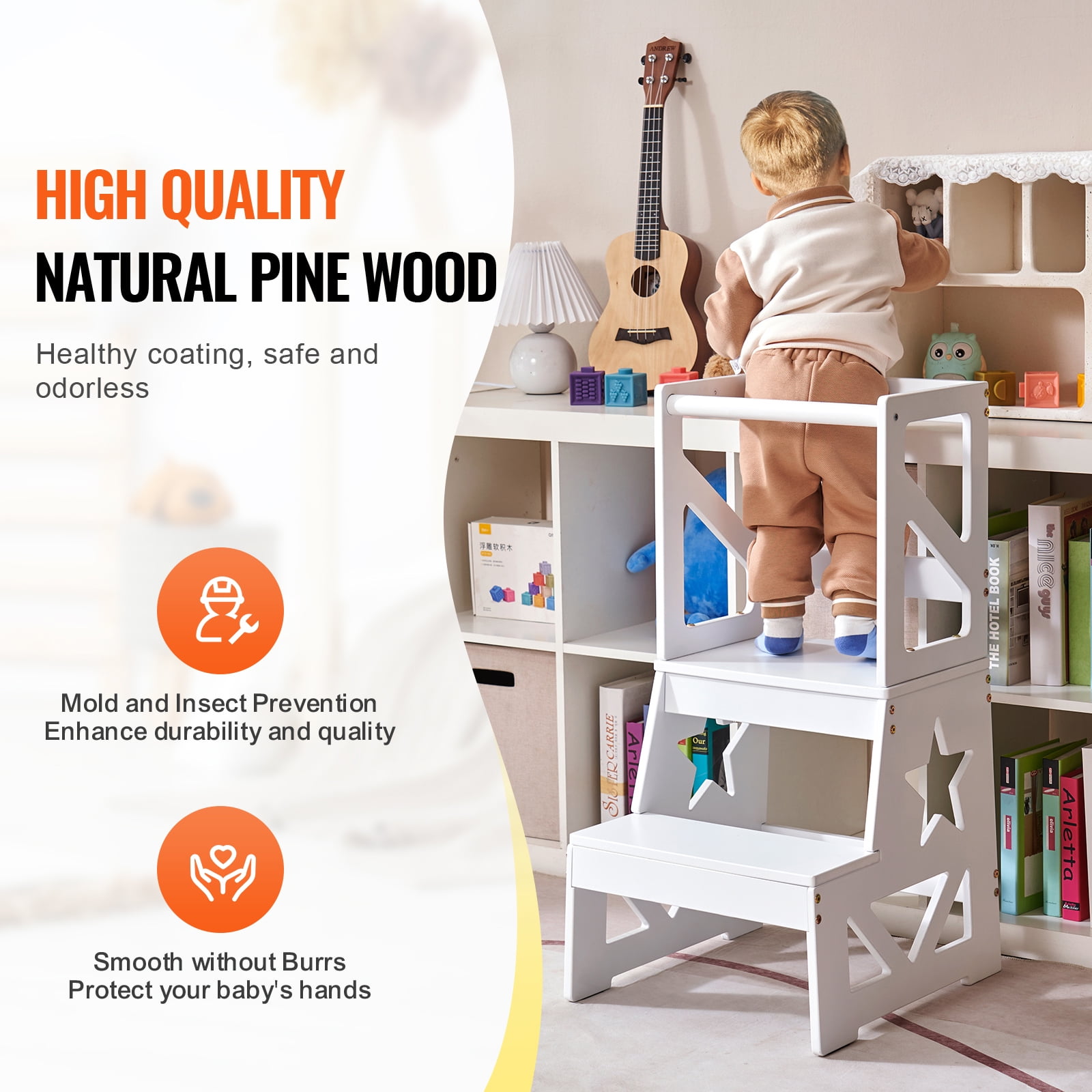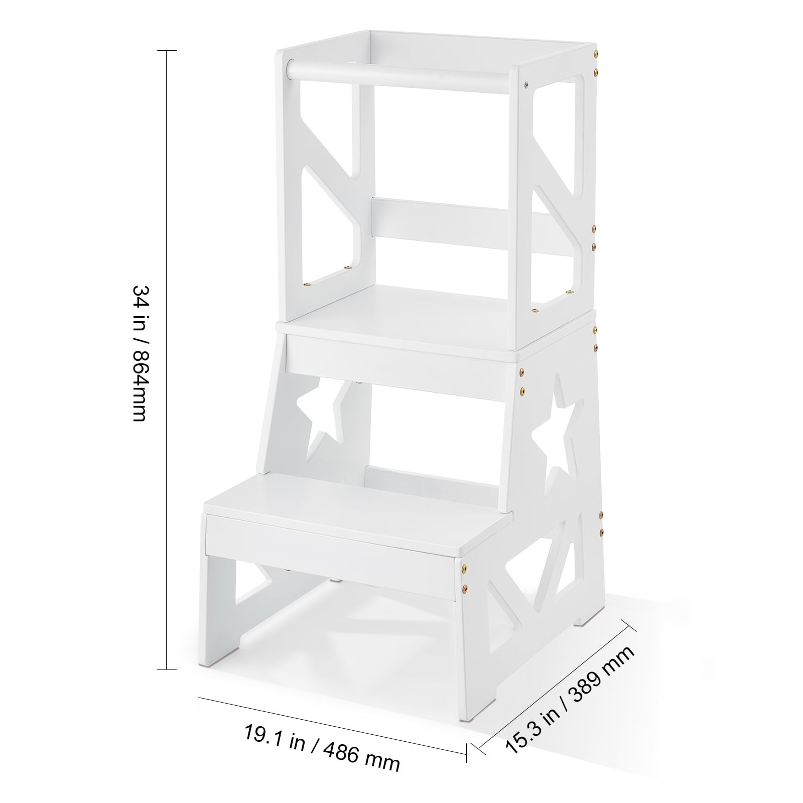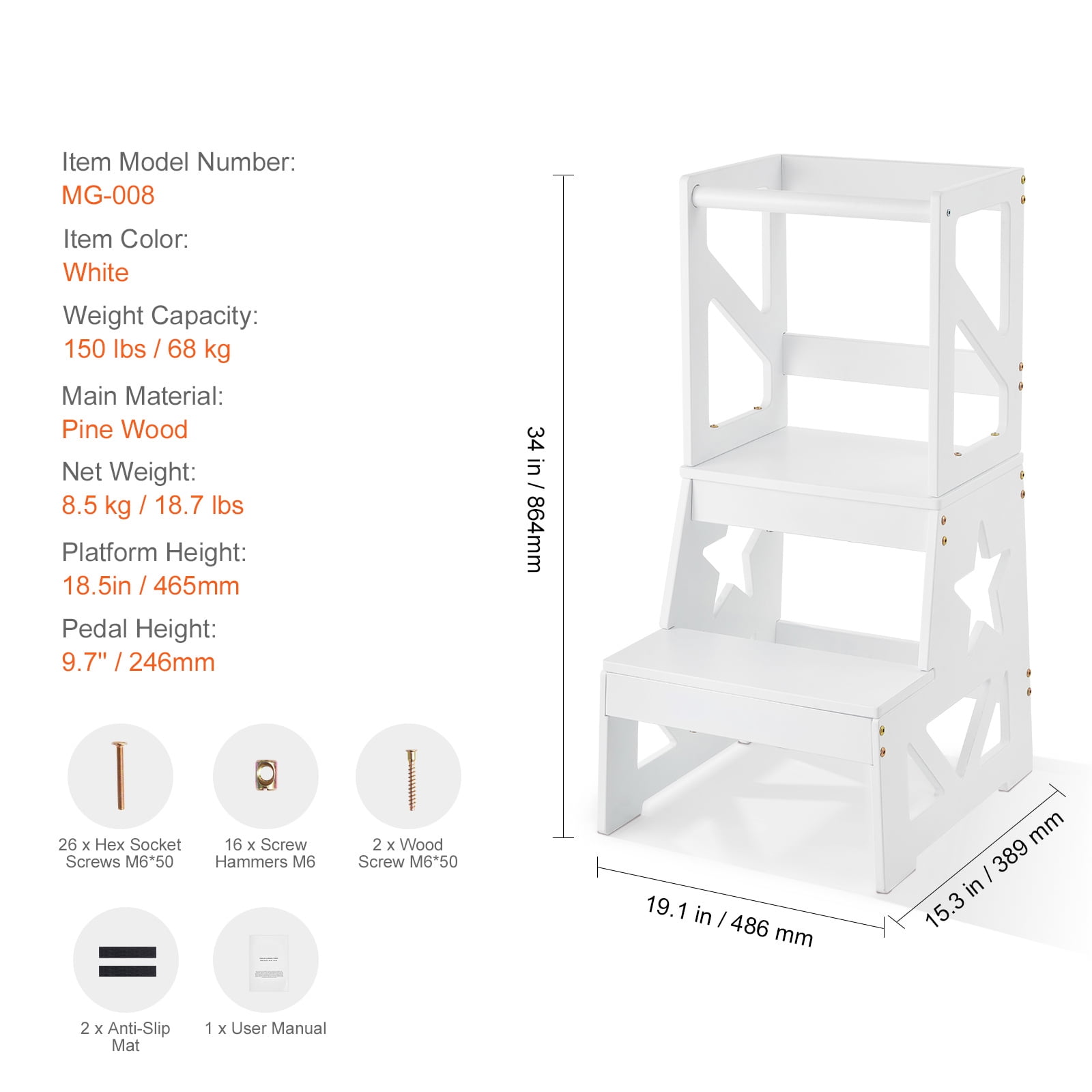 Product Description KFFKFF Toddler Step Stool for Kids Safeguard every moment of growth, the perfect companion for children’s exploration! KFFKFF natural pine wood toddler step stool is the gateway to fostering kids’ independence, exploration and growth. Let your little one explore, cook, and reach new heights: 150lbs loading and stable “A” frame. High Quality Materials Crafted from natural pine wood, our toddler stool kids step stool provides your child with a foundation of health and safety. The smooth, burr-free surface is gentle on delicate hands, while the non-polluting coating ensures a secure environment for your child’s healthy growth. Secure and Spacious Platform A spacious stepping platform ensures your baby stands securely! Our toddler helper stool provides a stable surface, reducing the risk of slipping or stepping off. Let your child confidently and securely complete various tasks and enjoy the fun of exploring and growing! Safety and Stability Trust in our toddler standing tower for a secure and enjoyable experience. Enhanced with safety protective rails for added frame safety , a steadfast “A” structure enhances stability, and non-slip legs to prevent tipping over, your child can explore with peace of mind. Fostering Independence The perfect gift for Fostering Independence! Give your child the opportunity to brush their teeth, cook, and reach items on their own. Our kids toddlers step stool frees up your hands while nurturing your child’s independence, allowing them to enjoy the journey of growth. Multi-Use Toddler Step Stool The toddler helper tower combines practicality and versatility. It’s lightweight and easy to move, making it a super practical addition for kitchen, bathroom or work space. Large Loading Capacity Unlock your baby’s potential and foster their confidence and independence with this stable kitchen learning stool, which has a strong weight capacity of 150lbs and is ideal for toddlers aged 18 months and older! Specifications Item Model Number: MG-008 Weight Capacity: 150 lbs / 68 kg Platform Height: 18.5 in / 465 mm Pedal Height: 9.7 in / 246 mm Item Color: White Main Material: Pine Wood Net Weight: 18.7 lbs / 8.5 kg Product Dimensions: 34 x 15.3 x 19.1 in / 864 × 389 x 486 mm Package Content 1 x User Manual 26 x Hex Socket Screws M6*50 16 x Screws Hammer M6 2 x Wood Screw M6*50 2 x Anti-Slip Mat