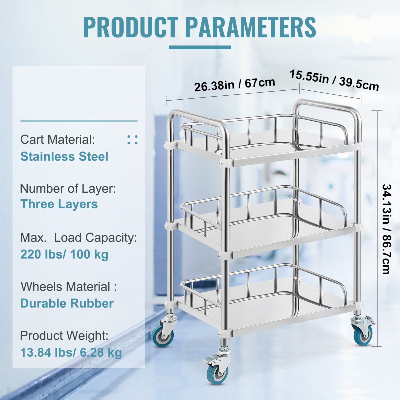 Product Description 3 Shelves Mobile Lab Cart The stainless steel laboratory trolley supports up to 220 lbs. This laboratory rolling cart is designed with 3 shelves, which optimizes your storage solutions. 4 rolling casters (2 lockable) provide smooth mobility. Suitable for laboratories, clinics, SPAs, beauty salons, etc. Well Organize Your Equipment Three-shelf design provides separate and ample storage space for different items. Keep all your equipment well-organized. Thanks to the rail guard, you can stop worrying about items falling from the cart. Well-made Lab Cart Our lab cart has everything going for it. It’s solidly built, neat, well-made, and without scratches on its mirror surface. The stainless steel material shows its excellent performance in daily abuse. Stands up to Large Loads This heavy-duty lab trolley is constructed of stainless steel, making it stable and load-bearing. It rolls with easily with approximately 220 lb of weight on it. Sturdy enough even with a large loading weight. 360? Swivel Casters Four 360? rolling wheels (2 wheels are lockable) provide easy mobility for transporting heavy equipment. Stay in control of moving and fixing anywhere. Handle for Easy Transport A curved handle is designed on the side of this lab cart, making it comfortable to grab. The handle makes it easier to pull, push, and control the cart. Versatile Application This lab serving cart allows easy maintenance of laboratory items. It is suitable for laboratories, schools, universities, salons, etc. Ideal for item storage, arrangement, and transport. Specifications Item Model Number: K-ST756 Material: Stainless Steel Layer: 3 Wheel: Omnidirectional, Lockable Maximum Weight Capacity: 220 lbs/100 kg Product Size: 26.38×15.55×34.13 inch/670x395x867 mm Product Weight: 13.84 lbs/6.28 kg Package Content 1 x Lab Medical Cart