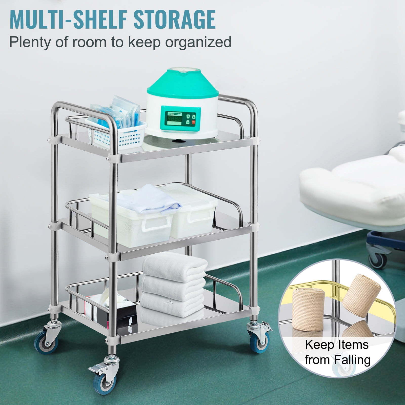 Robust 3-Tier Design: Our laboratory cart with three shelves offers ample space for medical and lab equipment. Measuring 26.38″x15.55″x34.13″, it provides generous room between shelves for accommodating large items. Featuring built-in guardrails, it ensures items remain secure during transport. Durable Stainless Steel: Built with solid stainless steel, this lab trolley can support up to 220 lbs of equipment and supplies. Its rust-resistant surface ensures easy cleaning, making it perfect for lab environments. Effortless Mobility: Equipped with four universal wheels and silent casters, this rolling cart moves smoothly even when fully loaded. Two locking casters provide stability on uneven surfaces. The wide handle ensures a comfortable grip for easy maneuvering. Versatile Applications: This serving cart is ideal for storing medical tools or beauty supplies and finds widespread use in hospitals, beauty salons, clinics, spas, tattoo studios, and pet shops. Quick Assembly: The lab cart is really convenient for daily use. Minimal effort for assembly is all it takes, making it easy to construct this utility cart in 10 minutes. Focus on your next big project sooner with our quick installation.
