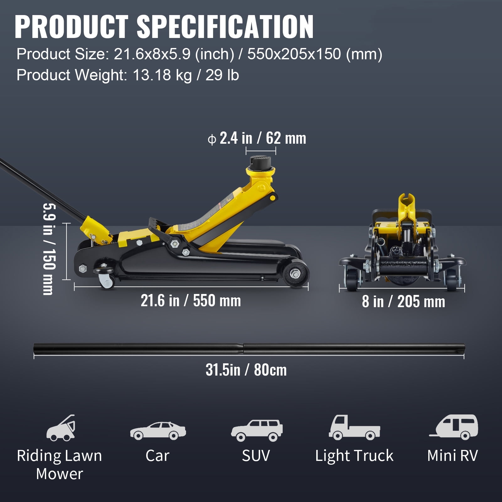 Product Description 2.5 Ton Low Profile Floor Jack Experience the exceptional performance of the KFFKFF low profile floor jack as it effortlessly glides beneath your vehicle, swiftly raising it off the ground. Boasting a remarkable lifting capacity of 2.5 tons/5500 lbs and a wide lifting range of 3.35″/85 mm-14.96″/380 mm, our jack is more than capable of handling a diverse range of vehicles. Meticulously crafted from high-strength steel, it is engineered to conquer even the most demanding tasks. Whether you require it for general use or heavy-duty industrial applications, this floor jack is fully equipped to tackle any job with ease. The inclusion of a rubber saddle pad and foam bumper pad ensures the utmost protection for your cherished vehicles. Furthermore, the steel casters enable effortless transportation. Elevate your expectations with the unrivaled power, security, and reliability of the KFFKFF floor jack! Impressive Weight Capacity With a remarkable load-bearing capacity of 2.5 tons or 5500 lbs, this floor jack is specifically designed to handle heavy-duty lifting tasks. Its lifting range spans from 3.35″ (85 mm) to 14.96″ (380 mm), providing versatility for various vehicle types. Compliant with CE, UKCA, and ASME standards, this robust and dependable floor jack is a reliable choice for all your lifting needs. Sturdy and Long-Lasting Construction Constructed from high-quality steel, this floor jack is built to withstand the test of time. Its durable and solid design ensures that it can effortlessly lift most vehicles without compromising on performance or safety. Effortless and User-Friendly Operation Operating this floor jack is a breeze. Simply rotate the handle in a clockwise direction to tighten the valve, ensuring a secure closure. Then, position the jack’s saddle beneath the lifting point of the vehicle and start pumping the handle to initiate the lifting process. To lower the jack, gradually rotate the handle counterclockwise. This user-friendly mechanism makes lifting and lowering your vehicle a hassle-free experience. Enhanced Vehicle Protection Equipped with a rubber pad attached to the saddle, this floor jack provides excellent grip and prevents the vehicle from slipping during lifting. This feature not only safeguards your vehicle but also protects the floor jack from potential damage. Additionally, the rubber pad is easily replaceable, ensuring long-lasting functionality. Reliable Seal and Easy Maintenance Featuring a high-quality cylinder, this floor jack minimizes wear on the sealing ring, enhancing its overall service life. The rubber oil plug offers dependable sealing performance and facilitates convenient filling and exhausting. With these features, maintenance becomes effortless, allowing you to focus on the task at hand. Smooth Maneuverability Effortlessly maneuvering around cars and trucks is made possible by the two rear swivel casters and the large front steel caster. These casters ensure smooth rolling and precise positioning, making your lifting tasks more efficient and convenient. Specifications Model: S385 Lift Weight Capacity: 5500 LBS/2.5 Tons Load Bearing Method: Hydraulic Single Pump Material: Steel Minimum Height: 3.35″/85 mm Maximum Height: 14.96″/380 mm Tray Diameter: Φ 2.4 in/62 mm Product Size (L x W x H): 22.2×8.7×5.2 (inch)/563.5x221x133 (mm) Handle Length: 31.5 in/800 mm Product Weight: 12.3 kg/27.1 lb Package Content 1 x Low Profile Floor Jack 1 x Manual