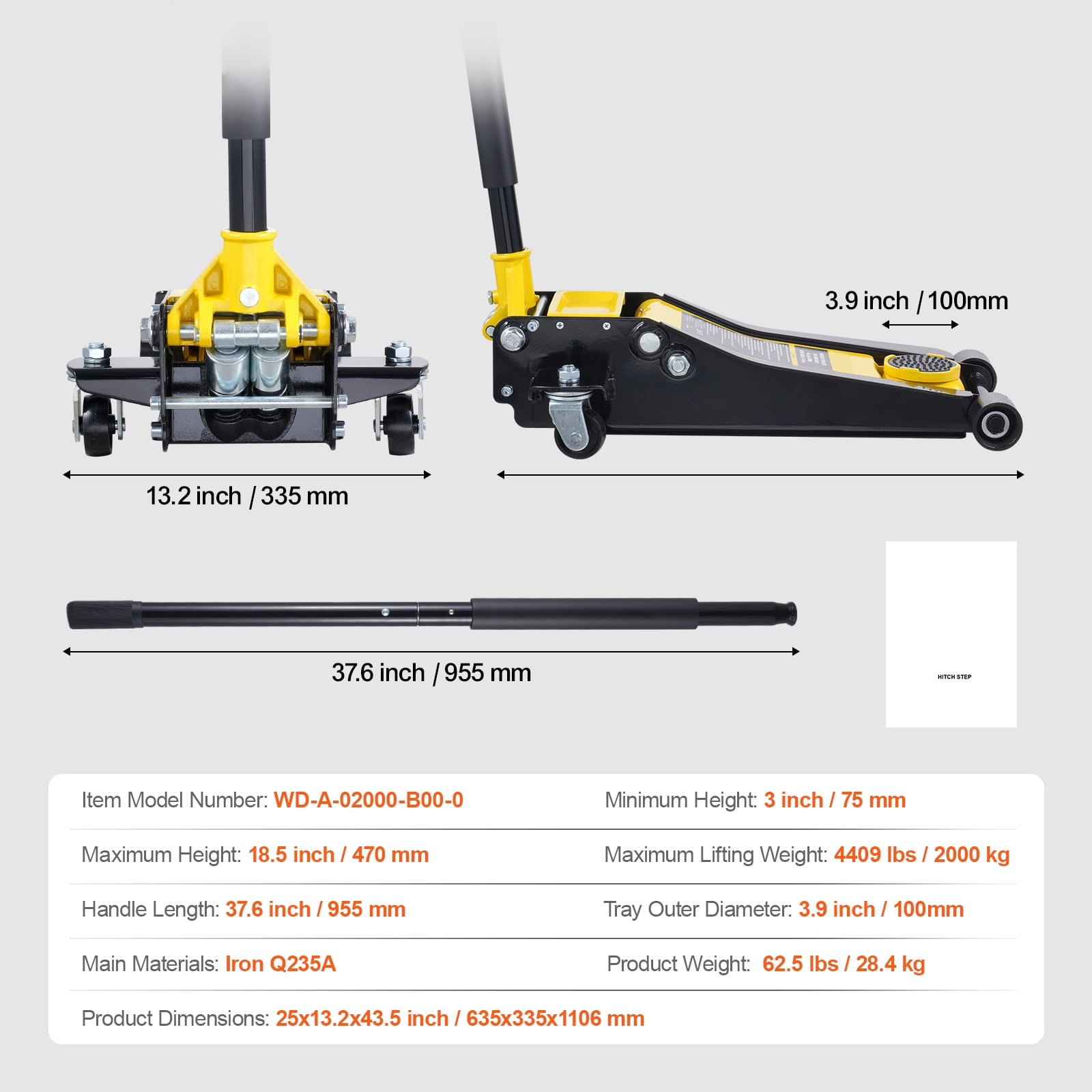 ” Product Description Compact Hydraulic Jack Introducing the KFFKFF Compact Hydraulic Jack, the ultimate solution for effortlessly lifting your vehicle. This innovative jack effortlessly glides under your vehicle and swiftly raises it off the ground. With a remarkable lifting capacity of 2 tons / 4409 lbs and an impressive lift range of 3 inches to 18.5 inches, it is suitable for lifting a wide range of vehicles, including those with high clearance. Crafted from robust and long-lasting iron, this jack is built to withstand even the toughest challenges. The advanced dual-piston system ensures rapid lifting of the jack saddle for quick loading. Additionally, the rubber saddle pad provides optimal protection for your beloved vehicle. Equipped with smooth-rolling casters, this jack offers effortless maneuverability. Get ready to experience the power, safety, and reliability of the KFFKFF Compact Hydraulic Jack. Prepare to elevate your lifting experience like never before! KFFKFF Auto Repair Assistant The KFFKFF floor hydraulic jack is designed to effortlessly lift cars up to 2 TON, making it the perfect tool for auto repair work on sedans and SUVs. With its reliable performance and stress-free operation, it simplifies your car maintenance tasks. Versatile Lifting Capability Experience the convenience of the KFFKFF low-profile floor jack, which easily accommodates a wide range of narrow vehicles. Its exceptional lifting capacity allows you to effortlessly lift vehicles with ultra-high chassis, providing you with unmatched versatility. Before making a purchase, please ensure to measure your chassis height. Efficiency and Safety Combined When it comes to frequent use of a low-profile floor jack, the KFFKFF dual-cylinder system ensures faster lifting of heavy objects. With its stable design, built-in safety features, and sealed hydraulic cylinder, the risk of tilting or instability during lifting is minimized, ensuring your safety at all times. Reliable and Long-lasting Crafted from high-strength iron, the KFFKFF floor jack is built to withstand the demands of regular car maintenance and repair tasks. Its sturdy construction guarantees its reliability, making it a durable tool that will serve you for years to come. Enhanced User Experience The KFFKFF floor jack is equipped with a large rubber saddle, providing added protection to your vehicle during lifting. Its large front wheels and swivel casters ensure quick and easy movement and transport of the jack. Additionally, the detachable handle offers convenience and ease of use. Simple Maintenance To ensure optimal performance and longevity of your KFFKFF car jack, it is recommended to replace the hydraulic oil at least every three years. The process is simple: remove the filler screw and add the oil slowly. Please note that hydraulic oil needs to be purchased separately. Specifications Item Model Number: WD-A-02000-B00-0 Minimum Height: 3 inch / 75 mm Maximum Height: 18.5 inch / 470 mm Maximum Lifting Weight: 3306.9 lbs / 1500 kg Main Materials: Q235A Product Weight: 62.5 lbs / 28.4 kg Product Dimensions: 25×13.2×43.5 inch / 635x335x1106 mm Package Content 1 x Floor Jack 1 x Set of Accessories “