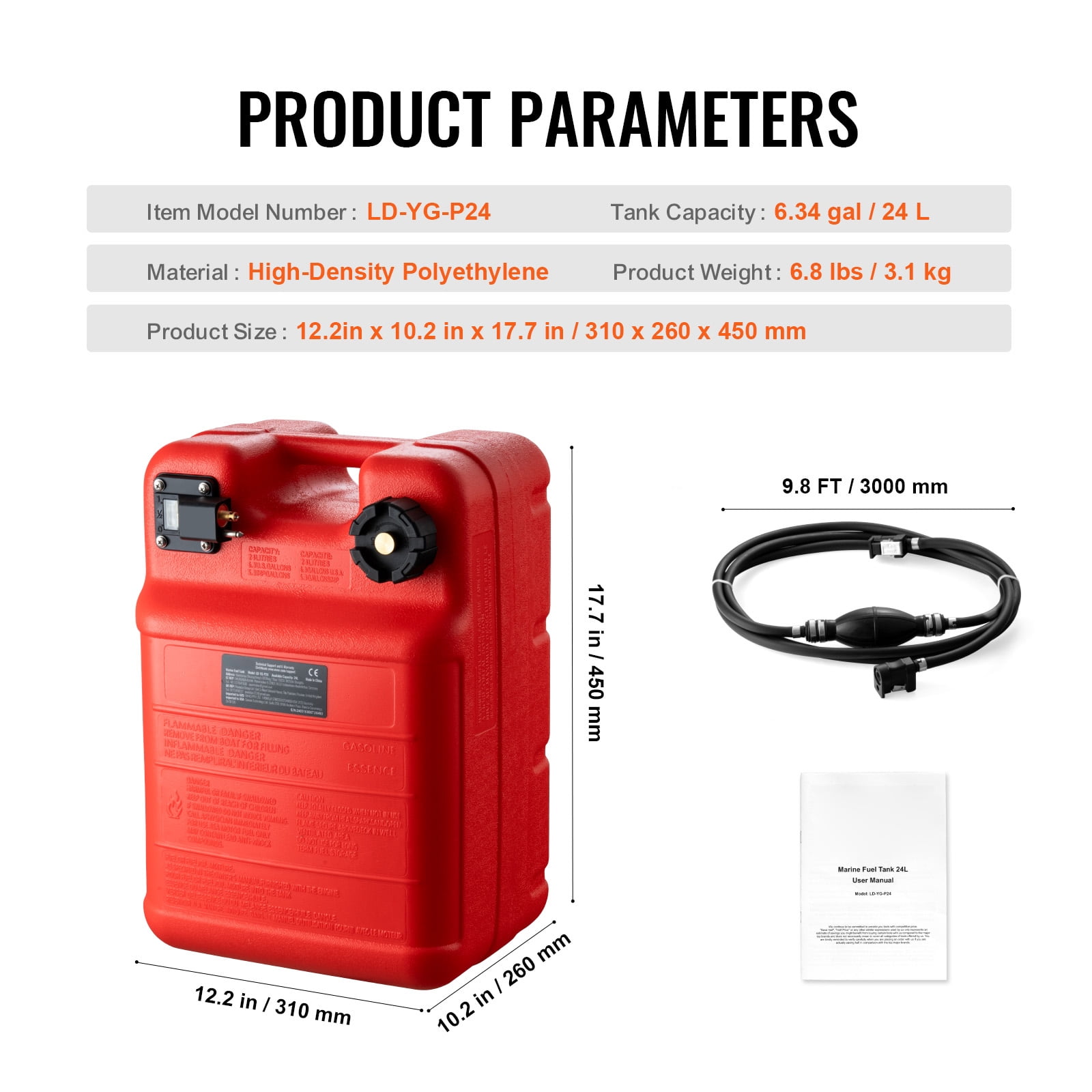 No More Leaks: Our boat fuel tank cap is a revolutionary product! It offers two innovative designs: sealed or vented. By simply loosening the yellow metal nut, you can release the air inside the tank. Tightening it securely seals the tank, ensuring smooth fuel flow and preventing any gas vapor leakage. Wide Compatibility: Our boat gas tank comes with a 9.8 ft/3 m long fuel hose with a 0.3″/8 mm inner diameter, making it compatible with the majority of marine fuel tank interfaces. It is the perfect companion for your outboard motor adventures, whether you’re on a fishing boat or enjoying a relaxing time on a deck boat. Durable Construction: Crafted from high-density polyethylene, our boat fuel tank boasts a substantial 6 gal/24L capacity. It is built to withstand aging, impact, and corrosion, ensuring its shape remains intact even after prolonged use. Please note that prolonged exposure to direct sunlight should be avoided to prevent product aging and expansion risks. Convenient Transport and Storage: Our portable outboard fuel tank is designed for hassle-free transportation. Equipped with a molded top handle, it allows for easy carrying from the dock to your fishing vessel or small boat. Its compact design also fits snugly under boat seats, saving valuable space. Clear Fuel Level Monitoring: Stay informed about the fuel level inside the marine gas tank with our practical fuel gauge. The separate inlet and outlet prevent any fuel spillage, keeping gasoline away from dirt and debris. For optimal safety, it is recommended to fill the tank up to 80% of its capacity, reducing gasoline evaporation and potential security risks during use.
