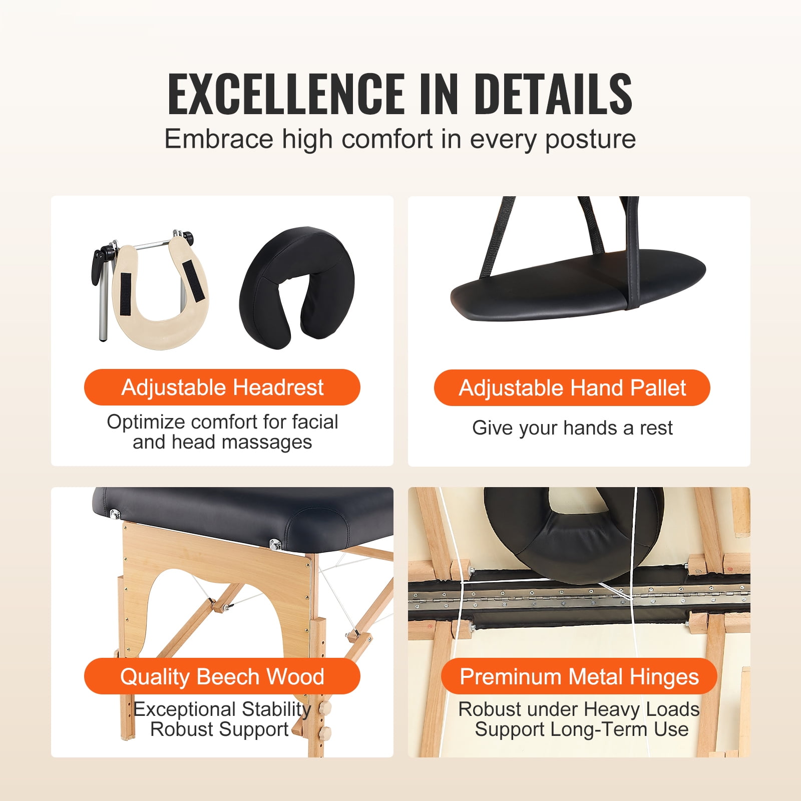 Product Description KFFKFF Professional Massage TableRelaxation Redefined: Your Perfect Massage Companion Discover the ideal combination of durability and relaxation with KFFKFF 30″ W professional massage table. Constructed from high-quality beechwood, aluminum alloy, and thickened composite board, this portable table offers a remarkable weight capacity of 750 pounds, all while weighing just 36.4 pounds. Enhanced Comfort for Your Clients Immerse your clients in pure luxury with our spacious 30-inch wide tabletop, offering ample room for relaxation and stretching. Designed to accommodate the weight of two adults, our portable folding massage table is the perfect companion for massages, spinal treatments, and therapy sessions. Thicker High-Density Sponge Immerse yourself in an unparalleled massage experience with our meticulously crafted 2.5-inch sponge. Engineered to withstand pressure and resist deformation, the KFFKFF foldable beauty tattoo table provides firm support with its high-density resilience and long-lasting rebound. Convenient Fold & Grab Portability Experience effortless portability with our folding massage table. When folded in half, it transforms into a compact suitcase-like form, allowing you to carry it with ease wherever you go. Weighing only 36.4 pounds and equipped with a durable handle, it becomes your reliable companion for outdoor use. Ideal for Professional Massage/Beauty Settings Tailored specifically for professional massage and beauty environments, our adjustable massage table is the ultimate choice for therapists and practitioners. Whether in massage centers, therapy clinics, or tattoo shops, it provides unparalleled comfort for both practitioners and clients. Unmatched Comfort Indulge in the ultimate comfort during massage sessions with our table’s ergonomic design. Carefully crafted to offer exceptional support and relaxation, it ensures a comfortable experience for both therapists and clients. Effortless Setup Enjoy the convenience of easy assembly and portability with our massage table. Lightweight yet sturdy, it can be quickly set up and moved between different locations, making it perfect for both professional settings and home use. Specifications Item Model Number: WT213G Dynamic Loading Capacity: 400 lbs / 180 kg Static Loading Capacity: 750 lbs / 340 kg Adjustable Height: 25.2 – 35 in / 640 – 980 mm Table Width: 30 in / 760 mm Sponge Thickness: 2.5 in / 63 mm Main Materials: PU Leather, Sponge, Beechwood, Plywood Maximum Dimensions: 72.8 x 30 x 35 in / 1850 x 760 x 880 mm Net Weight: 36.4 lbs / 16.5 kg Package Content 1 x Headrest 1 x Aluminum Alloy Headrest Bracket 1 x Hand Pallet 1 x Carrying Bag