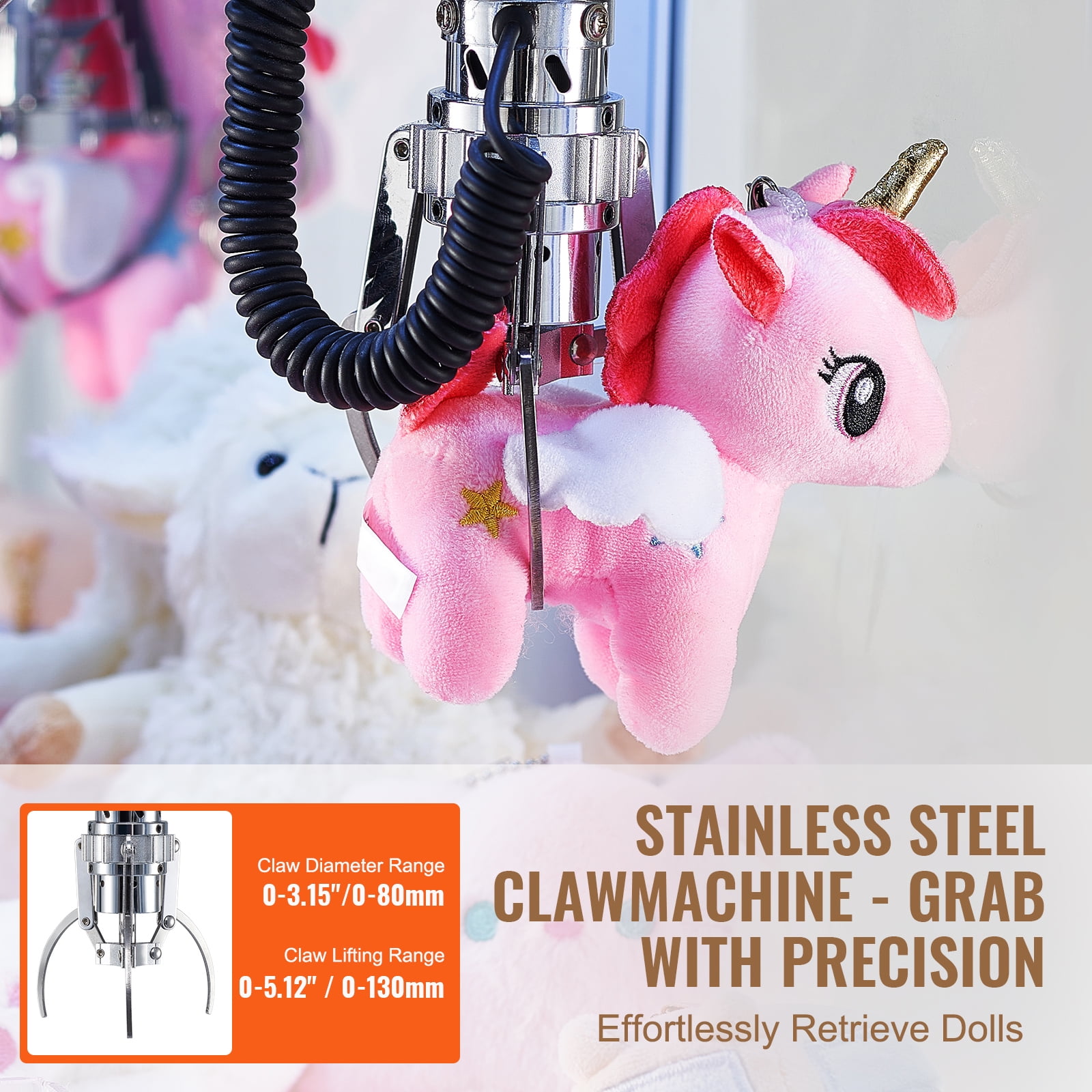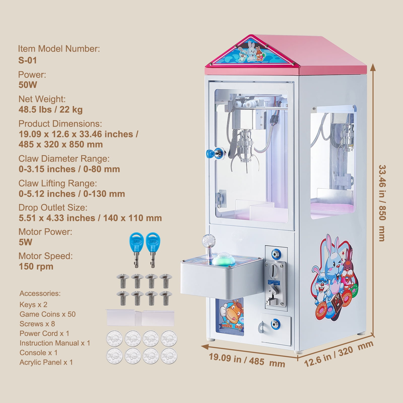 Brand Introduction KFFKFF is a leading brand that specializes in equipment and tools. Along with thousands of motivated employees,KFFKFF is dedicated to providing our customers with tough equipment & tools at incredibly low prices. Today, KFFKFF has occupied markets of more than 200 countries with 10 million plus global members. Why Choose KFFKFF? 1.Tough Quality Assurance 2.Incredibly Low Prices 3.Fast & Secure Delivery 4.30-Day Free Returns 5.24/7 Professional Customer Service Product Description Mini Claw Crane Machine Want to bring extra entertainment ideas for kids and bring a carnival home? Want to attract more guests to your shop? Why not take a toy claw machine?Our newest 150W electronic claw grabber to meet your different needs. It adopts wear-resistant iron case, clear glass windows, and LED lights. You can choose the free-play mode and enjoy a good time, playing music and control bar shines in 7 colors. Good value for money! Solid Construction More stable with superior material, you can have clear vision through transparent glass windows. The high power supply has good stability and automatic variable pressure with a certified safe radiator. Stable Coin Collector The machine features high durability with anti-counterfeit money and electromagnetism shielding. You can fluently insert coins and easily take them out. The money insert mode can be adjusted. Exceptional Comfort Use the control bar to move flexibly the grabbing mechanism back and forth, right and left to grab. Every component of the electronic claw grabber is carefully selected. Superior Durability Perfect for an instant play without a hassle, the claw with stainless steel housing and copper gear has the characteristics of strong durability and anti-interference function for a wider range of grasp. Super Value Configuration High-end configuration with complete facilities like cool lighting, dynamic music. Music play when you grab a prize or on standby mode, making you immersive for unlimited fun, you can set to open or close this function. Diversified Uses Ideal for a variety of places, such as shopping malls, homes, cinemas, amusement parks, carnival, etc. This claw crane machine provides many practical functions with exquisite design, improving your creativity and hand-eye coordination. Specifications Material: Iron + Glass + Stainless Steel Power: 150W LED Lights: Support Product Size: 19.09 x 12.6 x 33.46 inch/ 48.5 x 32 x 85 cm Product Weight: 55 lbs/ 25 kg Package Content 1 x Toy Claw Machine 1 x Power Wire 50 x Tokens 1 x User Manual