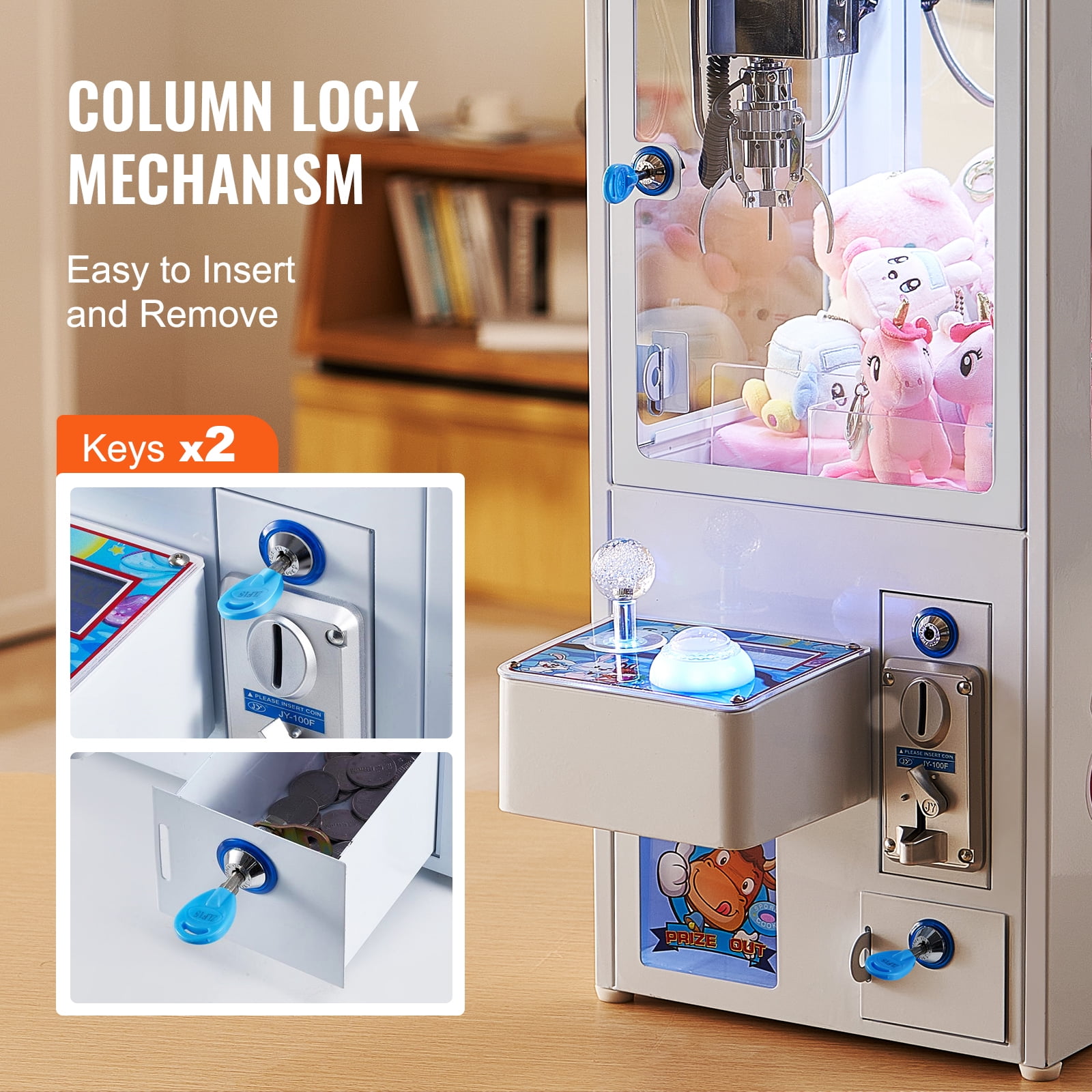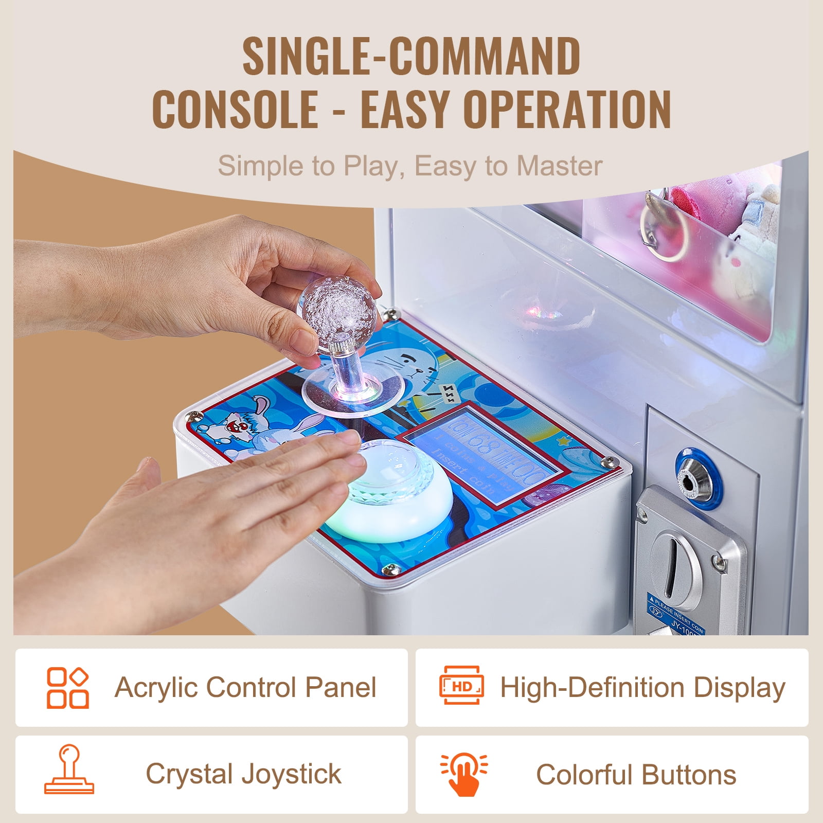 PREMIUM QUALITY MATERIAL: Anti-rust powder-coated iron case and transparent glass window give you more stable and more clear vision, cultivating fine motor skills. ADJUSTABLE COIN COLLECTOR: Ease to operate intelligent coin device, adjusting different money insert mode you like, providing several tokens and key. You can set 1 coin for 1 play or 2 coins for 1 play, etc. Default: 1 coin for 1 play. COMFORT AND SAFE: Wear-resistant and 7-colors-flashing control bar with stable performance, arbitrary rotation allowed, delicate and comfortable hand feeling with high safety. You can set data remain mode in case of sudden electricity outage. STAINLESS STEEL CLAW: Shake-proof steel claw can move quickly with premium quality, no need to install, conducting self-adjustable grabbing power. WIDE APPLICATION: Suit for arcade game center, hotel, home, holiday celebrations, KTV, etc. Playing game settable within 30 seconds. 6 kinds of prize-winning-chances mode to select, giving you endless fun. Note: 1. Please cut off the Cable Tie that strapping the claw before starting up the machine!!! 2. For more functions, please check our user manual. This machine doesn’t accept paper money.