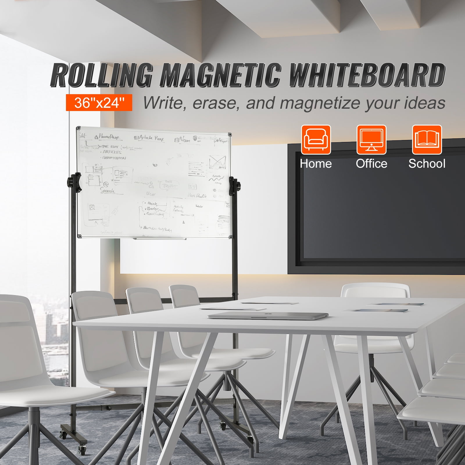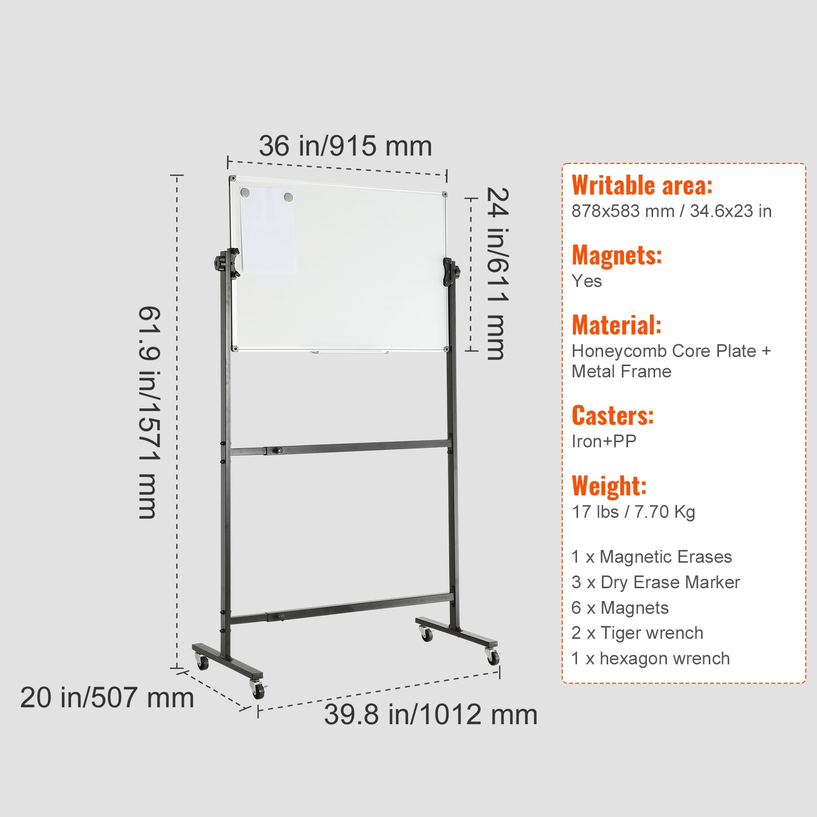 Product Description Unleash Your Creativity with KFFKFF Rolling Magnetic Whiteboard Experience the ultimate writing surface with the KFFKFF rolling dry erase board. This versatile board features a double-sided writing area, allowing you to maximize your productivity. The premium surface ensures silky smooth writing and effortless wiping, making it ideal for any workspace, classroom, or meeting room. With its height and angle adjustable design, you can customize the board to suit your needs and comfort. Built to last, the KFFKFF rolling whiteboard is both durable and stable, providing a reliable platform for your ideas. It comes with everything you need to get started, so you can upgrade your collaboration game today. Let your thoughts take flight with the KFFKFF rolling magnetic whiteboard! Double the Writing Space Expand your creative potential with our double-sided magnetic board. With twice the writing area, you’ll have ample space to jot down your ideas, sketches, and plans. Seamless Writing Experience Experience effortless writing and erasing on our sleek magnetic board. Its smooth surface ensures a seamless writing experience, leaving no marks or residue behind. Rest assured, this board is designed to withstand prolonged use without warping, creasing, bubbling, or scratching. Customizable Height and Angle Achieve the perfect writing position with our height-adjustable whiteboard. Whether you’re a child or an adult, you can easily customize it to your preferred height and angle, ensuring optimal comfort and convenience. Effortless Mobility Enjoy the freedom to move your magnetic whiteboard effortlessly from one room to another. Equipped with four smooth-rolling casters, you can easily transport it while the reliable brake keeps it securely in place. Complete Set of Accessories Start using your KFFKFF rolling whiteboard right away with our bonus accessories. This comprehensive set includes two markers, one eraser, six magnets, and a convenient removable tray to keep everything organized. Versatile Tool for Various Settings Enhance your presentations, brainstorming sessions, teaching, or group collaborations with our versatile rolling dry erase board. From classrooms to offices to homes, this board is the perfect tool for any setting. Specifications Size: 61.9×39.8×20 in/1571x1012x507mm Whiteboard Area: 36×24 in/915×610 mm Writable Area: 34.6×23 in/878x583mm Magnets: Yes Material: Honeycomb Core Plate + Metal Frame Casters: Iron+PP Weight: 17 lbs/7.70 kg Package Content 1 x Magnetic Erases 3 x Dry Erase Marker 6 x Magnets 2 x Tiger Wrench 1 x Hexagon Wrench