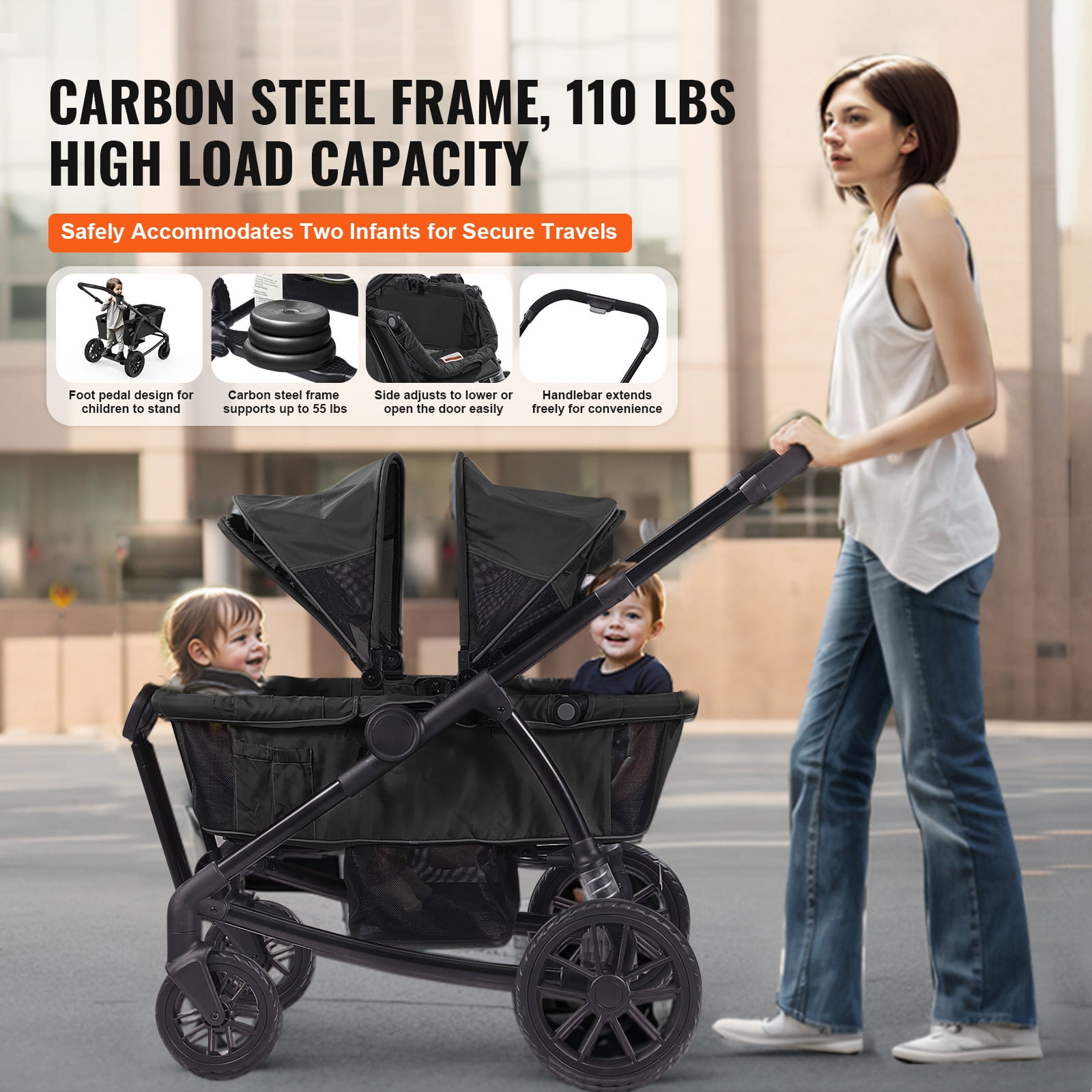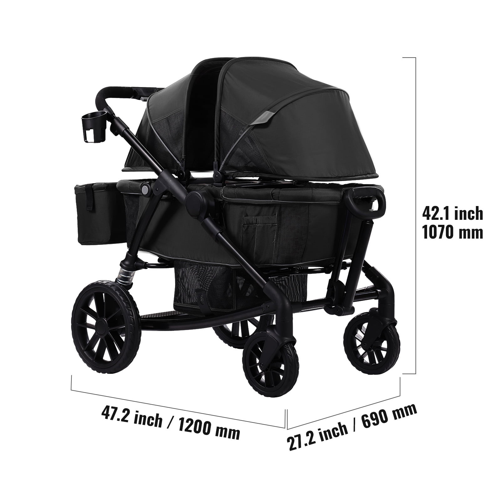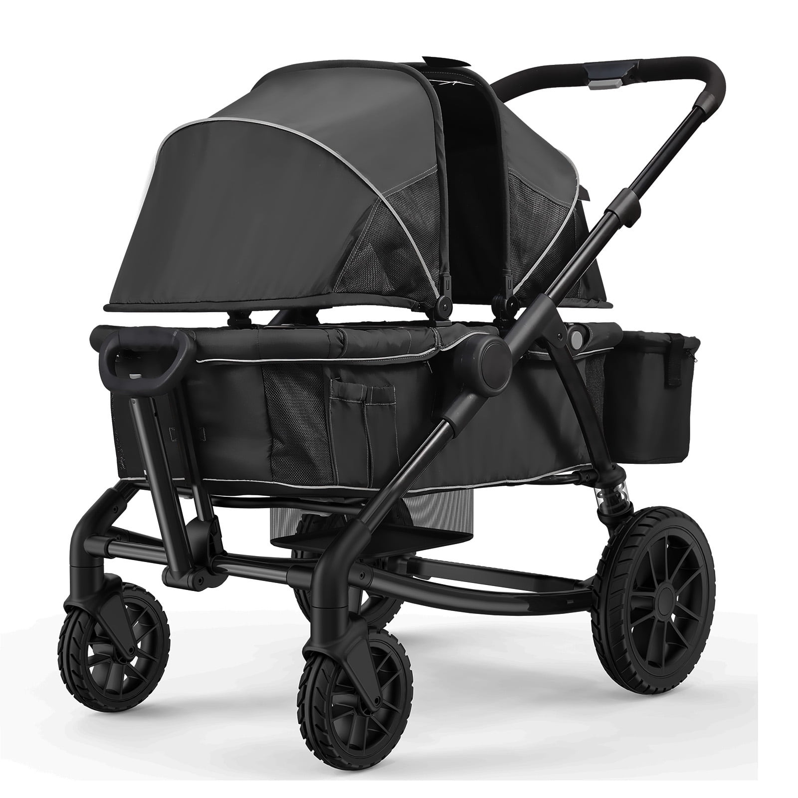 KFFKFF Multi-Terrain Wagon Stroller, Dual-Seating, Easily Foldable for Travel, Comes with Shade Cover, Storage for Parents, Food Tray & Beverage Holders, Supports up to 55lbs per Seat