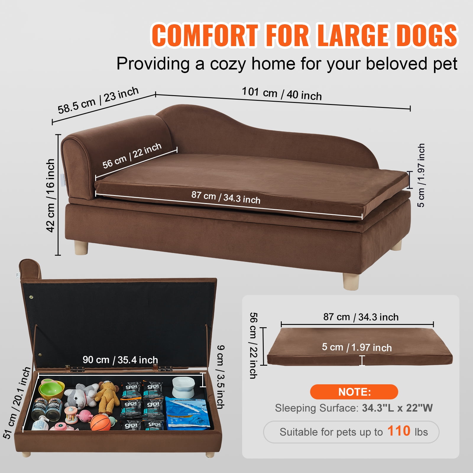 Spacious Comfort: Our pet sofa, measuring 36x23x16 inch, provides ample space for pets of all sizes, from Chihuahua to golden retrievers. Crafted with sturdy solid wood and plush fabric, it ensures durability and is perfect for multi-pet households. Reliable Load-Bearing: With a strong capacity of 110 lbs, KFFKFF dog sofa offers secure support for breeds like Labrador or lively Rottweilers, giving your pets a safe retreat. High-Quality Materials: The scratch-resistant soft velvet surface of this dog sofa bed is easy to clean, allowing pets to rest comfortably while reducing your cleaning efforts. The interior is filled with high-density sponges to support your pet’s joints and promote their well-being. Stylish and Practical: Our dog sofa couch is not just a pet accessory, it effortlessly complements your home decor. The smart design includes storage cabinets to free up space, while its appearance seamlessly blends with any interior style. Easy to Assemble: The brown dog bed couch can be easily installed without complicated steps. It can be set up by one person and is suitable for various places, such as your living room, bedroom, pet store, or clinic, enhancing your pet’s quality of life.