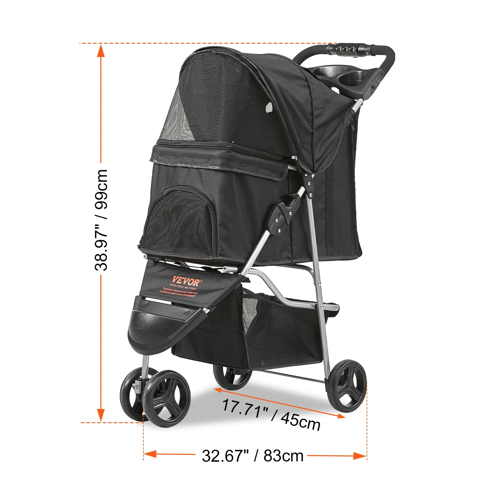 Product Description KFFKFF pet stroller, move your furry friend! This is a stroller designed for your beloved pet. It features a rugged alloy frame and large EVA wheels to ensure a stable and smooth ride. The rugged 600D Oxford fabric is scratch and bite resistant, and the one-click easy folding design allows for convenient storage, making your travel easier. This stroller not only meets the needs of you and your pet, but also provides a hassle-free travel experience. Alloy Frame Designed specifically for pet travel, this pet cart features a premium alloy frame to ensure strength, support up to 35 pounds of weight, stability and safety. With a rust-resistant coating on the surface for extended life and durability, it brings comfort and safety to your pet, whether it’s a leisurely walk in the park or a long trip. Flexible EVA Large Wheels Our pet strollers have large EVA wheels of 6 inches front and 6 inches back, suitable for all kinds of terrain, wear resistant and shock absorbing, ensuring smooth driving and easy coasting. 360° rotation dual front wheels can move forward in a fixed direction, but also easily rotate, providing more flexible and convenient maneuvering operation. The rear wheel is designed with a braking system that fully protects you and your pet, and can be locked immediately with a light touch of the brake for easy operation and emergency response. Intimate and Friendly Design The front pedals of our strollers are designed to accommodate many older or less mobile pets, making it easy to get in and out of the stroller. By unzipping the front mesh window, you can feed your pet or let the pet in and out by itself. The cart handle comes with a cup holder and tray to hold water bottles and other items. Large capacity storage basket at the bottom with plenty of space for your pet’s essential supplies. The whole pet cart uses Velcro design, simple operation, the cart handle can be rotated, and can be adjusted according to needs to meet various travel needs. Comfortable and Breathable Our pet stroller is made of high quality and strong 600D Oxford fabric, waterproof and wear-resistant, durable and reliable, no matter how your pet scratches inside, it can guarantee a longer durability, so that your pet is safe and comfortable, and increase the use of time. Retractable canopy can effectively shelter pets from the sun and wind and rain. Multiple breathable mesh Windows can not only give your pet a wider panoramic view, but also provide good air circulation, avoid mosquito bites, so that pets in the car more comfortable, spacious car basket to increase the comfort of pets, but also allow you to monitor the condition of pets at any time. Easy Folding Pet strollers fold up quickly in just three simple steps. Whether it’s the corner of your home, or the trunk of your car, it can be easily placed, and its compact design saves space and brings unparalleled convenience to your life. With a net weight of 9.81 pounds, the cart is lightweight and easy to carry, making every trip easy and enjoyable. Durable Zipper This pet stroller features a single-ended zipper design to ensure stability, durability and fast operation. This high quality zipper not only improves the overall durability of the stroller, but also greatly reduces the risk of pet escape, providing double security for you and your pet’s travel. Well constructed and equipped with seat belts, you can fully protect your pet’s riding safety. Specifications Item Model Number: DTC-803 Style: Standard – 3 Wheels (Front Double, Rear Single) Color: Black Weight Capacity: 35 lbs/16 kg Fabric Material: 600D Oxford Fabric Mesh Window Material: Nylon Wheel Material: EVA Front Wheel Size: 6″ Rear Wheel Size: 6″ Brake Type: Single-wheel brake (rear wheel) Frame Material: Alloy Pipe Bottom Plate Material for Basket: Fiberboard Product Weight: 9.81lbs/4.45kg Package Content 1 x Pet Stroller 2 x Rear Wheel Covers 2 x B-Type Clips 1 x User Manual 5 x Screws