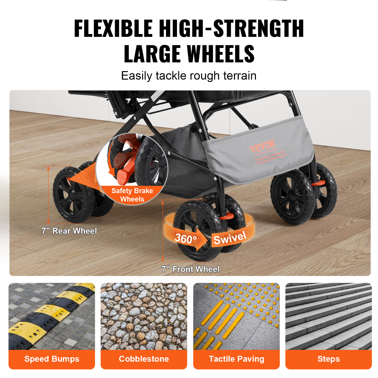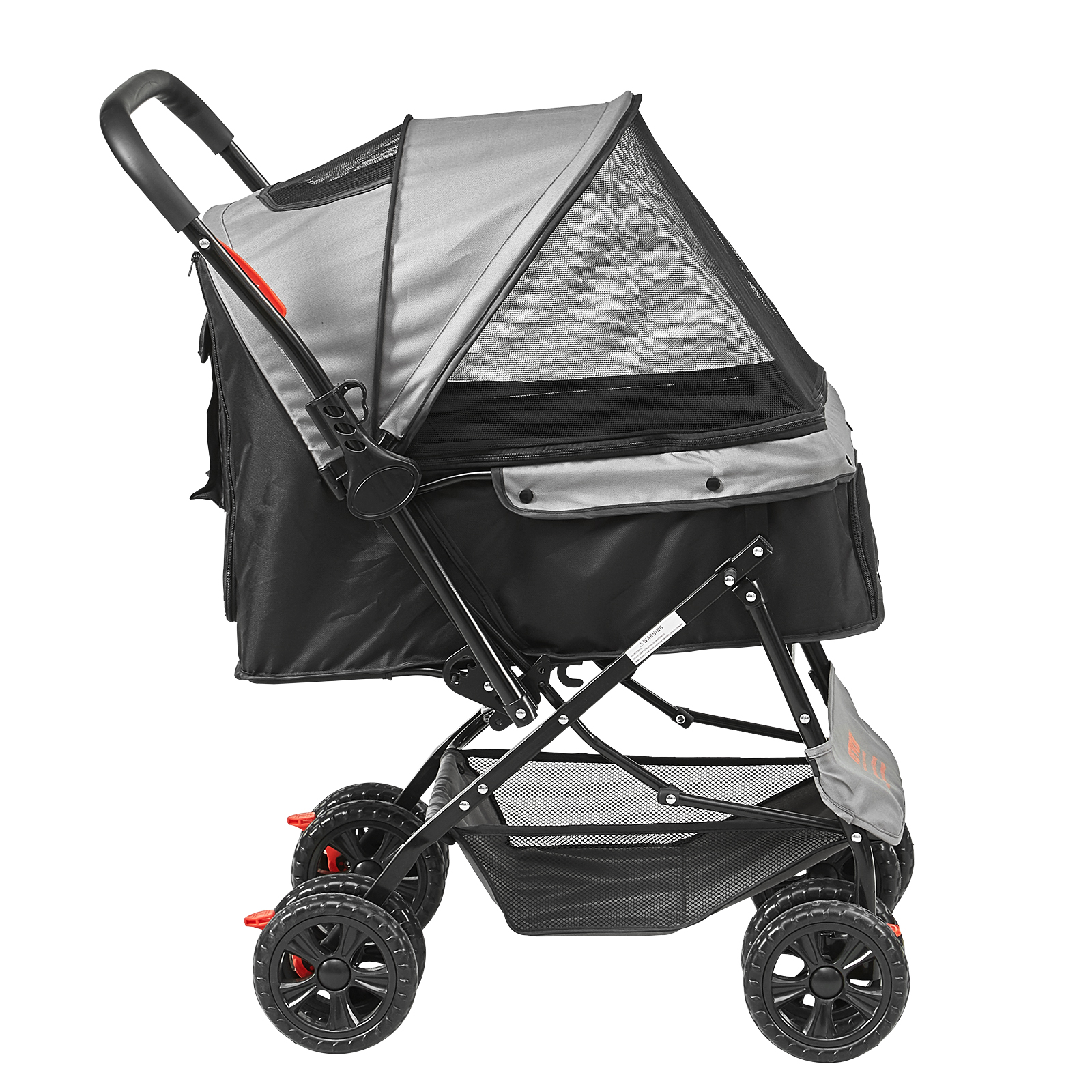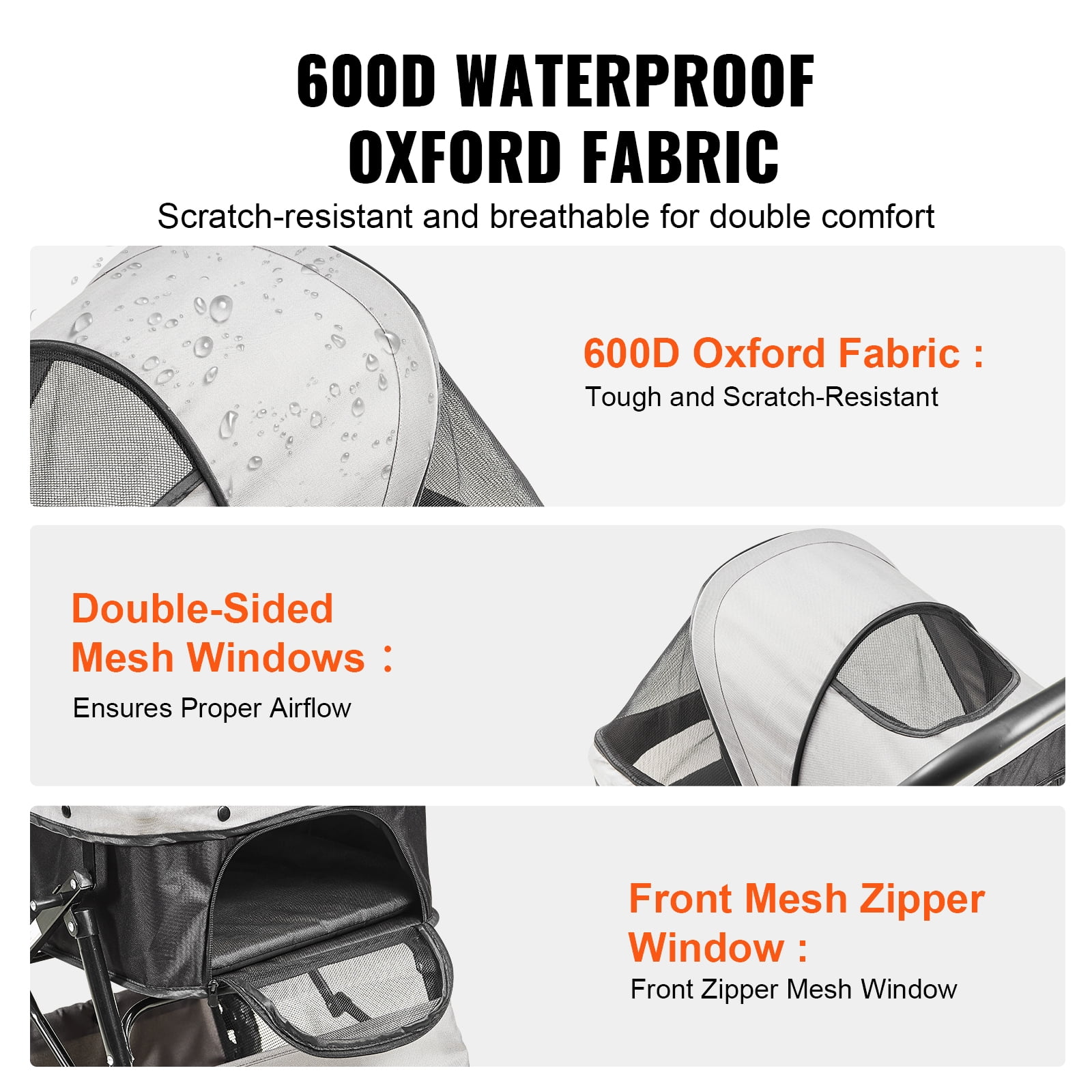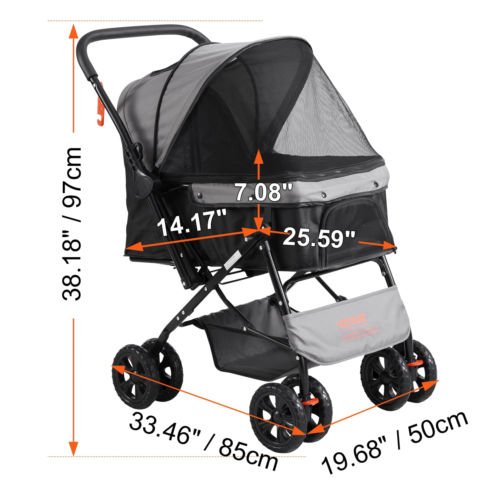 Product Description KFFKFF pet stroller, move your furry friend! This is a stroller designed for your beloved pet. It features a rugged aluminum frame and large EVA tires to ensure a stable and smooth ride. The all-directional breathable design and reversible handle guarantee your pet’s comfort and freedom. The rugged 600D Oxford fabric is scratch and bite resistant, and the one-click easy folding function allows for easy storage, making your travel more convenient. This stroller not only meets the needs of you and your pet, but also provides a hassle-free travel experience. Alloy Frame Designed for pet travel, this pet stroller features an alloy frame to ensure strength and effortlessly supports weights up to 44 pounds. The surface is coated with powder to prevent rust and extend service life, ensuring that every outing is a pleasant experience for you and your pet. Processing Reversal Our pet strollers can easily adjust the handle orientation with a simple handle switch, allowing you to interact with your pet face to face, creating a sense of intimacy and rapport on every outing. Adapt effortlessly to facing your pet and enjoy uninterrupted company. Open the front mesh window zipper, convenient for you to feed the pet, open the rear zipper, you can more easily view the pet in the car. Small bags designed to hold your mobile phone and other small items. EVA Big Wheel Our pet strollers have large EVA wheels of 7 “front and 7″ rear, suitable for all kinds of terrain, wear resistant and shock absorbing, ensuring smooth driving and easy coasting. 360° rotation dual front wheels can move forward in a fixed direction, but also easily rotate, providing more flexible and convenient maneuvering operation. The rear wheels are designed with a reliable braking system that fully protects you and your pets, and can be locked immediately with a light touch of the brake for easy operation and emergency response. Comfortable and Breathable Our pet stroller is made of high quality and strong 600D Oxford fabric, waterproof and wear-resistant, durable and reliable, no matter how your pet scratches inside, it can guarantee a longer durability, so that your pet is safe and comfortable, and increase the use of time. Retractable canopy can effectively shelter pets from the sun and wind and rain. Multiple breathable mesh Windows can not only give your pet a wider panoramic view, but also provide good air circulation, avoid mosquito bites, so that pets in the car more comfortable, spacious car basket to increase the comfort of pets, but also allow you to monitor the condition of pets at any time. Easy Folding Pet strollers fold up quickly in just three simple steps. Whether it’s the corner of your home, or the trunk of your car, it can be easily placed, and its compact design saves space and brings unparalleled convenience to your life. Large storage basket at the bottom, with plenty of space for you and your pet’s travel essentials, and more storage space. Our pet strollers are easy to assemble and come with an assembly manual to save time. Durable Zipper We have adopted a single-ended zipper design to ensure stability, durability and fast operation. This high quality zipper not only improves the overall durability of the stroller, but also greatly reduces the risk of pet escape, providing double security for you and your pet’s travel. Well constructed and equipped with seat belts, you can fully protect your pet’s riding safety. Specifications Item Model Number: DTC-608 Style: Standard – 4 Wheels (Front Double, Rear Double) Color: Black+ Grey Weight Capacity: 44 lbs/20kg Fabric Material: 600D Oxford Fabric Mesh Window Material: Nylon Wheel Material: EVA Front Wheel Size: 7″ Rear Wheel Size: 7” Brake Type: Single-wheel brake (rear wheel) Frame Material: Alloy Pipe Bottom Plate Material for Basket: Fiberboard Product Weight: 6kg/13.221 lbs Package Content 1 x Pet Stroller 1 x User Manual