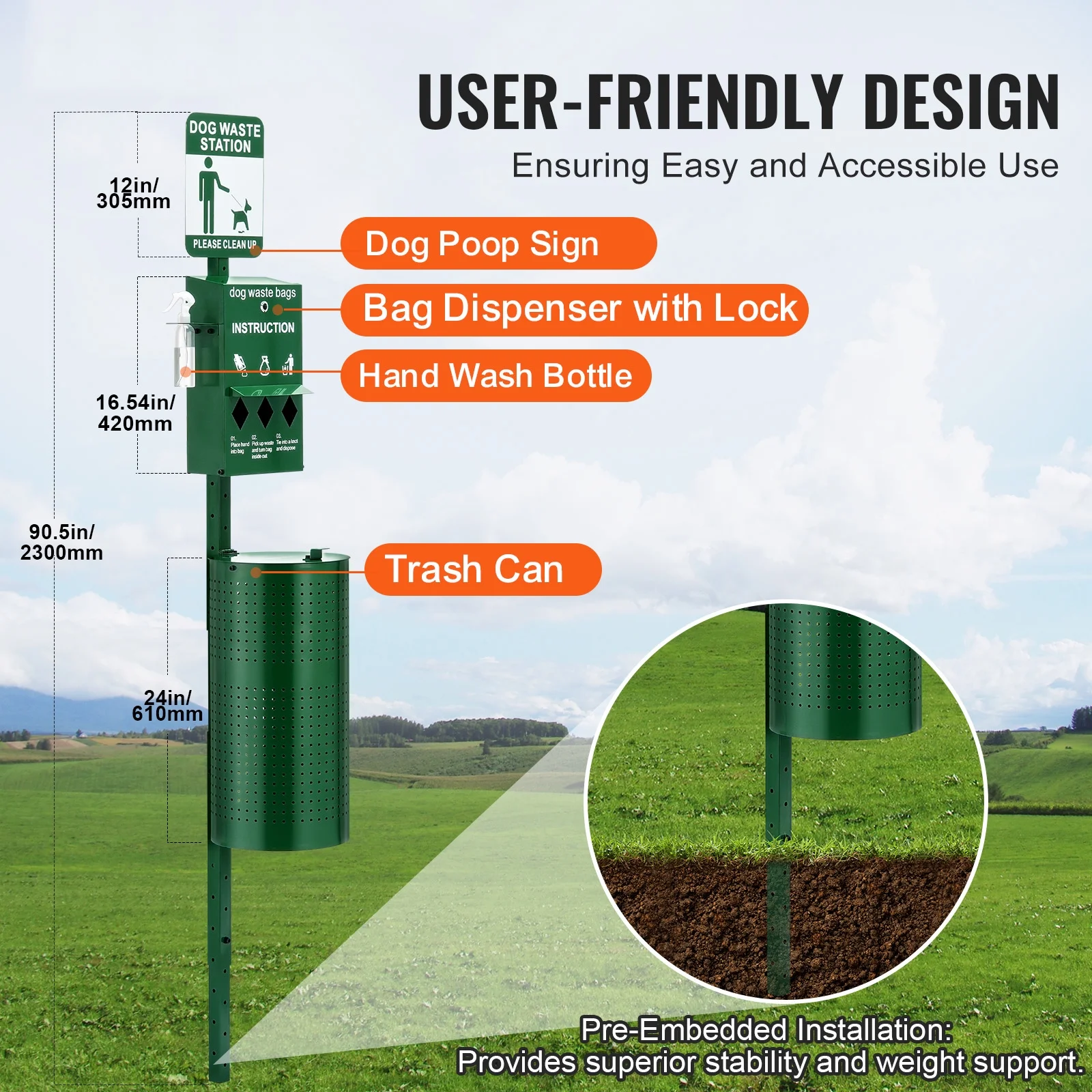 Convenient and Efficient: The KFFKFF dog waste station offers a hassle-free solution for handling dog waste. It includes a trash can, a lockable bag dispenser, and signage, along with a hand wash bottle for a quick three-step process. Large-Capacity Trash Can: With an 11.5-gallon capacity, this dog poop station minimizes the need for frequent emptying. It is perfect for multi-pet households or commercial settings. Complete Waste Disposal System: Our KFFKFF dog waste station comes with 600 additional waste bags, 50 liner bags, and extra keys, ensuring you have everything you need for long-term use. Easy Installation: Designed for outdoor use, this dog poop station features an in-ground installation design that is suitable for various environments. All necessary screws and tools are included, along with a user-friendly manual for straightforward setup. Durable and Reliable: Made from high-strength, galvanized steel, the KFFKFF pet waste station is built to withstand the test of time. It provides outstanding quality and reliable waste disposal for years to come.