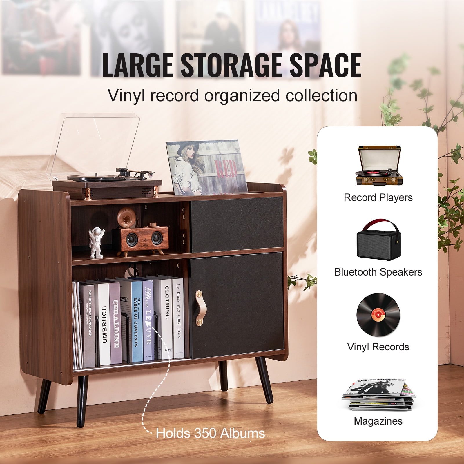 Maximize space utilization with a spacious tabletop and open storage rack, organizing up to 350 albums. Flexible storage options with a sliding door design to categorize and organize your music treasures. Additional protection for your collection with dividers on the bottom to prevent tipping or crushing of records. Aesthetic appeal and durability with retro brown panels, solid wood support legs, and long-lasting use. Versatile functionality as a nightstand, side table, coffee table, or decorative piece in your room.