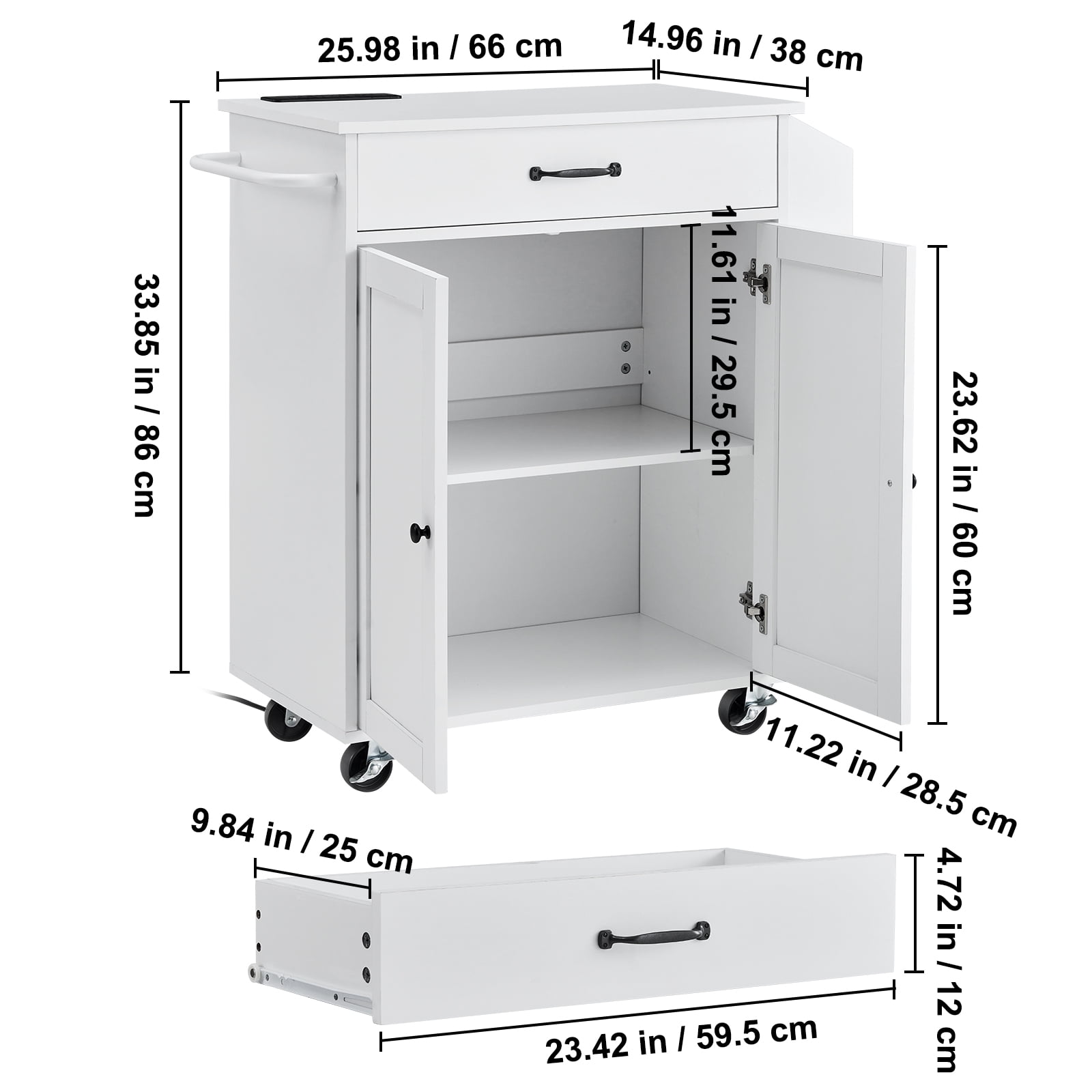 Product Description Kitchen Island with Charging Station Upgrade your kitchen with the KFFKFF Kitchen Island. This multifunctional piece offers abundant room for all your cooking endeavors. It boasts a built-in power strip comprising of three outlets and a long power cord, guaranteeing hassle-free charging for a range of kitchen gadgets. KFFKFF Charging Station Kitchen Island Revamp your culinary experience with this expansive kitchen island. Featuring a power strip equipped with three outlets and an extended power cord, this island provides convenient charging options for a wide range of kitchen appliances. Ample Storage Solution Discover the epitome of convenience with this kitchen island’s abundant storage choices. With drawers, cabinets, a spice rack, and a towel bar, effortlessly organize and store cutlery, bowls and plates, cookware, and even toasters. User-Friendly and Portable Effortlessly transport or secure this kitchen cart with its four 360-degree rotating wheels, two of which can be locked. The adjustable shelves offer flexible storage space, while the integrated charging station ensures convenience at your fingertips. Sturdy Construction Constructed from premium particle board, medium-density fiberboard, and robust metal, this kitchen island boasts a solid structure and impressive load-bearing capacity. The sleek surface allows for effortless cleaning—simply wipe away dust and light stains with a cloth. Sleek and Elegant Indulge in the refined design of this sophisticated kitchen island, offering a unique aesthetic experience. With effortless assembly, enjoy the convenience it brings without any hassle. Limitless Possibilities Beyond its functionality as a kitchen cart, this versatile island can also serve as a kitchen dining bar, coffee bar, or find its place in hotels or bakeries. Specifications Item Model Number: YS23354ss Color: White Product Weight: 50 lbs / 22.6 kg Product Dimensions: 32x15x34 inch / 810x380x860 mm Package Content 1 x Kitchen Island 1 x Set of Accessories