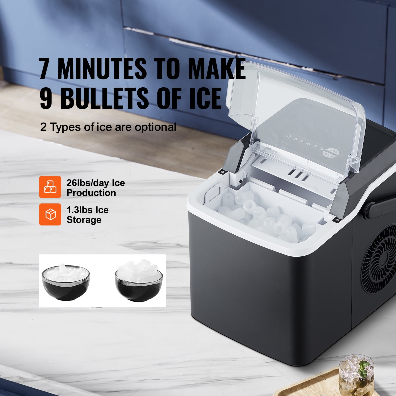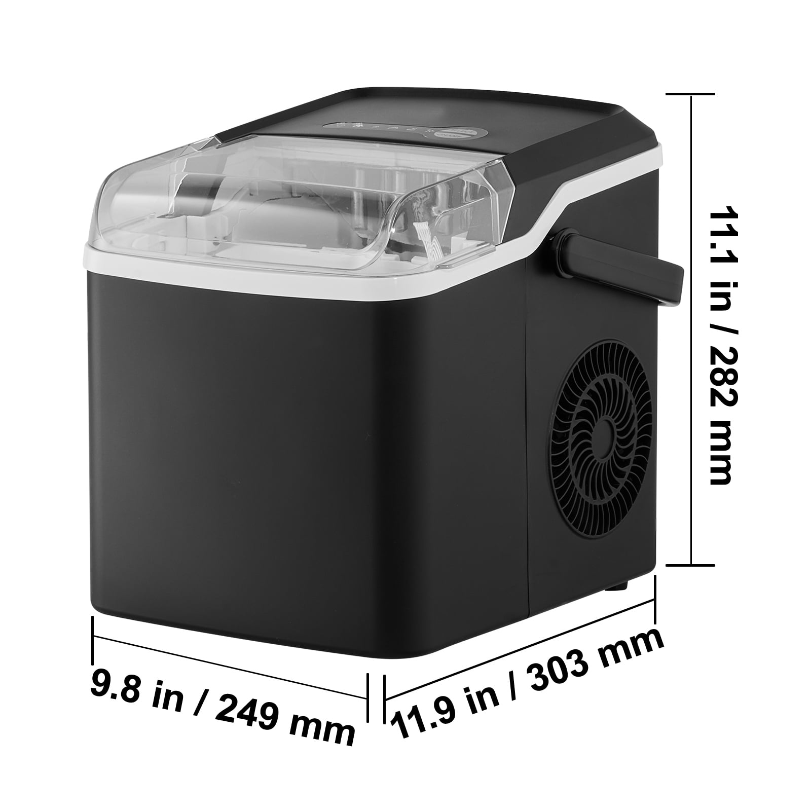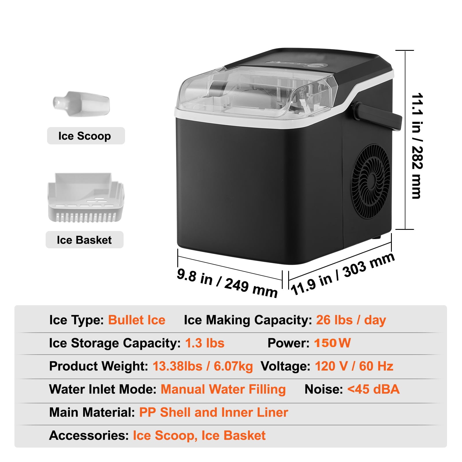 Product Description Portable Ice Maker Are you ready for some ice cube refreshment? This portable ice maker produces 26 pounds of ice every 24 hours (tested at 70 ? and 59 ? inlet water temperature) and has 9 cubes ready in 7 minutes. It has a capacity of 1.3 pounds, making it easy to carry to parties and picnics. Enjoy clean ice anytime! Hands-free Cleaning To activate automatic cleaning mode, press and hold the cleaning button for approximately 3 seconds. This will start an 8-minute cleaning cycle. Then, remove the drain pipe and open the drain plug to drain the sewage. This cleaning mode automatically cleans the interior and gives you a break. Compact & Portable The ice machine is lightweight and has a total weight of only 13.38 pounds, making it easy to carry and portable. Easily carried with just one hand. Upgrade Compressor The 105w low-power Huayi brand compressor can make ice production more effective, and the noise level is no more than 45dbA. Incredible Ice-making Speed This ice cube maker can produce 26 pounds in 24 hours, and you can get 9 ice cubes in just 7 minutes. You can enjoy ice-cold ice cubes anytime and never have to worry about running out of ice cubes. Clean & Safe The countertop ice maker has a self-cleaning function that can flush away dirt in the inner container in just 8 minutes. Made of PP material, BPA-free and food-grade certified. Excellent Heat Preservation The portable ice maker features a 2.5mm foam layer, stainless steel shell, and triple-layer insulation to keep ice cubes for over 8 hours when the power goes out. Specifications Item Model Number: IMB1000-UL Ice Type: Bullet Ice Ice Making Capacity: 26lbs/day Ice Storage Capacity: 1.3lbs Power: 105W Voltage: 120V/60Hz Product Weight: 13.38lbs / 6.07kg Product Size: 11.9″ x 9.8″ x 11.1″ / 303 x 249 x 282 mm Water Inlet Mode: Manual Water Filling Noise: <45dBA Main Material: PP Shell and Inner Liner Package Content 1 x Ice Maker 1 x Ice Scoop 1 x Ice Basket