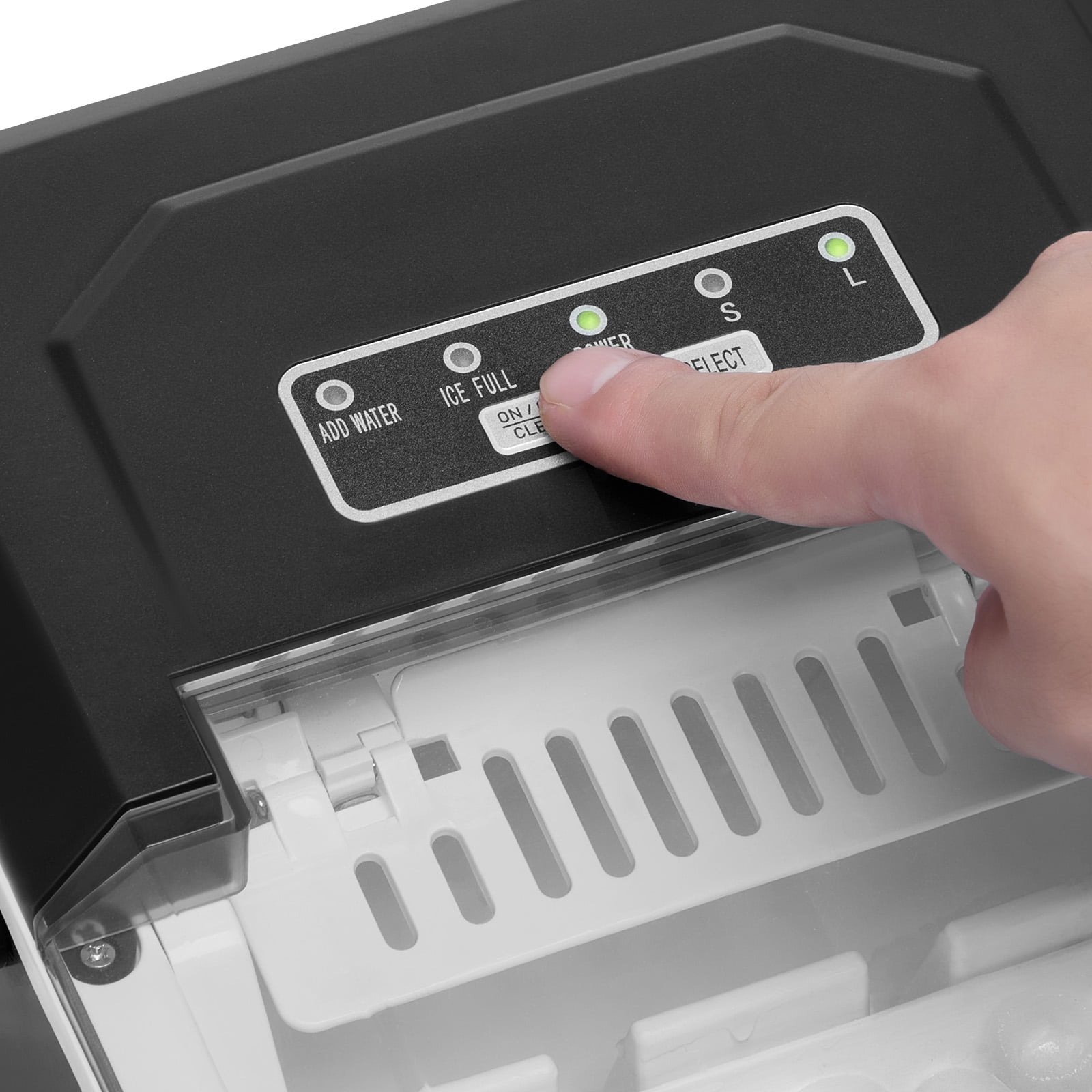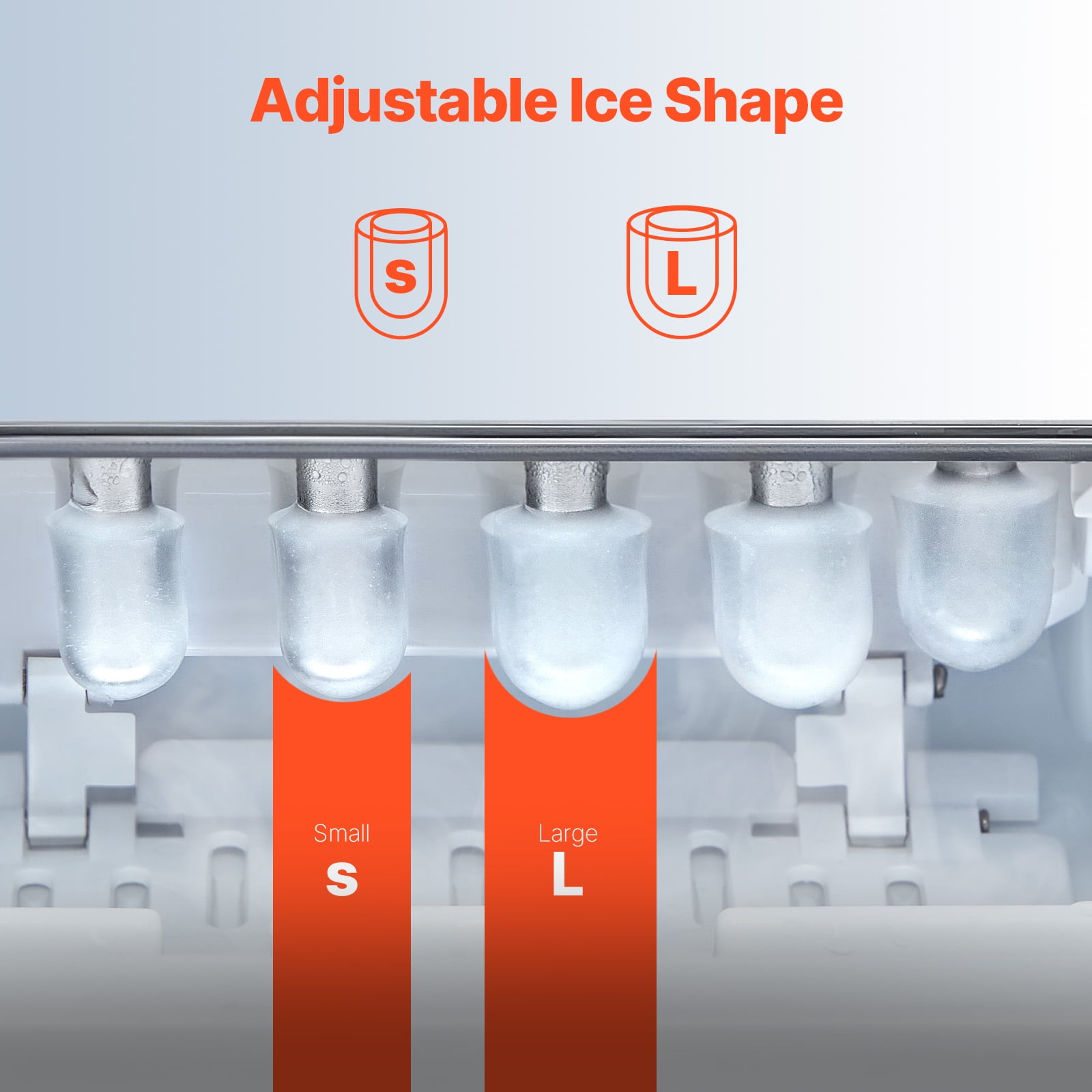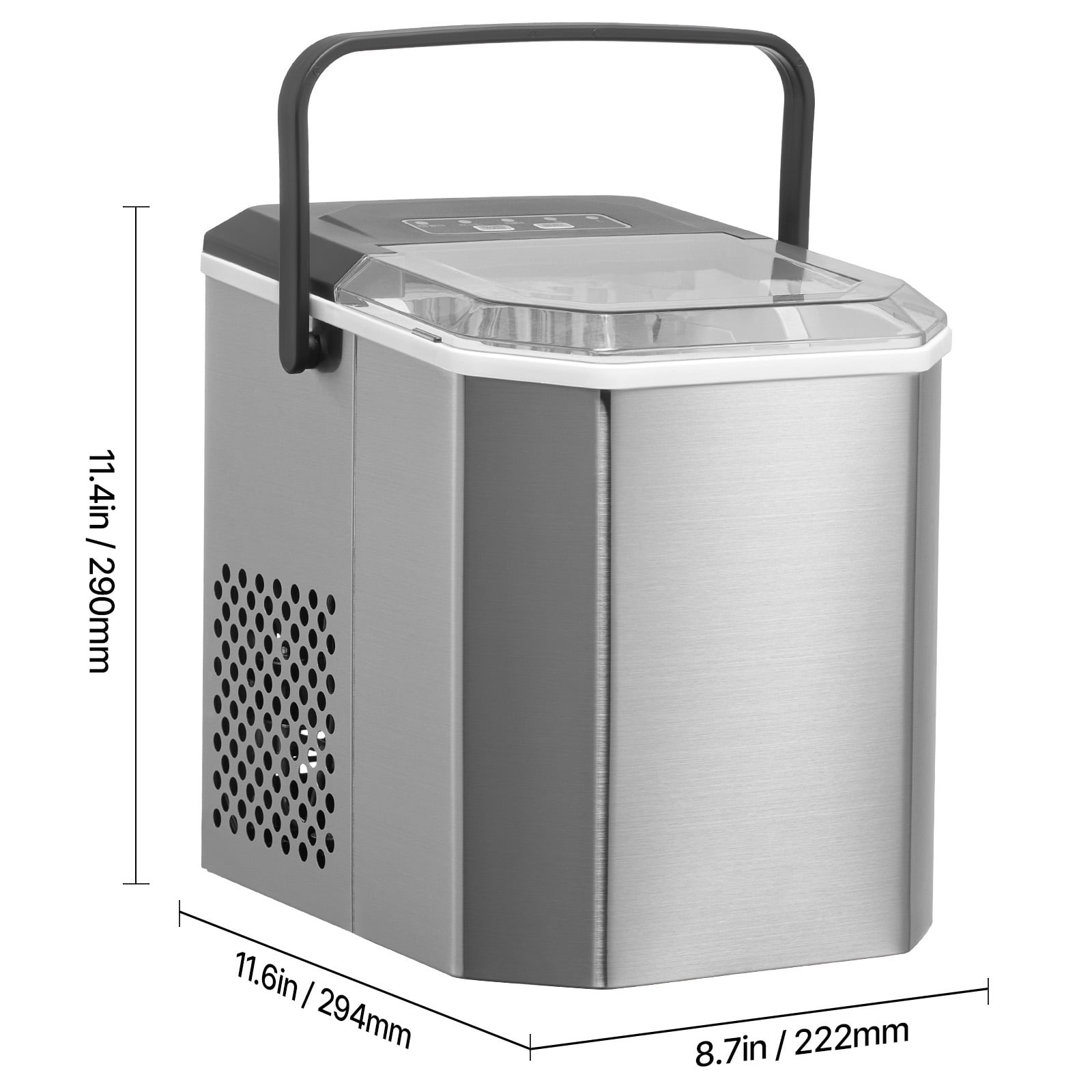 Product Description Portable Ice Maker Are you ready for some ice cube refreshment? This portable ice maker produces 26 pounds of ice every 24 hours (tested at 70 degrees Fahrenheit and 59 degrees Fahrenheit inlet water temperature) and has 9 cubes ready in 7 minutes. It has a capacity of 1.8 pounds, making it easy to carry to parties and picnics. Enjoy clean ice anytime! Hands-free Cleaning To activate automatic cleaning mode, press and hold the cleaning button for approximately 3 seconds. This will start an 8-minute cleaning cycle. Then, remove the drain pipe and open the drain plug to drain the sewage. This cleaning mode automatically cleans the interior and gives you a break. Compact & Portable The ice machine is lightweight and has a total weight of only 18.16 pounds, making it easy to carry and carry. Easily carried with just one hand. Upgrade Compressor The 105w low-power Huayi brand compressor can make ice production more effective, and the noise level is no more than 45dbA. Incredible Ice-making Speed This ice cube maker can produce 26 pounds in 24 hours, and you can get 9 ice cubes in just 7 minutes. You can enjoy ice-cold ice cubes anytime and never have to worry about running out of ice cubes. Clean & Safe The countertop ice maker has a self-cleaning function that can flush away dirt in the inner container in just 8 minutes. Made of PP material, BPA-free and food-grade certified. Excellent Heat Preservation With a 2.5mm foam layer and three layers of insulation material, the ice cubes can be stored for more than 8 hours in the event of a power outage. Specifications Item Model Number: IM2102ADT-UL Ice Type: Bullet Ice Ice Making Capacity: 26lbs/day Ice Storage Capacity: 1.8lbs Power: 105W Voltage: 120V/60Hz Product Weight: 18.16lbs / 8.24kg Product Size: 12.2″ x 9.05″ x 12.79″ / 310 x 230 x 325 mm Water Inlet Mode: Manual Water Filling Noise: <45dBA Main Material: 430SUS Shell and PP Inner Liner Package Content 1 x Ice Maker 1 x Ice Scoop 1 x Ice Basket