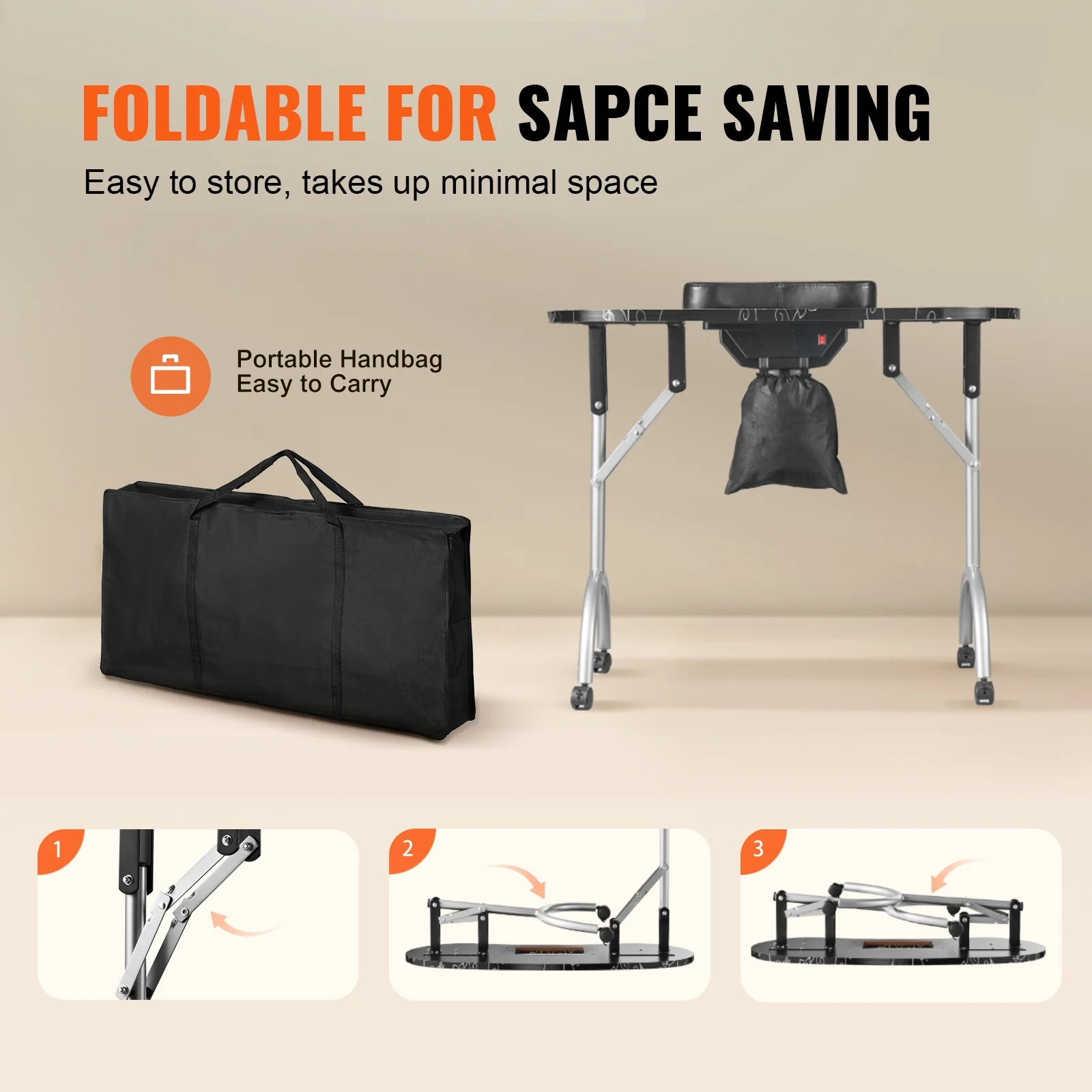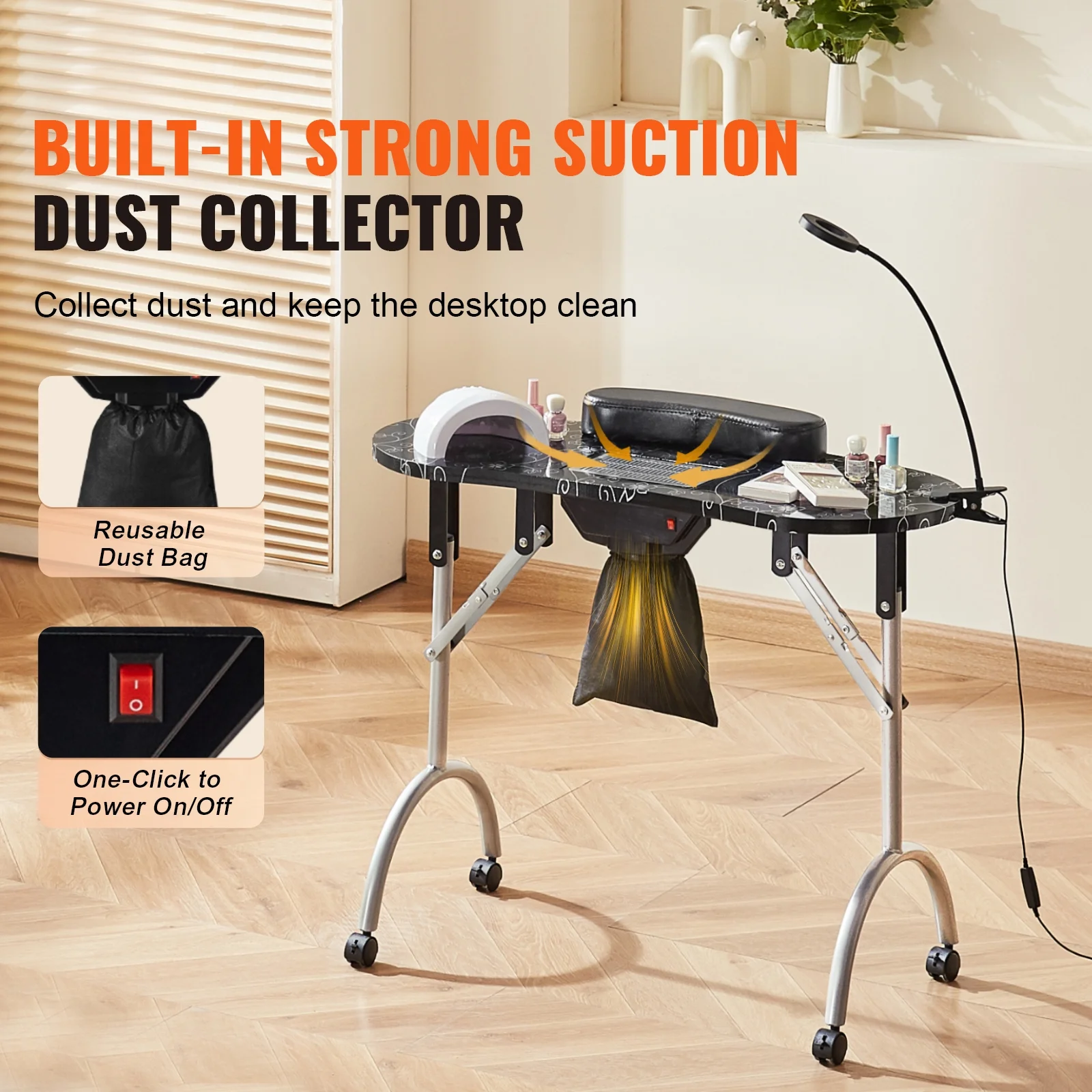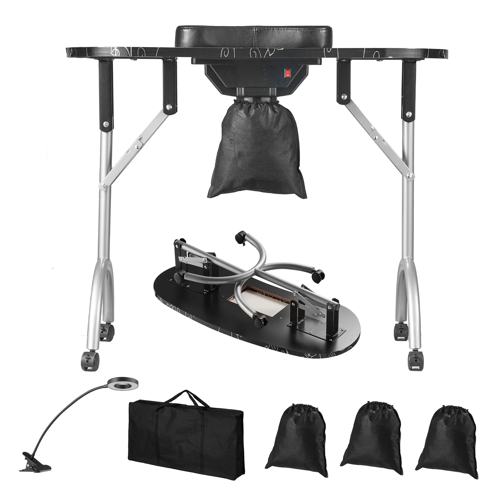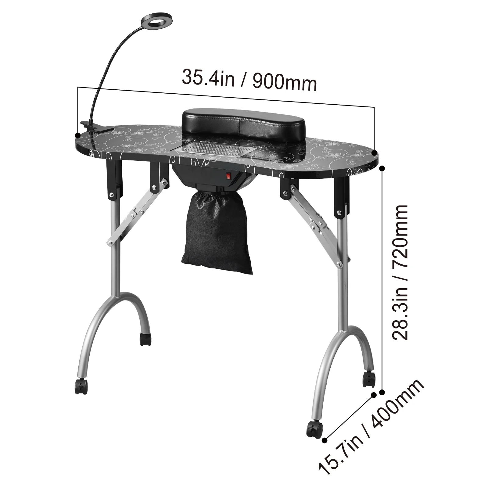 Product Description KFFKFF Manicure Table Elevate manicure experience with KFFKFF foldable manicure table, designed to meet your nail art needs in convenience. With powerful electric dust collector, one-click operation, ample storage space, easy folding, and high quality material, it is the go-to choice for salons or personal use at home. High Quality MDF Crafted from premium MDF, our manicure table ensures water and bending resistance, and is free from odors, creating a safe and healthy workspace. With easy cleaning and maintenance, you can focus on providing top-notch manicure services without worrying about cleanup hassles. Easy Folding Effortlessly fold it away when not in use for compact storage, making it perfect for small spaces or on-the-go nail technicians. With the included bag, transporting your manicure table is a breeze, ensuring convenience wherever your beauty services take you. 10 Levels of Brightness With 48 LED beads, our makeup dressing station nail desk provides clear visibility of nail details. You can choose from 3 color temperatures (warm light, warm white light, and cool light), along with 10 levels of brightness adjustment, ensuring optimal lighting effects. High Comfort Customer comfort is paramount. Our manicure table is designed with comfort in mind. Featuring a high-comfort wrist rest, it effectively alleviates hand fatigue during nail arts, ensuring a relaxing and enjoyable manicure experience for every customer. Large Storage Space Ample storage space is crucial for manicure work! KFFKFF manicure table boasts high-capacity cabinets, serving as your “treasure chest” to effortlessly organize all your nail supplies, fulfilling nail tool storage needs and ensuring a tidy work area. Wide Applications Whether for commercial or home use, our manicure table is the perfect choice. Its multifunctional design caters not only to the needs of professional nail salons but also seamlessly transitions into a stylish decor piece for homes or offices. Specifications Item Model Number: MT-020F Color: Black Power: 6W Main Material: MDF (Medium-Density Fiberboard) Number of Wheels: 4 Net Weight: 22.0 lbs / 10 kg Product Dimensions: 35.4 x 15.7 x 28.3 in / 900 x 400 x 720 mm Package Content 1 x Carrying Bag 3 x Dust Bags 1 x Dust Collector 1 x LED Lamp 1 x Hand Pillow (Black) 1 x Fuse
