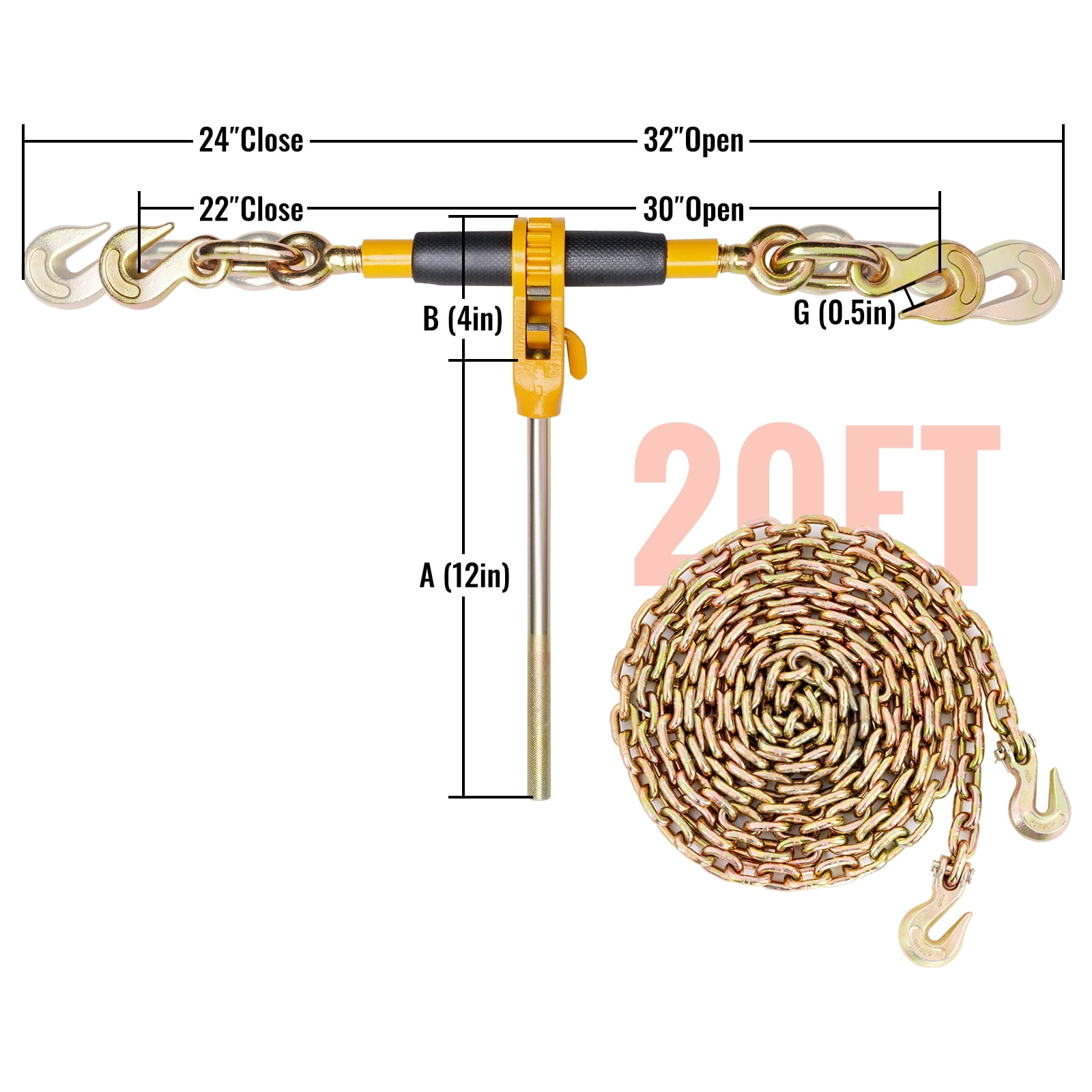 Labor-saving Operation: Get ready for enhanced length! 40 cm Long handles provide leverage, and ratchet handles increase leverage. The metal knurled handle and concave-convex texture rubber grip help achieve an anti-skid effect, which is comfortable to grip and easy to use. Built for Tough Jobs: The load binder hook is made of cast steel, providing a stronger load capacity. The surface is coated to prevent rust. Working Load Limit: 12000 lbs, Breaking Strength: 48000 lbs. Applicable to 3/8″ and 1/2″ chains. 3/8″ G80 Chain Working Load Limit: 7100 lbs, Breaking Strength: 28400 lbs. Store with Ease: Don’t worry about storing it. Storage complications are a thing of the past. The handle adopts a patented detachable structure, which can be stored in a narrow space of the truck by simply removing the handle. It is also applicable to freight car tighteners. Security is Our Priority: Properly rated with your security in mind, the binder features an anti-falling mark to safeguard your feet from being hit. The upgrade external switch design is more manpower-saving and will not pinch your hands. Forged grapple with 360-degree rotation ensures maximum durability and reliability. Applicable to Multiple Scenarios: Our ratchet binders are designed for securing loads in chain binding applications in transportation, industry, and agriculture, and for cargo holding in the marine industry, farm, and outdoor utilities. Meets all CVSA, DOT, NACM, and FMCSA requirements. Caution: this load binder is not designed or approved for overhead lifting.