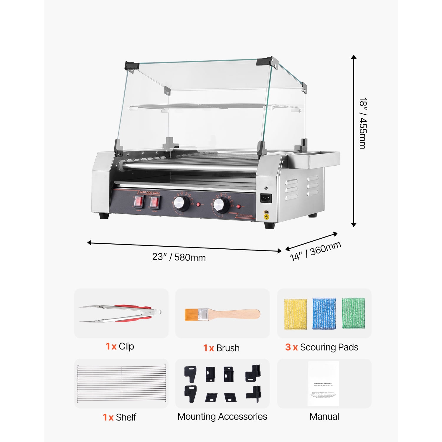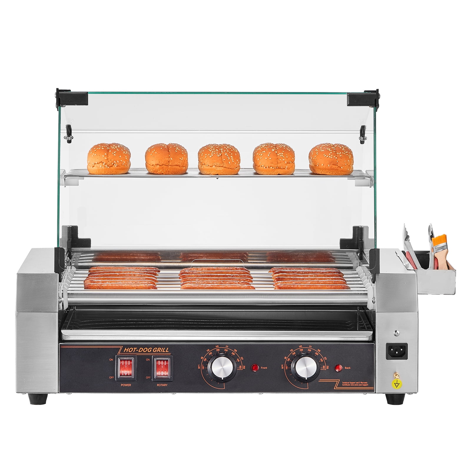 Grill Like a Pro: Our hot dog roller features a high-quality stainless steel grill, making it perfect for food stands, family parties, and barbecues. It is designed to cook a variety of hot dogs, sausages, and meatballs. Precise Temperature Control: Effortlessly adjust the cooking temperature up to 482°F with the two knobs. The left knob controls the front 3 rollers, while the right knob controls the back 4 rollers. Built to Impress & Last: Crafted with a durable and sleek stainless steel frame, our commercial hot dog roller not only offers a modern look but also ensures long-lasting performance. The glass hood keeps food warm, reduces cooking time, and the removable drip tray makes cleaning a breeze. 360-Degree of Flavor: Experience even cooking with the 360° rotation of the rollers on our hot dog roller grill. The powerful motor ensures efficient cooking, allowing you to prepare for round two in no time. Intimate Details: Our hot dog roller grill comes with a storage box for the brushes, clips, skewers, or gloves, helping you save the countertop space and keep your kitchen organized.