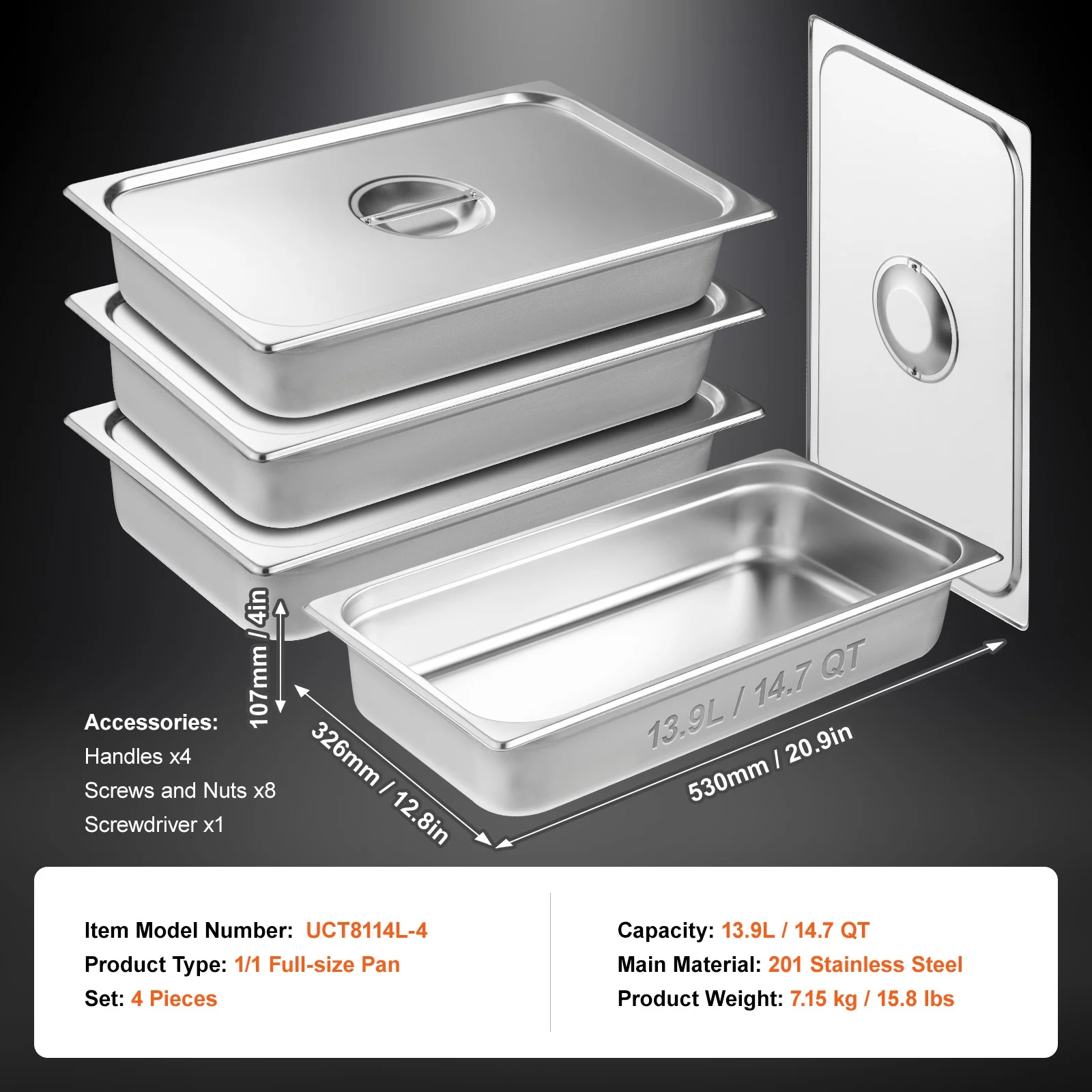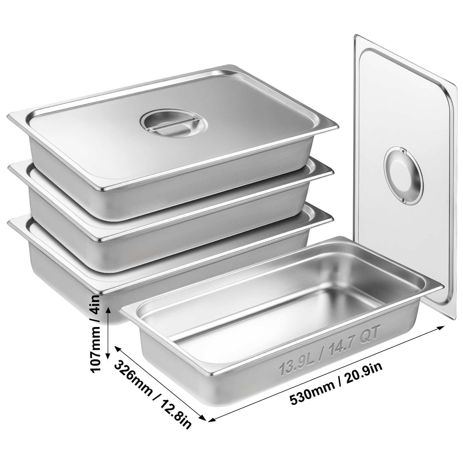 Product Description KFFKFF Steam Table Pan Introducing our KFFKFF steam pan, a versatile solution for food cooking, storage, and display. Crafted from premium food-grade stainless steel, this hotel pan is built to withstand high temperatures and freezing conditions. The smooth surface ensures effortless cleaning, saving you valuable time and effort. With its innovative stacked fascia design, this pan allows for easy disassembly and convenient stacking, while also enhancing the overall strength and durability. Experience the thoughtful details and superior quality of our KFFKFF steam table pan. High Capacity With a generous 4-inch depth, this set of 4 full-size pans offers ample space for cooking, storing, and displaying food. Say goodbye to limited capacity and hello to convenience. Heat and Cold Resistant Crafted from premium food-grade stainless steel, these KFFKFF hotel pans are built to withstand extreme temperatures. Whether you’re cooking in the oven, using a steam table warmer, or storing food in the freezer, these pans have got you covered. Robust and Long-lasting Featuring anti-stacking grooves, these stainless steel hotel pans are not only easy to separate when stacked, but they also boast enhanced structural strength. This design ensures their durability, making them a reliable choice for your kitchen needs. Effortless Cleaning Made from robust SUS201 stainless steel, these anti-jam pans are resistant to corrosion and rust. The smooth surface allows for easy cleaning with detergent, a simple cloth wipe, or even a high-temperature dishwasher. Spend less time scrubbing and more time enjoying your culinary creations. Versatile Usage Ideal for various foods including meats, vegetables, fruits, and even ice cream, these stainless steel table pans are perfect for a wide range of settings. Whether it’s your restaurant, salad bar, ice cream shop, or family gatherings, these pans will meet your needs with ease. Safety First The smooth and polished interior and exterior of these KFFKFF pans not only add a touch of elegance but also protect your hands from potential scratches. Cook and handle your food with confidence, knowing that safety is a top priority. Specifications Item Model Number: UCT8114L-4 Product Size: Full-size Pan Capacity: 13.9L / 14.7 QT Main Material: 201 Stainless Steel Product Weight: 7.15kg / 15.8 lbs Product Size: 530 x 326 x 107 mm / 20.9 x 12.8 x 4 in Package Content 4 x Steam Table Pans 1 x Set of Accessories