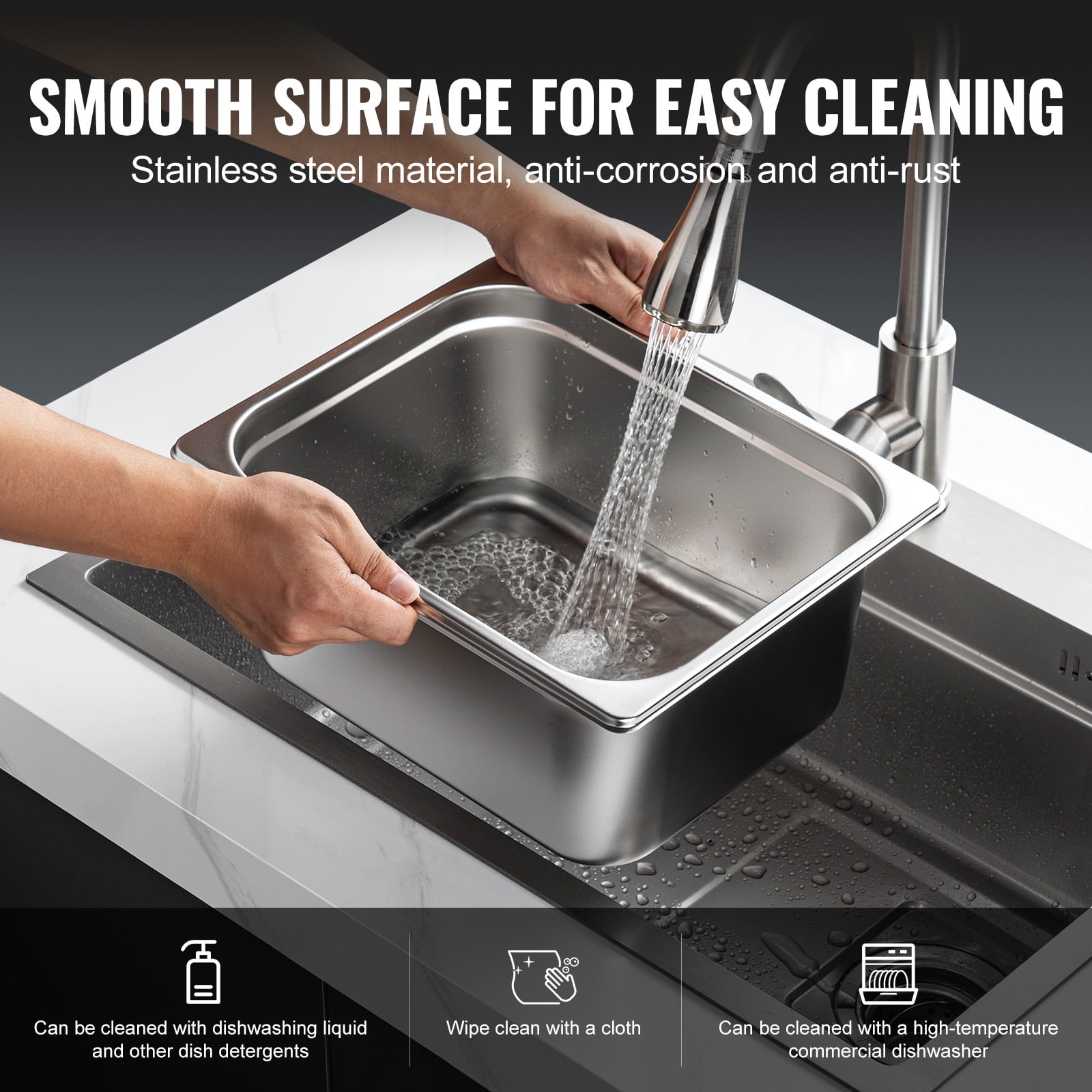 8-pack of 1/2-size steam table pans made from food-grade SUS201 stainless steel Ideal for holding meats, vegetables, fruits, ice cream, and more Can withstand temperatures from -40℃ to 260℃, suitable for refrigerators, freezers, ovens, and steam tables 0.8mm thick stainless steel construction for sturdiness, durability, and rust-resistance Unique anti-stacking groove design enhances structural strength Integrated design with no welding or gaps, smooth edge treatment for safety Easy to clean with detergent and cloth or dishwasher
