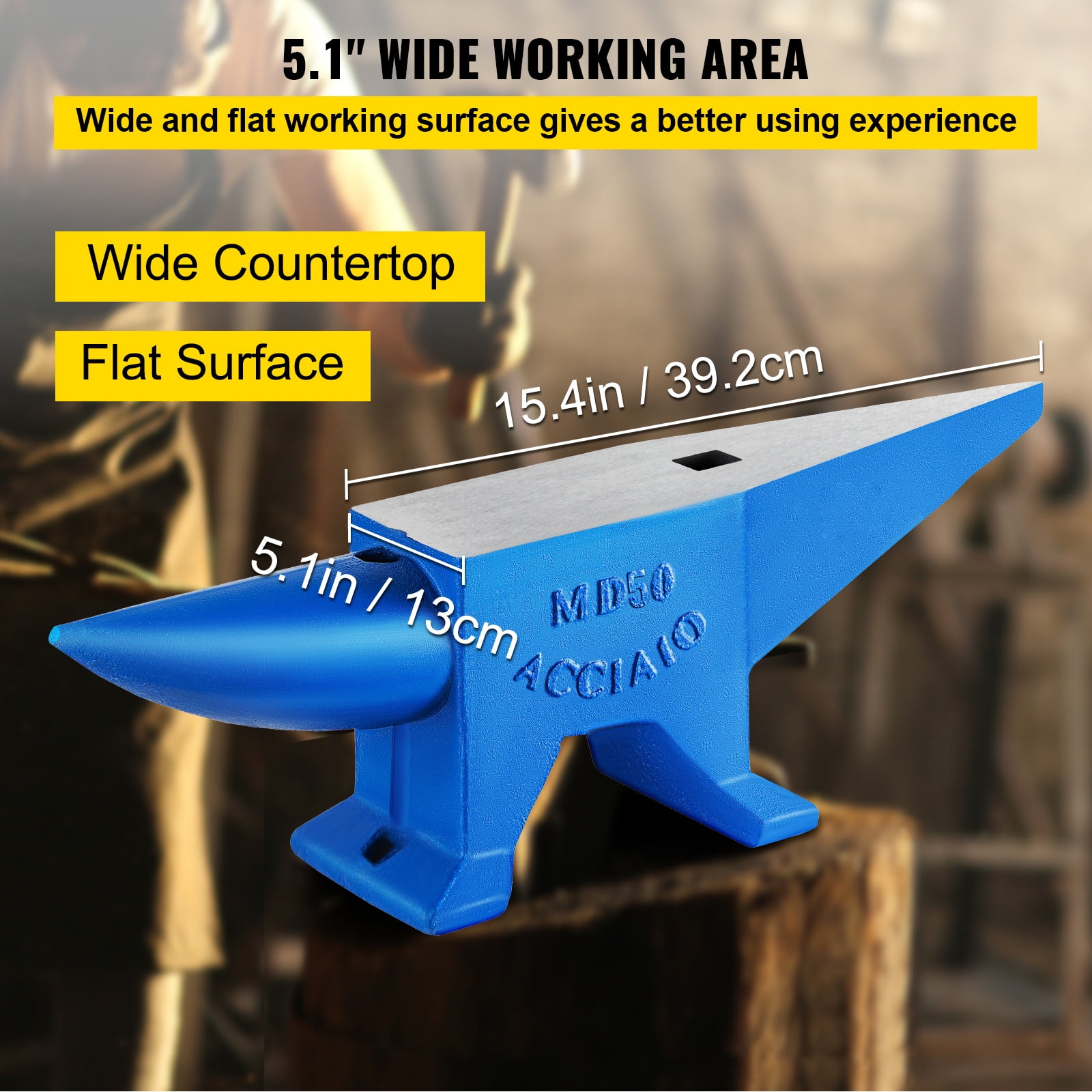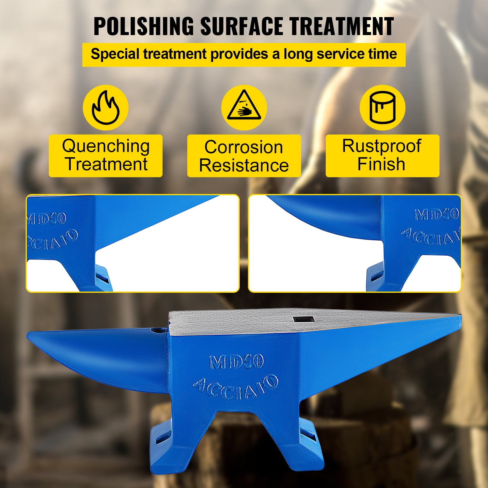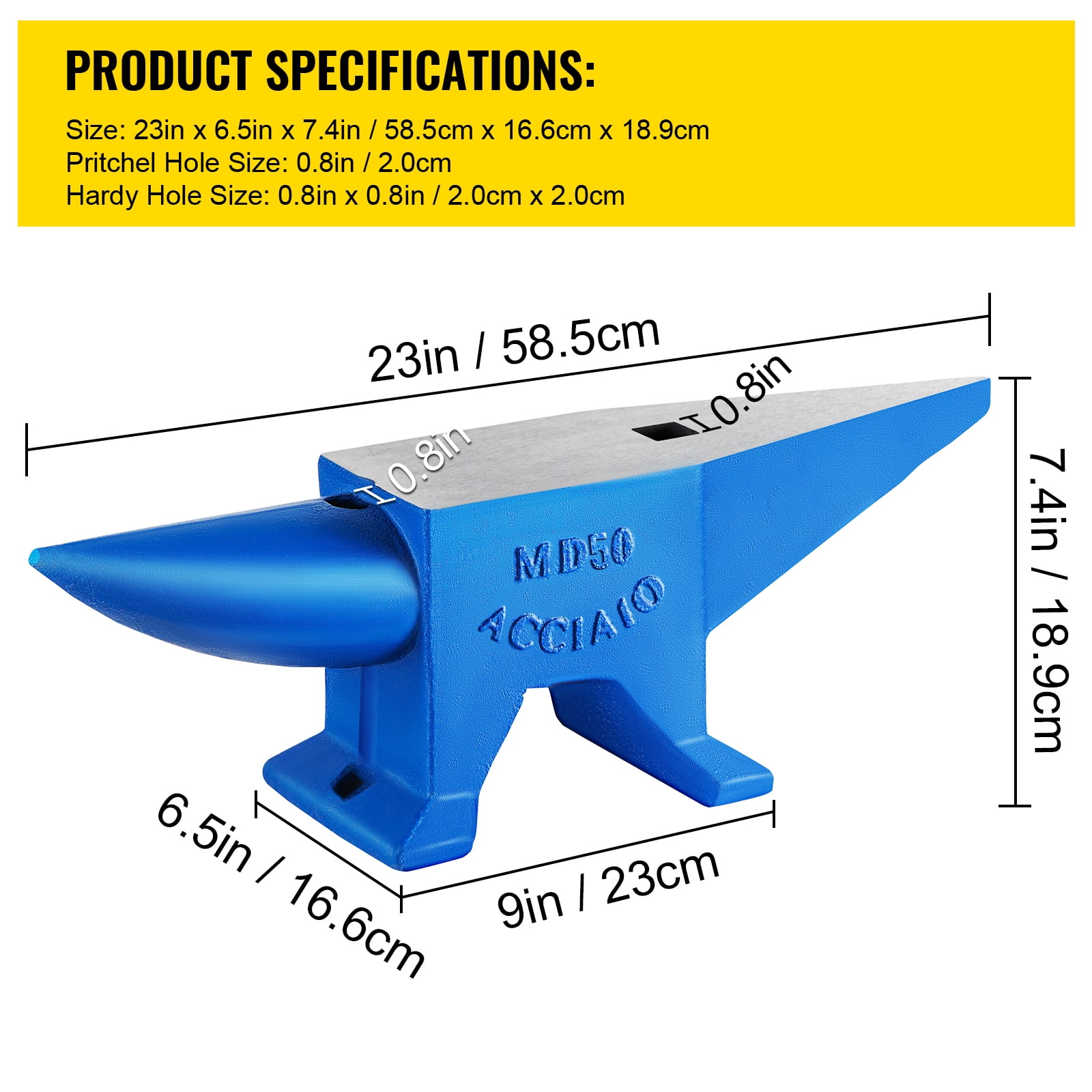 Premium Material 110 lbs: This steel anvil is made of drop-forged, high-grade steel, which features high hardness, strength, and durability. Our steel anvil blacksmith has excellent grade material of 50 HRC. The solid base also keeps it sturdy. Holes & Horns for Different Uses: Round horn and the flat horn of the anvil blacksmith are used for smoothing, bending, and shaping. And the hardy hole and pritchel hole can show a good performance in accessories’ punching and twisting. Polishing Treatment: With fully polished surface area, the blacksmith anvil is corrosion-proof and services long-lasting use through quenching treatment. And the spray coating effectively relieves the oxidation reaction. Large Working Area: This anvil metal 110 lbs/50 kg forge comes with a comfortable and wide work surface, giving a large working area. The wide countertop and flat surface provide a better user experience. It can also bear a long time thumping. Wide Application: The anvil is ideal for hammering, straightening, and for shaping workpieces. It is widely used by metalworkers and smiths in any metal shop. It is excellent for riveting, flattening, forging, and forming metal.