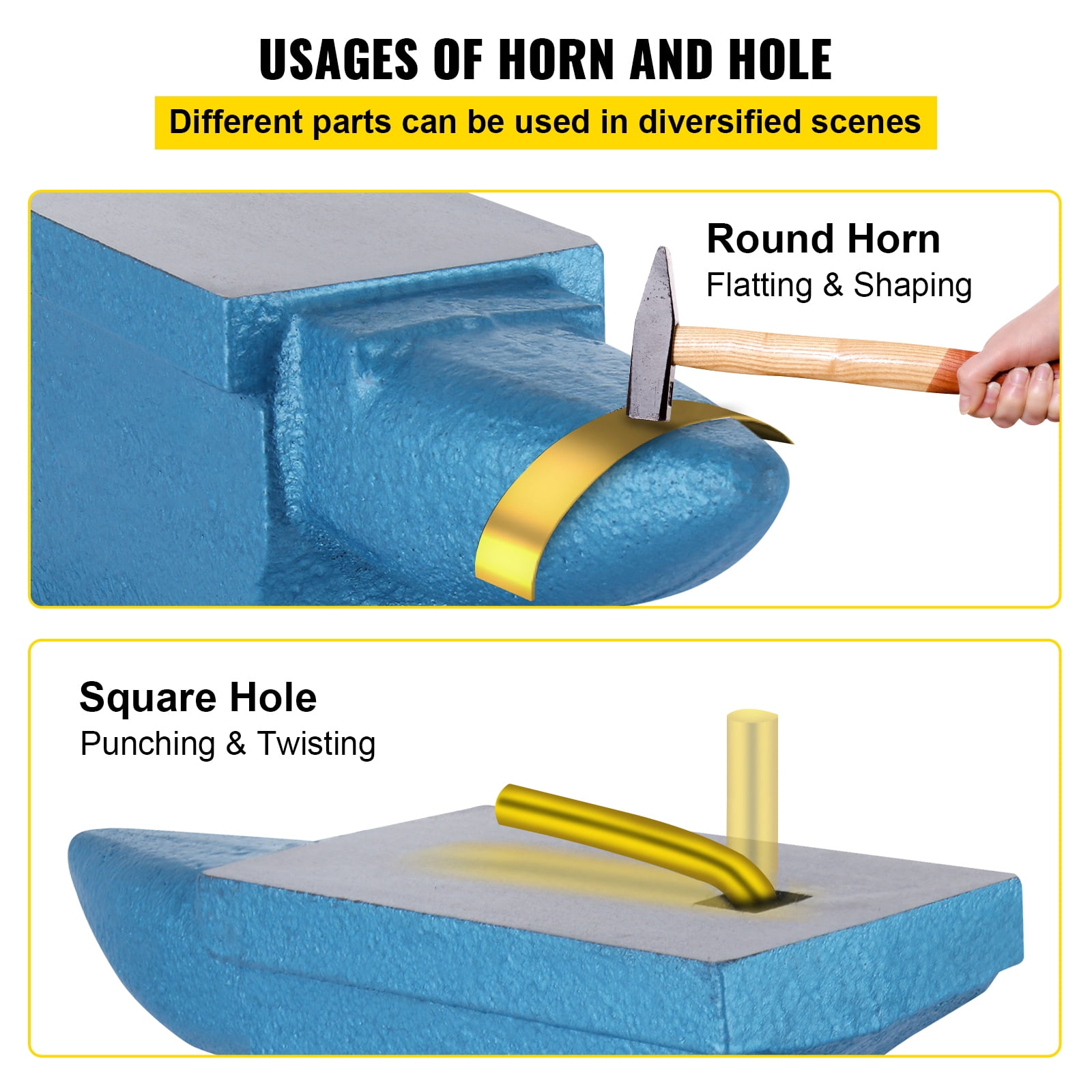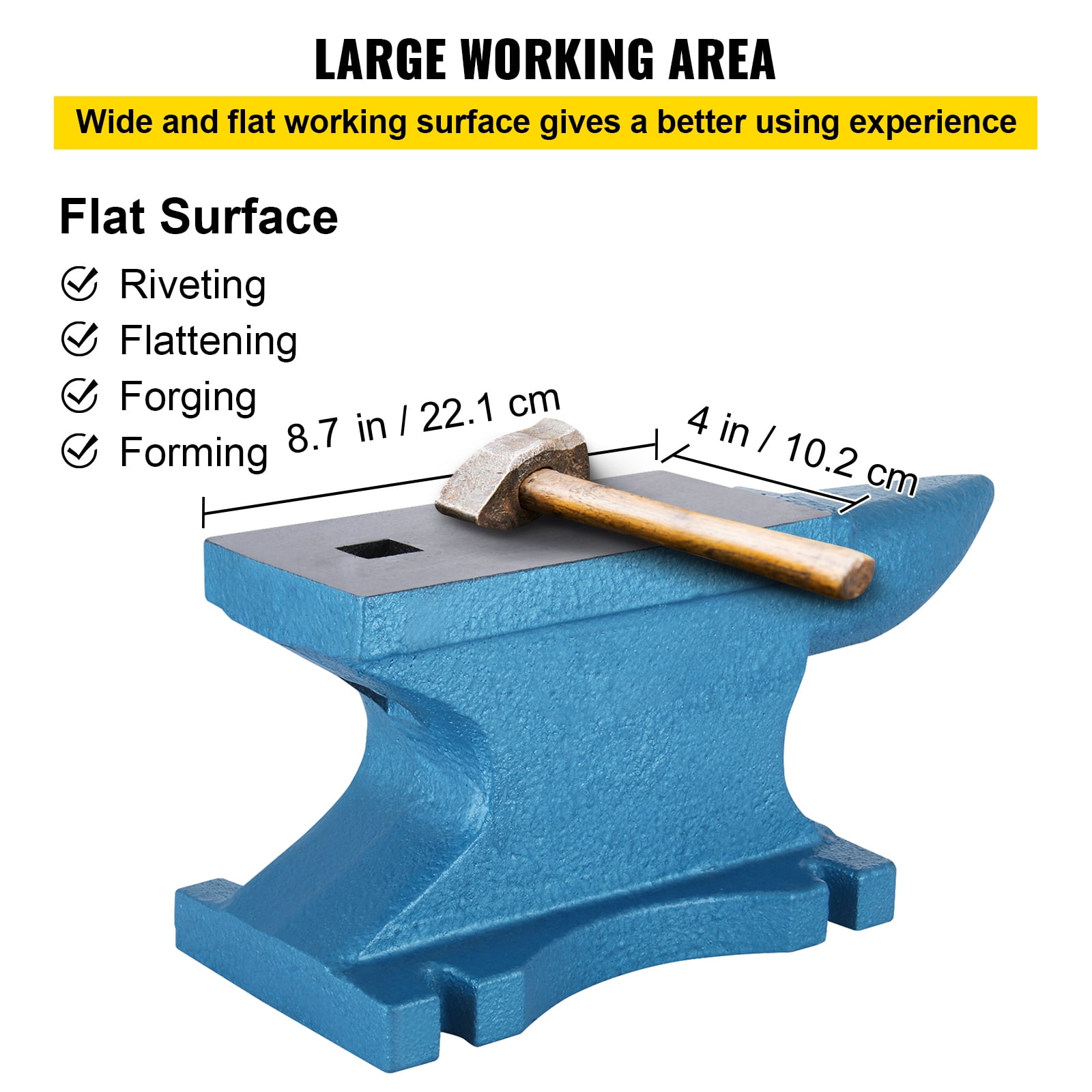Product Description 55 Pounds Iron Anvil The SKYSHALO iron anvil is a versatile tool for metalworking. With its single horn and square hole, it offers a range of uses. The rounded horn allows for smooth bending and shaping, while the hole is perfect for punching and bending accessories. Crafted from cast iron, this anvil is strong enough to withstand heavy blows. It is ideal for metal-smiths, riveting, flattening, forging, and forming metal. Upgrade your metalworking arsenal with the SKYSHALO 55-pound iron anvil. Durable Cast Iron Construction Experience the exceptional durability of our SKYSHALO 55-pound anvil. Crafted with a graded cast iron body, this anvil is designed to withstand heavy blows and provide you with outstanding workmanship. Its drop-forged iron construction ensures maximum strength, allowing you to hammer and shape any metal with ease. Versatile Square Hole & Horn Enhance your metalworking capabilities with the SKYSHALO cast iron anvil’s unique features. The rounded horn is perfect for smooth bending and shaping, while the square hole provides convenient options for accessories, punching, and bending. Unlock endless possibilities and expand your creativity with this versatile anvil. Premium Surface Treatment Our SKYSHALO anvil for blacksmithing boasts a fully polished surface area, offering an excellent finish that is not only visually appealing but also highly functional. The protective paint ensures corrosion resistance and rust-proof performance, allowing you to work confidently without worrying about the longevity of your anvil. Sturdy & Reliable Design Experience stability like never before with the SKYSHALO 55lb iron anvil blacksmith. Its solid base provides unwavering support during metal manipulation or forging, ensuring a secure and reliable work surface. Trust in the durability and strength of this anvil to deliver exceptional results every time. Spacious Countertop Maximize your productivity with the SKYSHALO metal forge’s large and flat work surface. With ample space to maneuver and work on your metal projects, you’ll have the freedom to unleash your creativity and achieve remarkable craftsmanship. Take advantage of the generous working area and elevate your metalwork to new heights. Unmatched Versatility The rugged SKYSHALO cast iron anvil is a must-have for metal-smiths, riveting, flattening, forging, and forming metal. Whether you’re a professional or a hobbyist, this anvil is designed to meet your needs. Unlock its potential and explore a world of endless possibilities with this versatile tool. Specifications Material: Cast Iron Working surface(L x W): 8.7 x 4 inch Horn length: 5.5 inch Hole size(L x W): 0.83 x 0.83 inch Net weight: 55 lbs Gross weight: 56 lbs Overall Length : 15 inch High: 6-5/8 inch Product size(LXWXH): 14.2 x 4 x 6.5 inch Packing size: 15 x 7 x 8 inch Package Content 1 x 55 LB Anvil