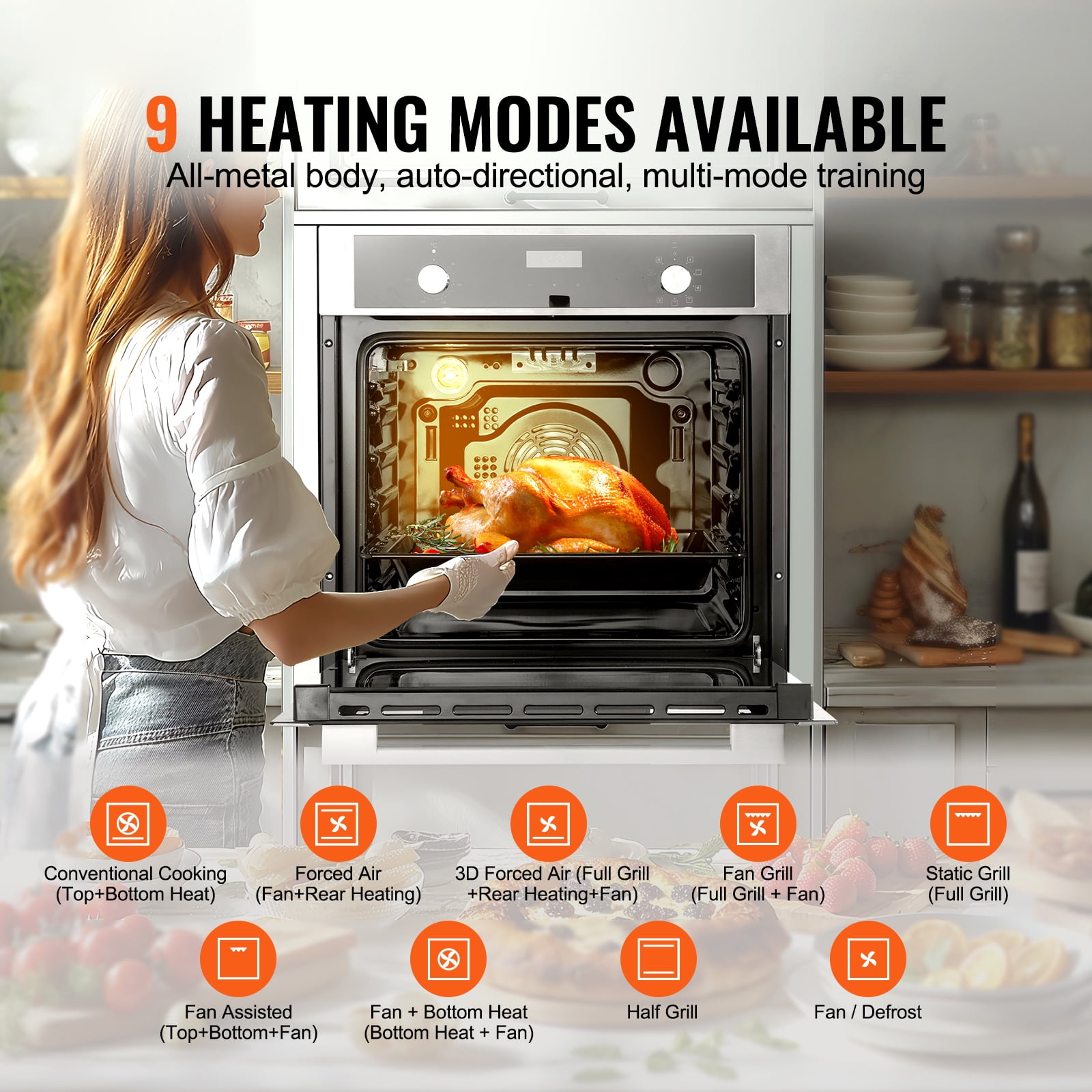 KFFKFF Single Wall Oven, 24″ Electric Oven for Built-in Installation, Offers 9 Cooking Modes, 2.68 Cu.Ft Capacity, Includes Timer, 2800W Power