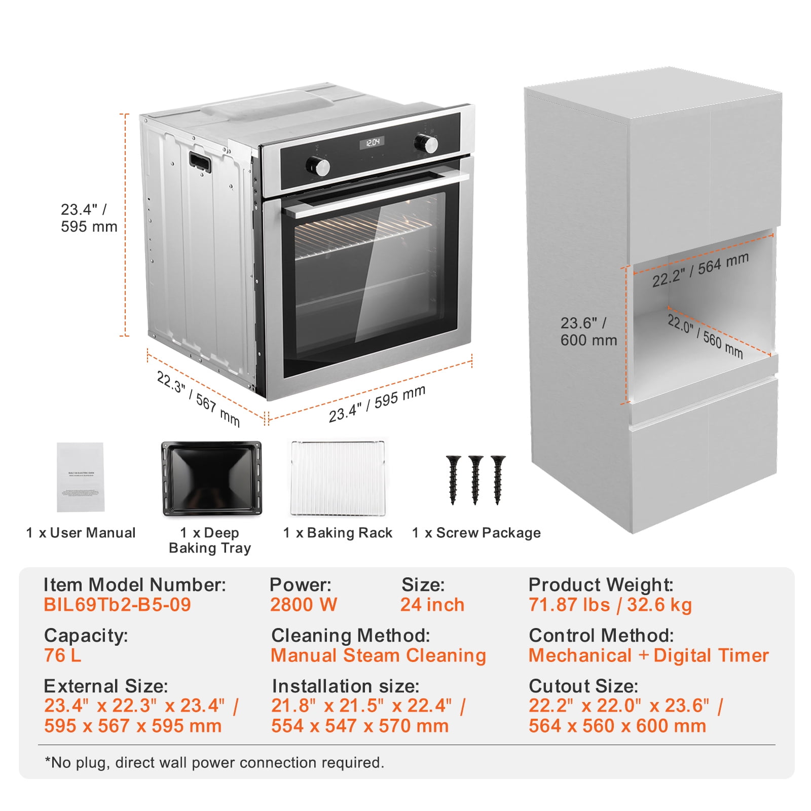 Product Description Single Wall Oven Introducing the KFFKFF Single Wall Oven, a game-changer in the world of cooking appliances. With its spacious 76L capacity and powerful 2800W heating element, this oven is designed to reduce preheating time and reach cooking temperatures rapidly. Say goodbye to long waiting times and hello to delicious meals in no time. Efficient and Spacious Experience the KFFKFF single wall oven, designed with a generous 76L capacity and a powerful 2800W, allowing you to reduce preheating time and quickly reach cooking temperatures. Say goodbye to waiting and hello to delicious meals in no time. Enhanced Cooking Options Indulge in the versatility of our KFFKFF oven with 9 functional modes. Its powerful convection cooking system evenly circulates hot air from all sides, ensuring ideal temperatures and uniform cooking. Enjoy quick preheating and perfectly cooked dishes every time. Hassle-free Cleaning Cleaning up after cooking is a breeze with our KFFKFF oven. It features a high-temperature steam self-cleaning system with multiple stages. The high-temperature steam effortlessly softens grease and dries moisture, making cleaning effortless and hassle-free. Safety at its Best Your safety is our priority. The KFFKFF oven is equipped with triple-layer tempered glass and advanced Low-E coating technology. This effectively reduces heat transfer, keeping the exterior cool to touch and ensuring a quiet operation. Say goodbye to burns and noise disturbance. Unleash Your Culinary Creativity With 9 different heating modes, the KFFKFF oven offers endless possibilities for your cooking adventures. Prepare a variety of dishes with ease and enjoy a more enjoyable and straightforward cooking process. Convenient Monitoring Our KFFKFF oven features a multi-angle active hover door and oven halogen lights. This provides a clear and bright interior, allowing you to easily monitor the progress of your dishes without the need to open the door. Keep an eye on your culinary creations effortlessly. Specifications Item Model Number: BIL69Tb2-B5-09 Power: 2800 W Size: 24 inch Capacity: 76 L Cleaning Method: Manual Steam Cleaning Control Method: Mechanical + Digital Timer Product Weight: 71.87 lbs / 32.6 kg External Size: 23.4″ x 22.3″ x 23.4″ / 595 x 567 x 595 mm Installation Size: 21.8″ x 21.5″ x 22.4″ / 554 x 547 x 570 mm Cutout Size: 22.2″ x 22.0″ x 23.6″ / 564 x 560 x 600 mm Package Content 1 x Single Wall Oven 1 x Baking Rack 1 x Deep Baking Tray 1 x Screw Package 1 x User Manual