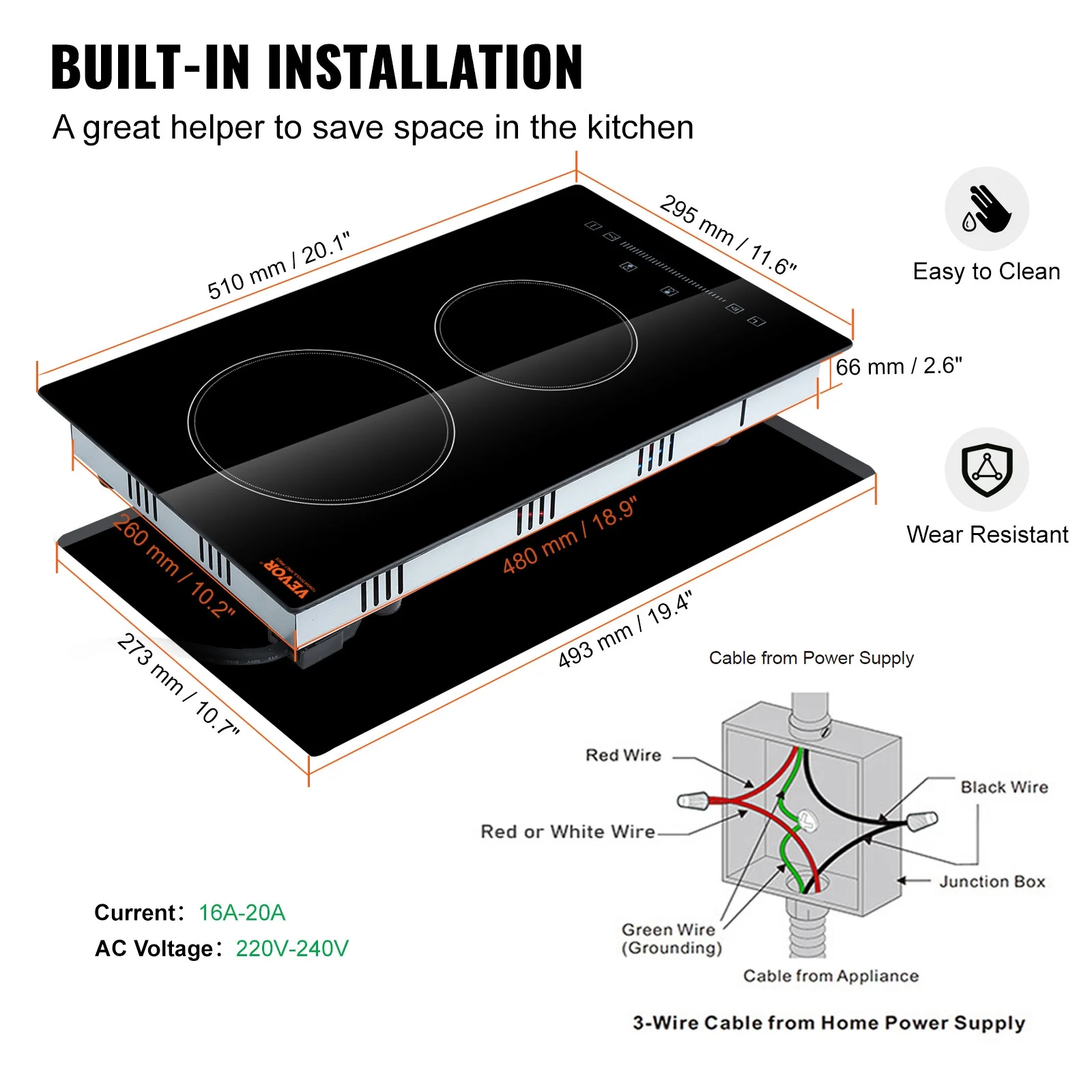 The KFFKFF ceramic cooktop features 4 separate cooking zones and a total power of 6000W. Its heat-proof glass surface is easy to clean, ensuring convenience and efficiency in your kitchen. With digital sensor touch controls and 9 heating power levels, this cooktop allows you to precisely switch between boiling and simmering. The 1-99min timer adds ease and enjoyment to your cooking experience. This versatile cooktop works with any type of cookware, including aluminum pans, copper pans, cast iron frying pans, and non-magnetic stainless steel pans. You can cook with all 4 stoves simultaneously, maximizing efficiency. Safety is a top priority with the KFFKFF ceramic cooktop. It offers multiple safeguard functions, including a child security lock, overheat protection, and auto shut-off function. There is no high-frequency radiation, and a residual heat reminder prevents hand scalding during cleaning. The built-in fan cools down the cooker after use, ensuring peace of mind. Designed for convenience, this cooktop has a built-in design with a 23.2×25.6-inch cutout size. It is easy to install and saves space in your kitchen. Suitable for voltages of 220-240V, 50/60Hz.