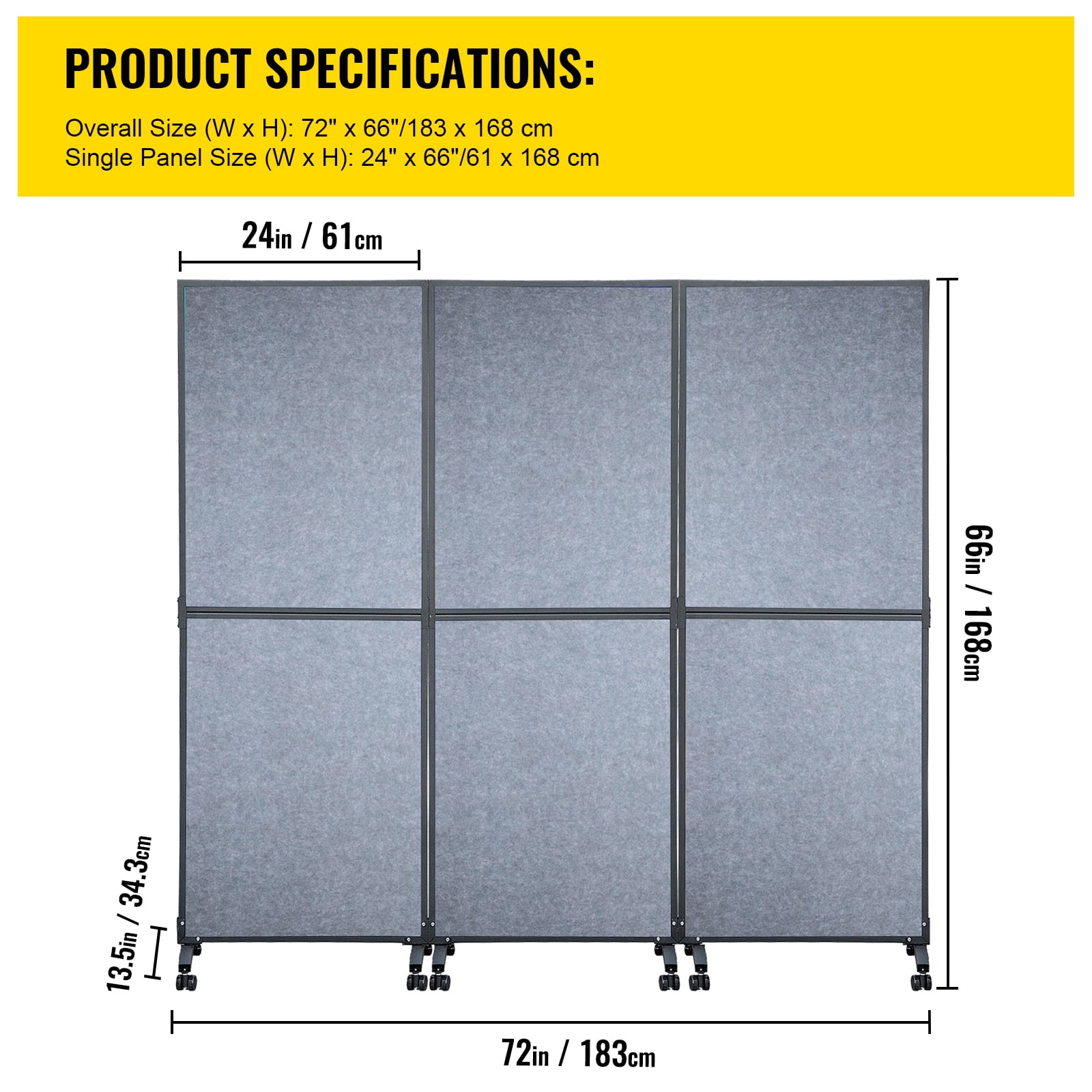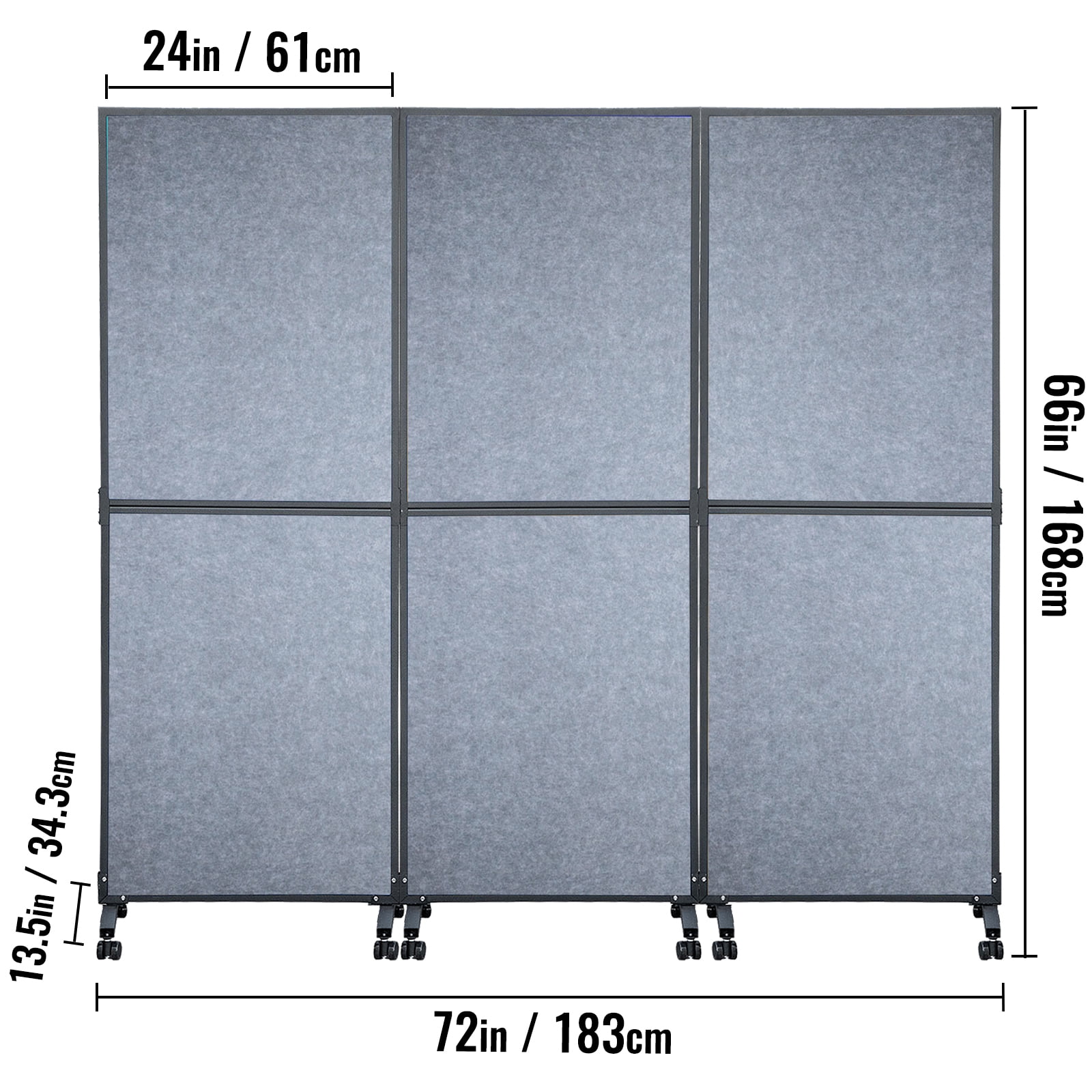 Product Description 72″ x 66″ 3-Pack Room Divider Are you in need of a peaceful and secluded area? Look no further than this office divider. It is designed to cater to your requirements perfectly. The panel, made of polyester fiber, has the ability to absorb 85% of surrounding noise, while the steel frame ensures long-lasting durability. With its flexible foot connectors, this cubicle partition offers you the freedom to effortlessly rearrange your workspace or study area. Whether it’s for your office, home, library, or school, our room divider with wheels serves as an ideal solution for partitioning. Create Your Own Private Space With this 72″ x 66″ room divider wall, you can easily create an exclusive work area for yourself. Enjoy the luxury of having your own private space while maintaining a comfortable social distance. Reduce Noise Distractions Experience a peaceful and focused work environment with our office cubicle. Designed to effectively filter out 85% of ambient noise, it provides an ideal solution for blocking off distractions and creating a quiet space for work or study. Personalize Your Workspace Unleash your creativity and personalize your space with our customizable room divider. The polyester fiber panel is perfect for pinning up pictures, notes, memos, fun quotes, task lists, and documents. Let your workspace reflect your unique style and preferences. Versatile and Flexible Design Our room divider features three panels that can be easily connected using foot connectors. This flexible design allows for limitless layout possibilities, making it easy to create various shapes and sizes to suit your needs. Combine multiple sets for a larger room partition. Easy Mobility and Stability Equipped with 12 lockable universal wheels, our acoustic room divider offers convenient mobility. Easily move it around your space as needed, and lock 6 of the wheels to ensure stability and keep the screen securely in place. Perfect for Various Settings Whether you need privacy protection, space division, or sun shading, our room partition is the perfect solution. Its classic style seamlessly blends into any setting, making it suitable for your home, office, library, school, and more. Specifications Package Content