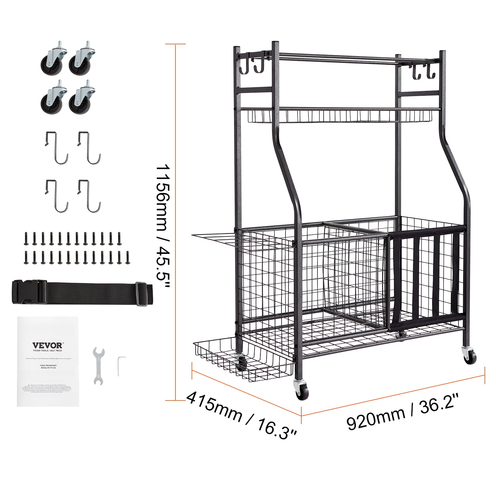 Extra Large Capacity: This multifunctional sports storage comes equipped with 1 metal frame, 1 elastic band storage box, 1 long metal wire basket, 1 top double rod, and 1 side rack that can hold up to 12 clubs. All these storage accessories help to keep your sports equipment organized, ensuring your items are neatly arranged, truly saving space and offering convenient access. Sturdy and Durable Material: This sports equipment garage organizer is made from heavy-duty powder-coated steel frames and heavy metal wire mesh, offering durability and wear resistance for years of use. The surface features scratch-resistant textured paint, waterproof and rustproof, preventing scratches and ensuring a longer-lasting storage solution. User-friendly Storage Design: The diverse configuration allows for efficient categorized storage. Four removable hooks expand storage options, easily hanging water bottles, hats, helmets, and other accessories. The added side shelf makes it easy to place various rackets and clubs. The elastic bands maximize the storage space of the ball storage box, making it easier to access items at the bottom. Durable Wheels with Brakes: This garage sports storage equipment is equipped with 4 universal wheels that can rotate 360°, allowing you to easily move it anywhere. 2 wheels are lockable; you can securely lock the cart in place. Perfect for both indoor and outdoor use, eliminating the hassle of organizing equipment after sports, and letting you fully enjoy your activities. Suitable for Various Settings: This practical sports garage organizer is ideal for organizing items in gyms, schools, and any sports venues. It can easily keep your space tidy and organized. Easy to install with all necessary accessories included, the assembly is straightforward and quick. Specifications Item Model Number: RF-RY-028 Main Material: Q235 Product Weight: 8.4 kg / 18.51 lbs Product Dimensions (LxWxH): 920x415x1156 mm / 36.2×16.3×45.5 inches Package Content 1 x Sports Equipment Garage Organizer 1 x Set of Accessories