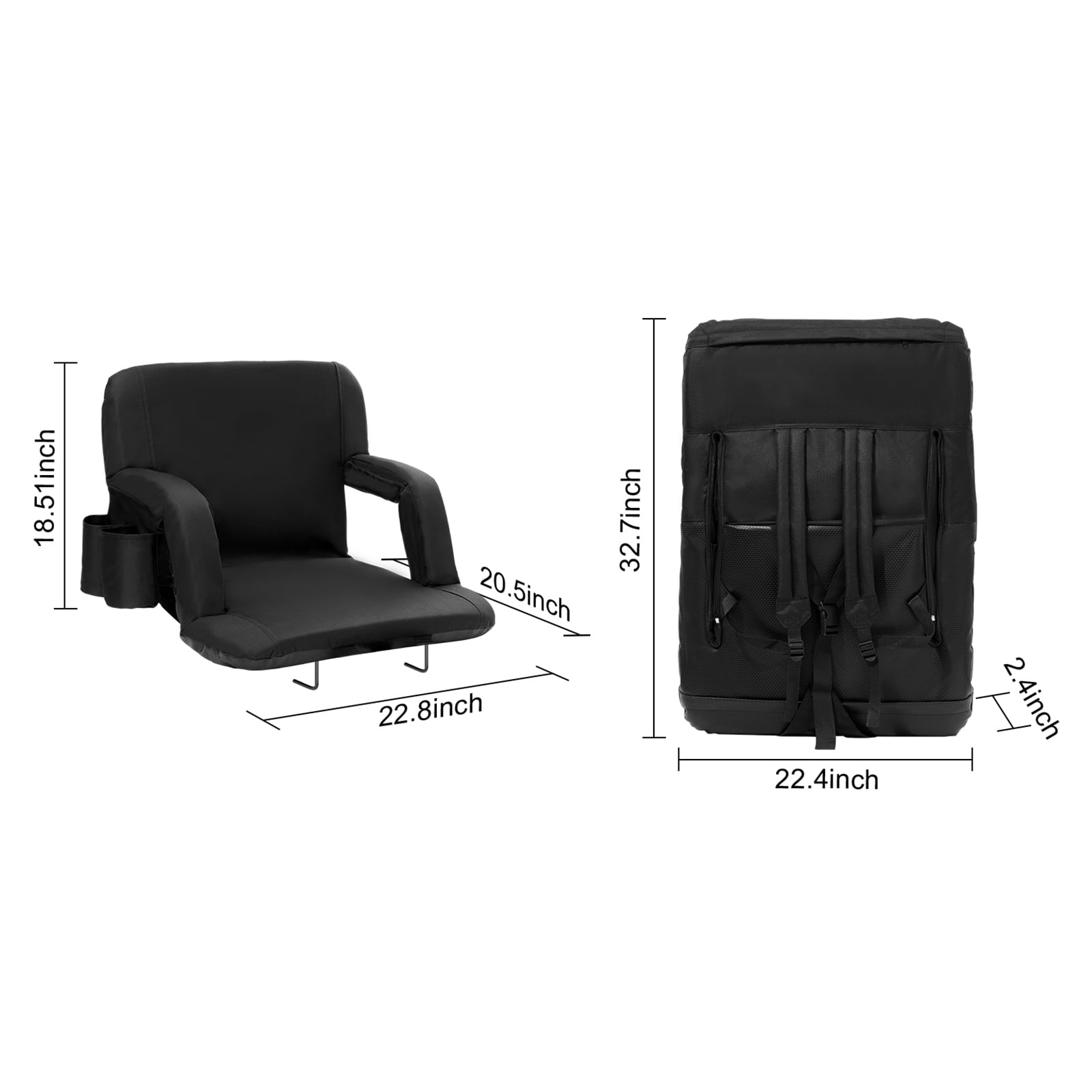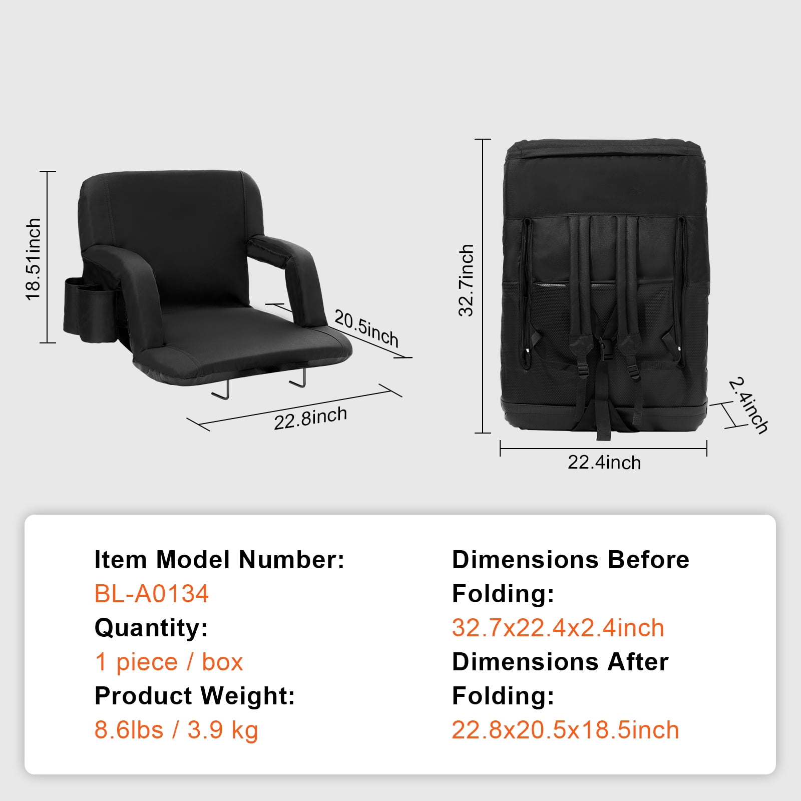 High-Quality Material: This stand chair back features a lightweight rigid frame, thickened high-density sponge and a 600D waterproof Oxford cover for durability. It provides comfort for long periods of sitting. The weather-resistant finish makes it easy to clean and maintain, keeping it dry in light rain or snow. The seats can be extended up to 22 inches to accommodate multiple people. Multiple Storage Features: This outdoor stadium seat comes with multiple side pockets, each with a different purpose, such as a phone pocket and a rear pocket. It includes water bottles, snacks, wipes, etc. It is very convenient to store, making the viewing experience more comfortable. Portable Seat: Portable stadium seats with easy-to-move folding design, can be folded flat in one step, easily loaded into a backpack, easy to carry. It is a great choice for watching professional sporting events, as well as for parties, concerts, picnics and more. It takes up very little space and can be easily stored in the trunk of a car. 6-Position Adjustable Backrest: Folding stadium seats offer 6 adjustable tilt angles such as 90??, 105??, 130??, 145??, 160?? and 180??. Adjust the seat by pushing it from the most forward position and then pushing it back to a flat position. Even during activities lasting several hours, this adjustment provides adequate support while maintaining a comfortable posture. Safe and Stable: There are two iron racks at the bottom that can quickly and easily secure the chair to most posts and benches. Don’t worry about your seat falling into the stands so you can watch the game. SpecificationsItem Model Number: BL-A0134Quantity: 1 Piece Per BoxProduct Weight: 8.6 lbs / 3.9 kgDimensions Before Folding: 32.7×22.4×2.4 inchDimensions After Folding: 22.8×20.5×18.5 inchSeat Width: 19.3 inchSeat Depth: 15.4 inch Package Content1 x Stadium Seat1 x Set of Accessories