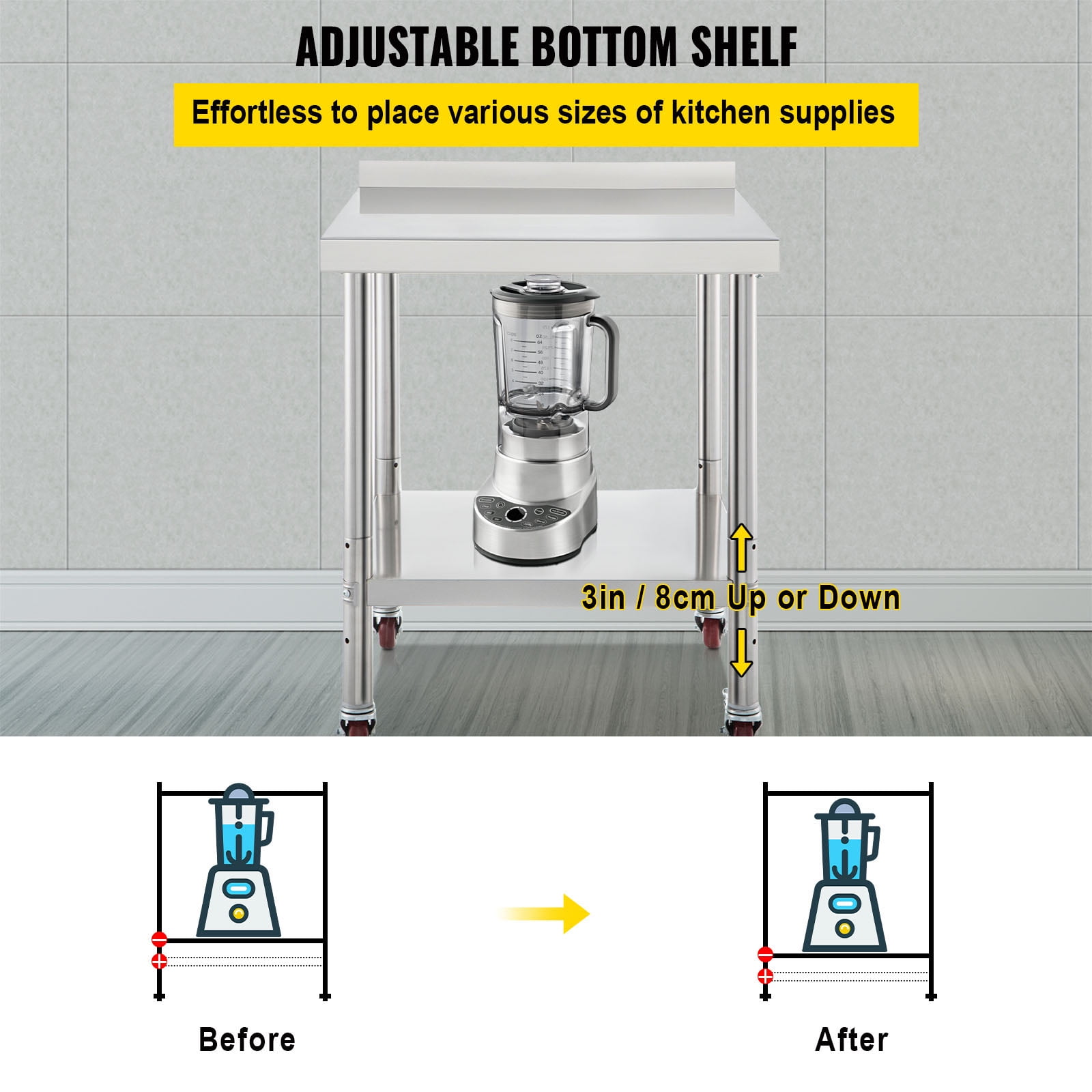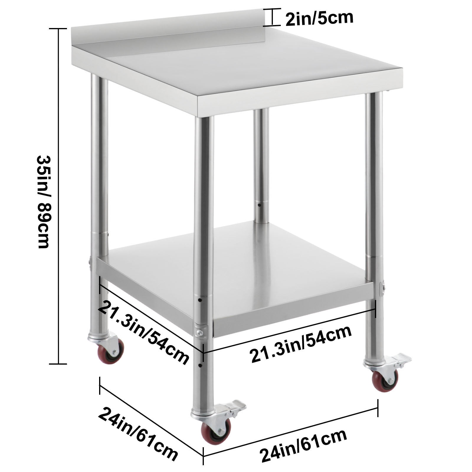 Heavy-Duty Work Table: Our stainless steel prep table has an undershelf for additional storage space. The 24 x 24 x 2.2-inch top shelf can load max. 330lbs items and the 21.3 x 21.3 x 1.8-inch undershelf can load max. 110 lbs items. It’s easy for you to store all of your most-used supplies. The 1.9-inch thickened columns feature a triangle support design, which improves the durability and stability of this table. Adjustable Undershelf: The undershelf has 3 levels for height adjustment (the distances between 2 shelves: 16.9 / 20.1 / 23.2 in) with a 3-inch interval. You can raise or lower it to accommodate the size of storage items. Rock Solid Material: Our kitchen work table is made of 201 stainless steel material, ensuring that it’s rust-proof, corrosion-proof, and easy to clean. With the wire-drawing surface, this table offers a beautiful appearance, is not easy to scratch, and hardly leaves water stains. The 2-inch high backsplash is equipped to keep the items from falling. The smooth edges can keep your hand from getting hurt. Besides, the 4 flexible casters (2 with brakes) are well-designed for moving conveniently. Easy Installation: Due to its simple structure and lightweight components, our food prep table can be assembled quickly and effortlessly. Install the four table legs into the pre-drilled holes, assemble the undershelf into the columns, tighten all parts with screws, put the casters into the legs, and it’s ready to use. You can finish the assembly on your own within minutes through the instructions in the manual. Multiple Application: This kitchen prep table can be used in the kitchen, laundry room, garage, restaurant, hotel, etc. In addition to storing items, you can also use it to chop vegetables, knead the dough, cut meat, and do other related things in the kitchen.