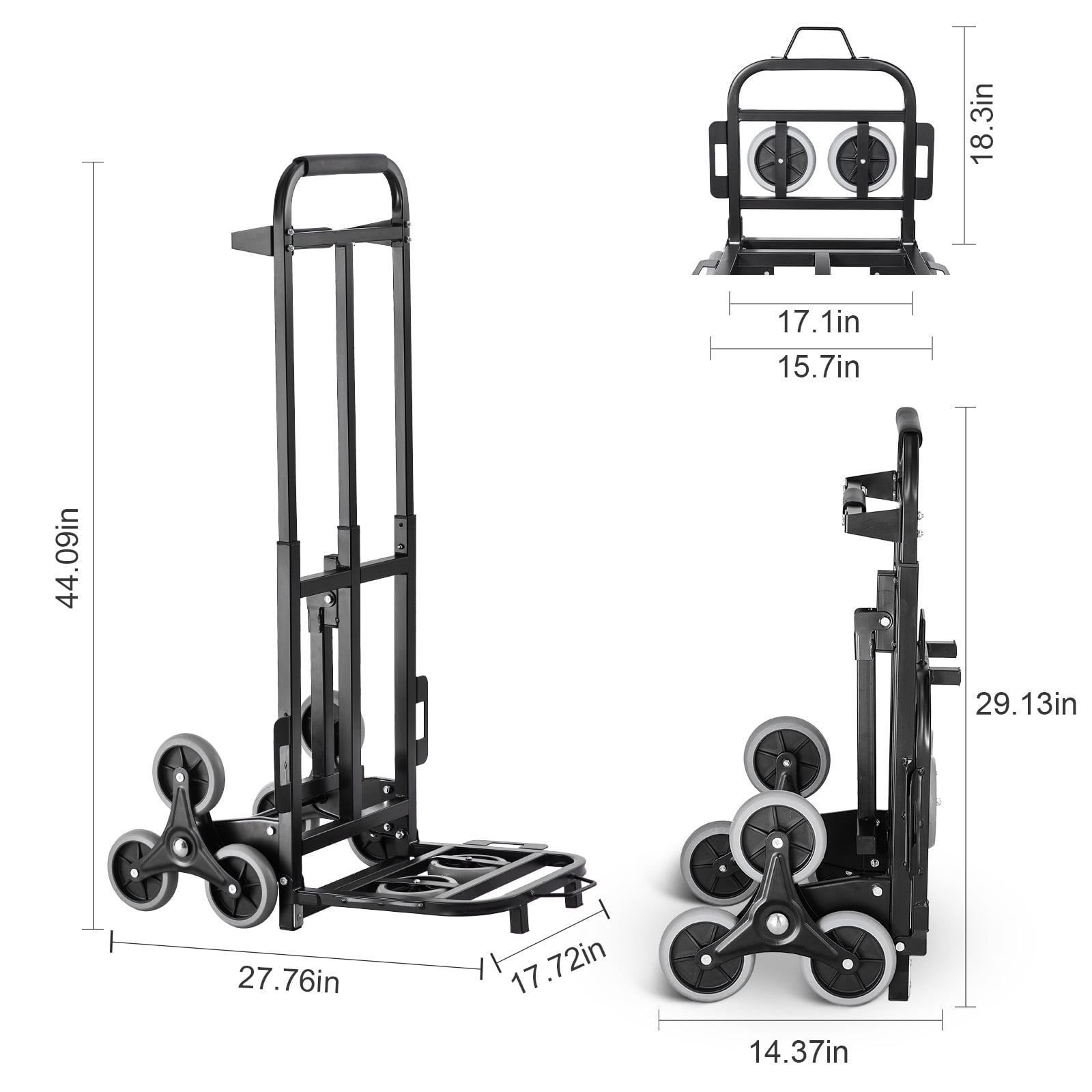 Product Description KFFKFF Stair Climbing Cart: The Perfect Solution for Moving Day Introducing our KFFKFF stair climbing cart, designed to make your moving day a breeze. With 6 wide climbing wheels and 2 spare ones, this cart effortlessly maneuvers both up and down stairs as well as on the ground. Its sturdy carbon steel frame ensures stability, keeping your load secure throughout the journey. The innovative dual-handle design provides comfortable pushing and pulling, reducing strain on your body. When you’re finished, simply fold it up and conveniently store it in your car trunk. Say goodbye to the hassle of transportation and storage with our KFFKFF stair climbing cart. 460 lbs Stair Climbing Cart Bid farewell to back strain! Our cart for stairs features a robust and dependable carbon steel frame that ensures the security and stability of your load. Effortless Transportation With the wide climbing wheels, our stair cart enables effortless maneuvering on both even surfaces and stairs. Convenient Folding and Usage Using the stair climbing shopping cart is a breeze – simply unfold it, and you’re good to go. When not in use, easily fold it into a compact size for hassle-free storage in your trunk. User-Friendly Design Equipped with dual handles, this shopping cart stair climber makes pulling and pushing a breeze. The high-quality wheels minimize resistance, while the included elastic ropes securely hold your load in place. Versatile Utility Whether it’s home moving, handling factory/warehouse cargo, or transporting materials at a construction site, this stair dolly is your reliable companion in every scenario. Robust and Long-Lasting Constructed from a sturdy one-piece carbon steel frame, this stair climber cart is exceptionally durable, resistant to wear, and free from deformation. It’s the perfect solution for all your long-term moving requirements! Specifications Item Model Number: 2025C Load Capacity on Ground: 460 lbs/208 kg Load Capacity When Climbing: 220 lbs/100 kg Material: Carbon Steel + TPR Climbing Wheel Diameter: φ4.92″/125 mm Product Weight: 20.28 lbs/9.2 kg Folded Size: 14.37″ x 17.72″ x 29.13″/365 x 450 x 740 mm Fully Extended Size: 27.76″ x 17.72″ x 44.09″/705 x 450 x 1120 mm Package Content 1 x Stair Climbing Cart 2 x Elastic Ropes 1 x User Manual