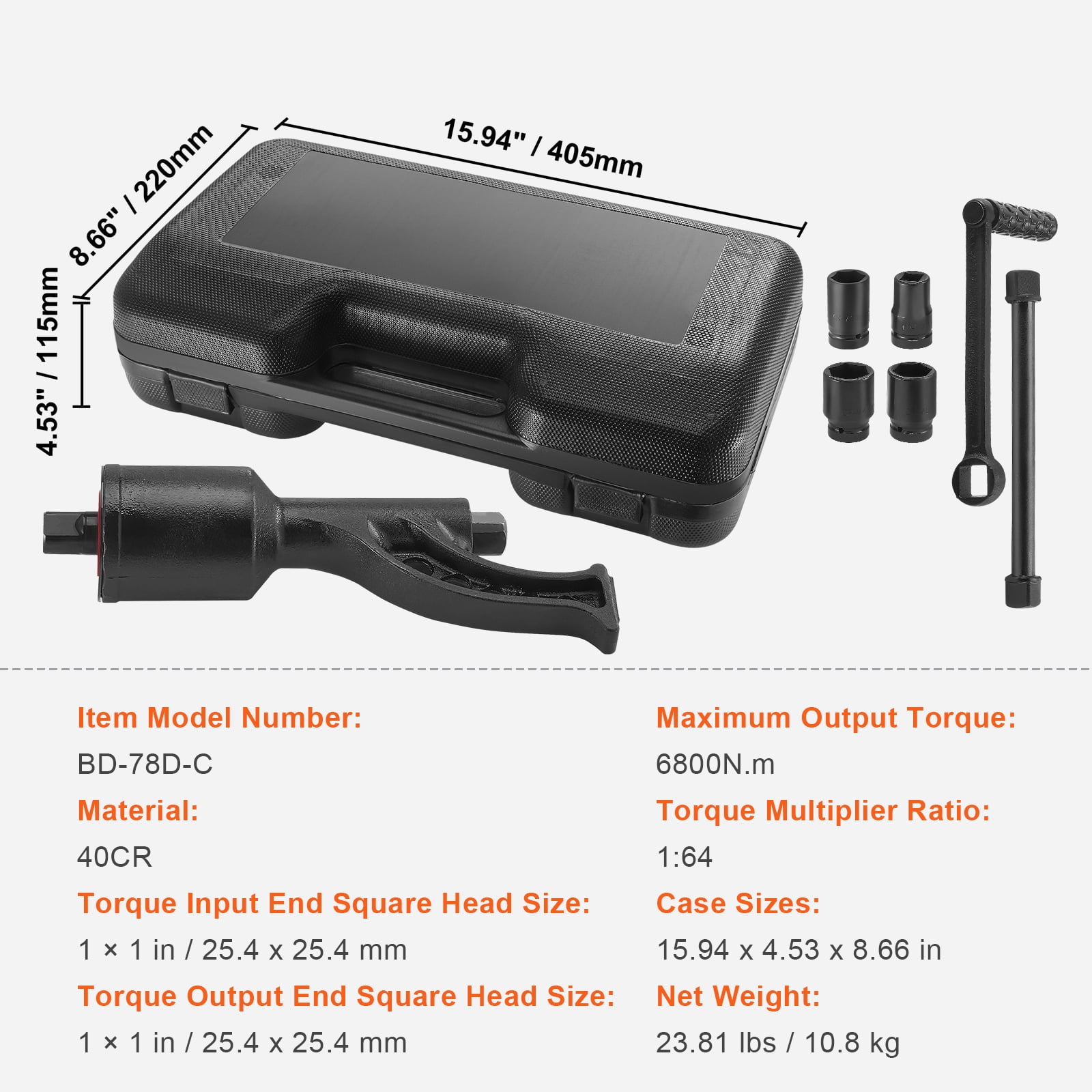 Product Description KFFKFF Torque Multiplier, Your Ideal Nut Removal Assistant Our torque multiplier wrench set is crafted from high-quality alloy steel for long-lasting use. The specialized lever and gear design make high torque a piece of cake, even for the most stubborn nuts. The ergonomic handle design ensures stability and comfort. Whether you’re a pro or a DIY enthusiast, you’ll breeze through nut removal, boosting productivity like never before. Choose the torque multiplier and make nut-busting a breeze. Outstanding Performance With an efficient 1:64 gear ratio, our torque multiplier can deliver an impressive 6800Nm of output torque. Whether it’s due to rust, prolonged inactivity, or other reasons that make nuts exceptionally stubborn, this tool can easily handle them in a short time. Durable Structure The torque wrench multiplier is crafted from robust alloy steel to withstand wear and impacts in various work environments, ensuring its long-lasting lifespan. The lever design creates exceptional leverage, making it robust and resistant, even when dealing with heavy equipment. Portable Toolbox The toolbox’s design prioritizes portability, crafted from lightweight materials to ensure it doesn’t add any extra burden when carrying or storing. Whether you’re working in a garage, at a construction site, or outdoors, our torque multiplier wrench set provides convenience. Anti-slip Handle Whether in sweaty or slippery conditions, the unique textured pattern on the handle adds friction, ensuring the handle doesn’t easily slip from your hand, providing you with a more stable and comfortable grip experience. Wide Range of Applications Our multiplier lug nut wrench is a must-have tool for nut removal and installation, commonly used for vehicles such as most trucks, RVs, buses, tractors, trailers, and other heavy-duty vehicles. Effort-Saving Lever With a high torque multiplier ratio of 1:64, users can easily generate sufficient torque without extra effort. Compared to traditional methods, using this torque wrench significantly reduces the time required to complete tasks. This not only improves work efficiency but also reduces physical strain. Specifications Item Model Number: BD-78D-C Material: High-Quality Alloy Steel Surface Treatment: Spray Coating Torque Input End Square Head Size: 1″/25.4×25.4mm Torque Output End Square Head Size: 1″/25.4×25.4mm Maximum Output Torque: 6800N.m Torque Multiplier Ratio: 1:64 Case Sizes : 15.94 x 4.53 x 8.66in / 405 x 115 x 220mm Net Weight: 23.81lbs / 10.8kg Package Content 1 x User Manual Sockets (21# Square, 33mm, 38mm, and 41mm) 1 x Torque Multiplier 1 x Extension Bar 1 x Rocking Handle Bar 1 x Plastic Storage Case