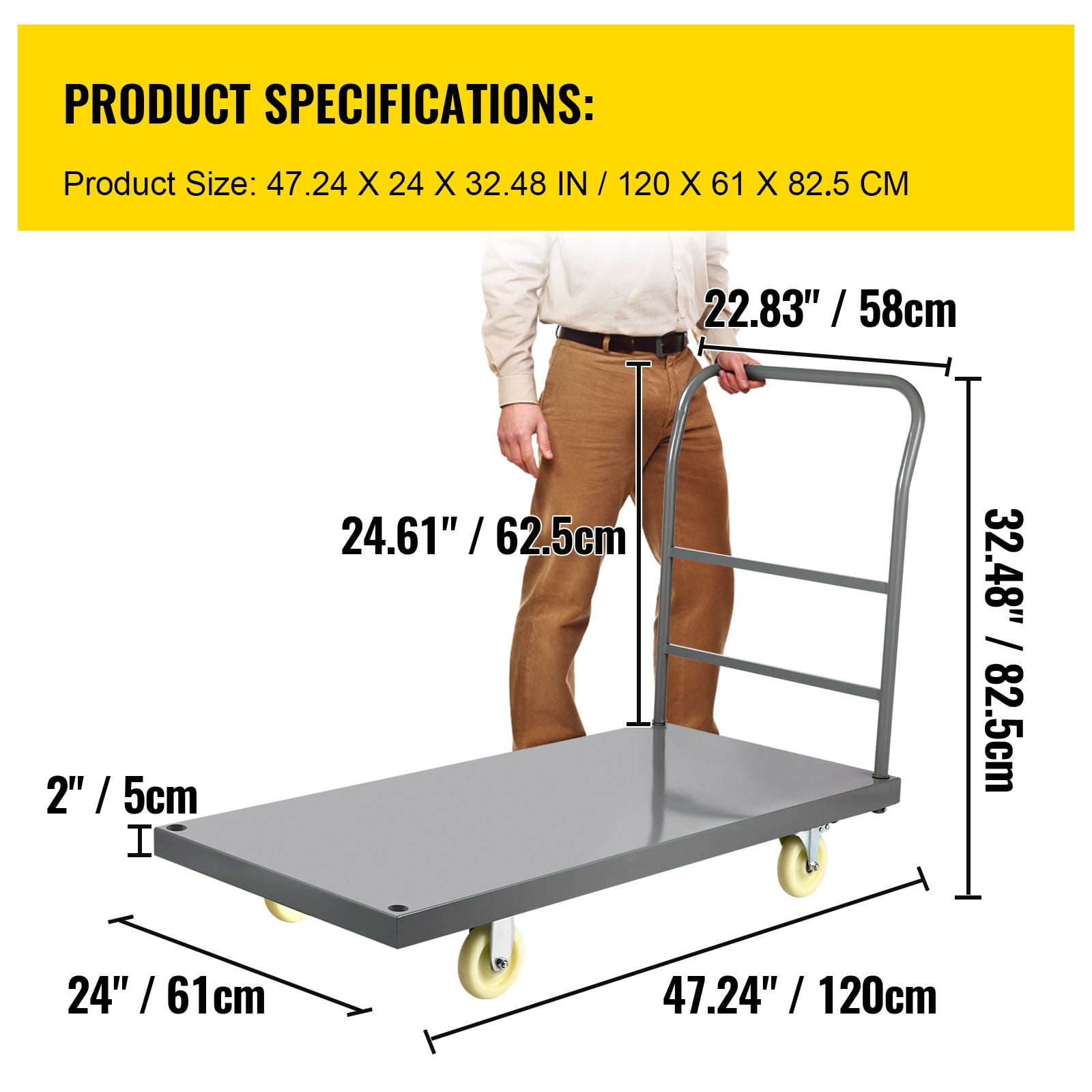 Product Description Wheeled Rolling Platform Truck The KFFKFF platform truck is designed with a sturdy steel deck that is welded for extra strength. Its robust construction allows it to bear heavy loads of up to 2,000 lbs. This versatile truck is not only convenient to use but also easy to store. Whether you need it for your car trunk, office, or home, this platform truck is a smart investment. Say goodbye to multiple trips and effortlessly transport your items with KFFKFF. Durable Steel Construction Crafted with high-quality steel, this flatbed cart ensures exceptional strength and durability. Its robust all-steel construction guarantees long-lasting performance, while the smooth powder-coated finish prevents rust formation, ensuring a sleek and corrosion-resistant surface. Impressive 2,000 lb Loading Capacity With its compact and stable design, this flatbed cart can effortlessly transport items weighing up to 2000 lbs. Its high-quality steel composition enables it to handle a wide range of goods, making it ideal for daily carrying needs. Ample and Sturdy Deck Featuring an extended and thickened deck, this platform cart offers generous loading space. Its spacious design allows you to conveniently transport multiple items at once, ensuring efficient and hassle-free transportation. Smooth and Maneuverable Casters Equipped with four 5” nylon casters, this push dolly ensures smooth and nearly silent movement. The two swivel casters provide 360-degree rotation, granting you the flexibility to effortlessly steer the cart in any direction. Convenient and Portable Design Designed with a cargo baffle to prevent items from falling, this platform truck offers added convenience during transportation. Its detachable handle design allows for easy portability, enabling you to disassemble the handle and store it in your car’s trunk. Versatile and Essential Tool Whether you’re working in a garage, basement, office, or warehouse, this rolling platform truck is an indispensable tool. It effortlessly assists you in handling and moving items, making it a must-have for various environments. Specifications Model: VV-PT-M4824 Color: Grey Material: Q235 Steel Surface Treatment: Sprayed Caster Material: PU Caster Diameter: 5 in / 125 mm Caster Width: 1.26 in / 32 mm Load-Bearing: 2000 lb / 907 kg Handle Length: 22.83 in / 580 mm Handle Height: 24.61 in / 625 mm Deck Thickness: 2 in / 50 mm Item Dimension: 47.24 x 24 x 32.48 in / 1200 x 610 x 825 mm Item Weight: 62.83 lb / 28.5 kg Package Content 1 x Platform Truck