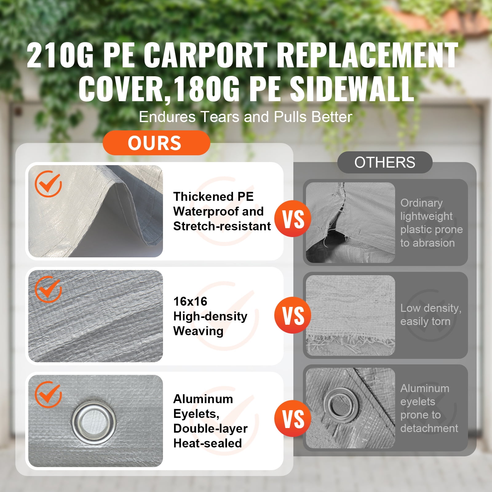 KFFKFF Canopy Fabric: This canopy fabric is designed to fit 10’x20′ garage frames. It includes a 5-panel front door with a dual zipper structure, providing easy access. Please note that this product includes only the canopy fabric, frame not included. High-Quality Material: The top canopy fabric is made of 210g PE plastic woven, while the side panels are made of 180g PE plastic. Both materials feature a 16×16 weave pattern, ensuring thickness and resistance to water pooling. The double-layer heat-sealed seams and reinforced Velcro attachments enhance durability and longevity. Waterproof and UV Protection: Our KFFKFF canopy fabric is coated with PU+UV-resistant material on both sides, offering excellent waterproofing and protection against harmful UV rays (UV50+). This ensures reliable use in various weather conditions. Easy and Tool-Free Installation: Our canopy fabric comes with elastic ball bungees for fastening through aluminum grommets, making installation a breeze. The Velcro attachments on the sides provide additional stability without the need for any tools. Versatile and Practical: The KFFKFF canopy fabric is not only suitable for replacing garage side canopies but also perfect for setting up temporary garages and parking various vehicles. Additionally, it can be used for parties, weddings, creating shaded areas, and more. Let your creativity explore the endless possibilities!