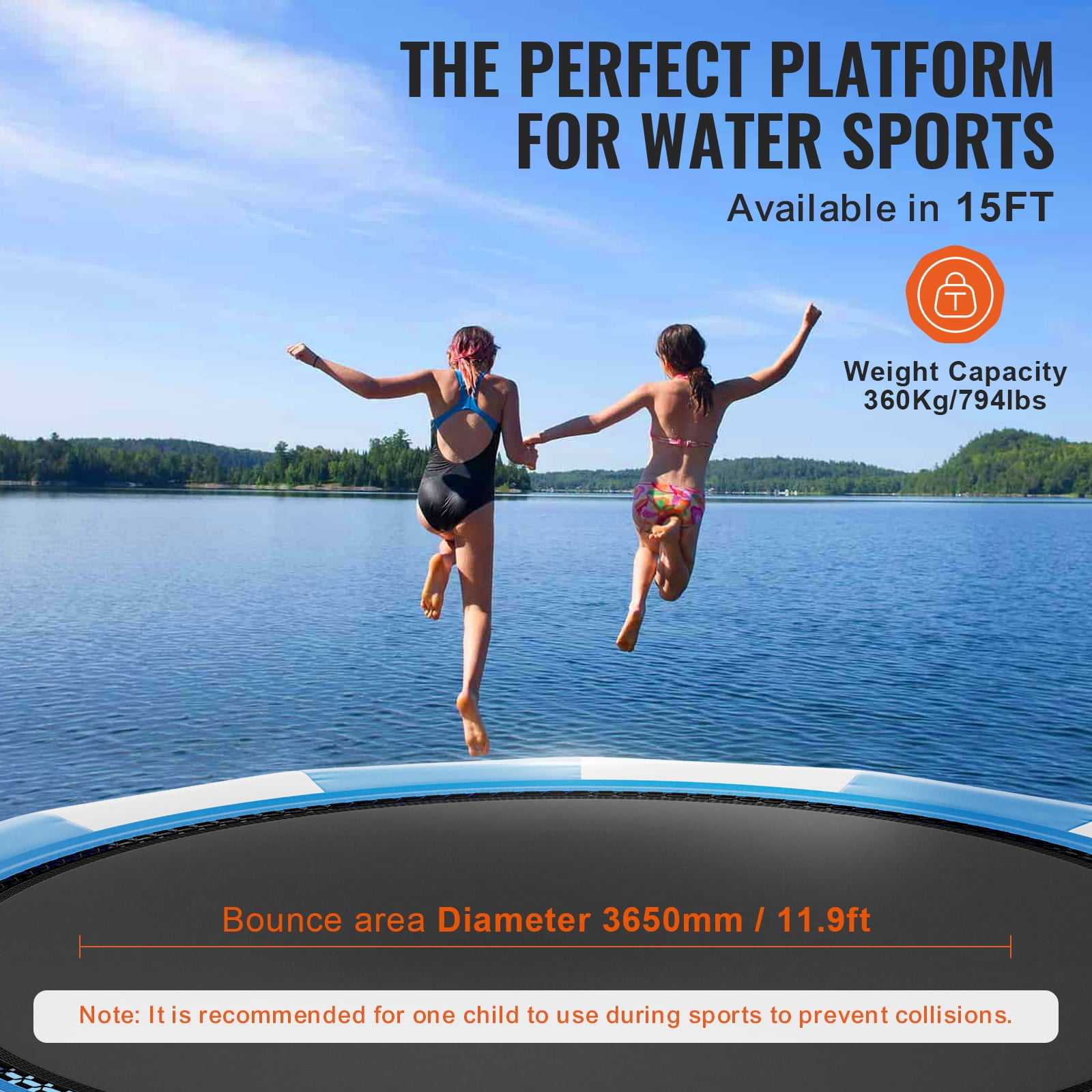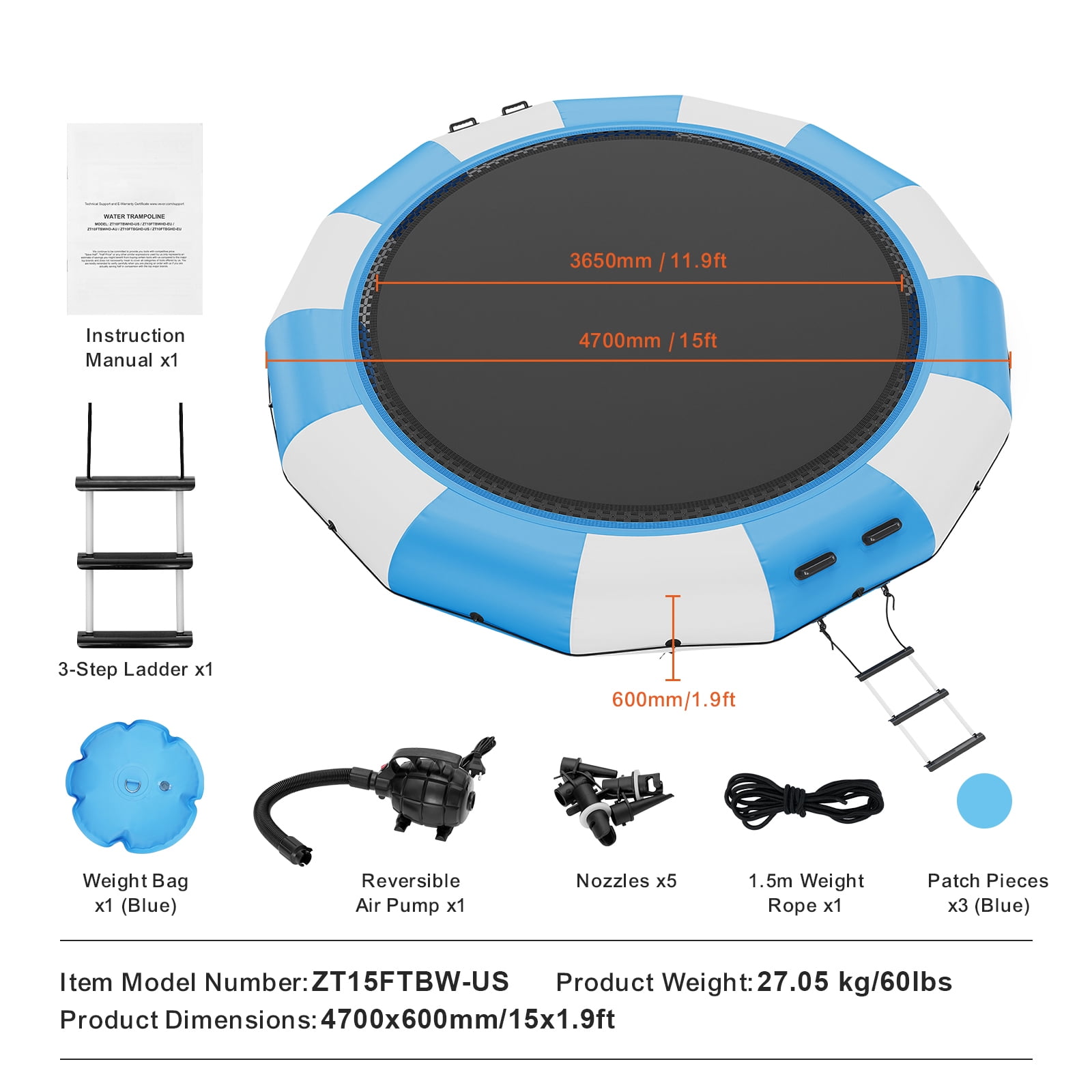 Product Description KFFKFF Water Trampoline Choose from a range of sizes – 6.5FT/10FT/12FT/13FT/15FT/17FT – to suit your budget and requirements. Experience the thrill of bouncing on water with our KFFKFF Water Trampoline. Various Sizes and Colors to Choose From With 6 size options available (6.5FT/10FT/12FT/13FT/15FT/17FT), you can easily find the perfect fit for your budget and requirements. High-Quality Materials Crafted from durable PVC fabric that is thick, waterproof, and wear-resistant, ensuring long-lasting performance. The bungee cords feature five layers of stitching and are expertly intertwined for maximum safety, preventing any possibility of foot entanglement. Additionally, auxiliary ropes are included for enhanced safety, especially for children’s use. Effortless Inflation Equipped with a powerful 600w pure copper motor inflation pump, this floating trampoline offers a seamless and continuous inflation process. Setting up and taking down this trampoline is a breeze, and once deflated, it becomes compact and lightweight, allowing for easy transportation. Designed with User Comfort in Mind Featuring large wave handles that provide a comfortable grip and excellent friction, ensuring a secure and enjoyable experience. The added warning tags promote proper usage, extending the product’s lifespan. Moreover, the ladder area has been enlarged to ensure safe and comfortable climbing. Versatile and Multi-functional This inflatable water trampoline offers a wide range of applications, serving as a swimming platform, fishing platform, or sunbathing platform. However, it is important to exercise caution and avoid sharp objects to maintain its integrity. Comprehensive Accessories Included We provide a comprehensive range of accessories to simplify installation and enhance your overall user experience, ensuring convenience and comfort. Specifications Item Model Number: ZT15FTBW-US/EU Product Weight: 27.05 kg / 60 lbs Product Dimensions: 4700×600 mm / 185×23.6 inches Package Content 1 x Water Trampoline 1 x 1.5m Weight Rope 1 x Weight Bag (Blue) 3 x Patch Pieces (Blue) 1 x Reversible Air Pump 5 x Nozzles 1 x Ladder 1 x Instruction Manual