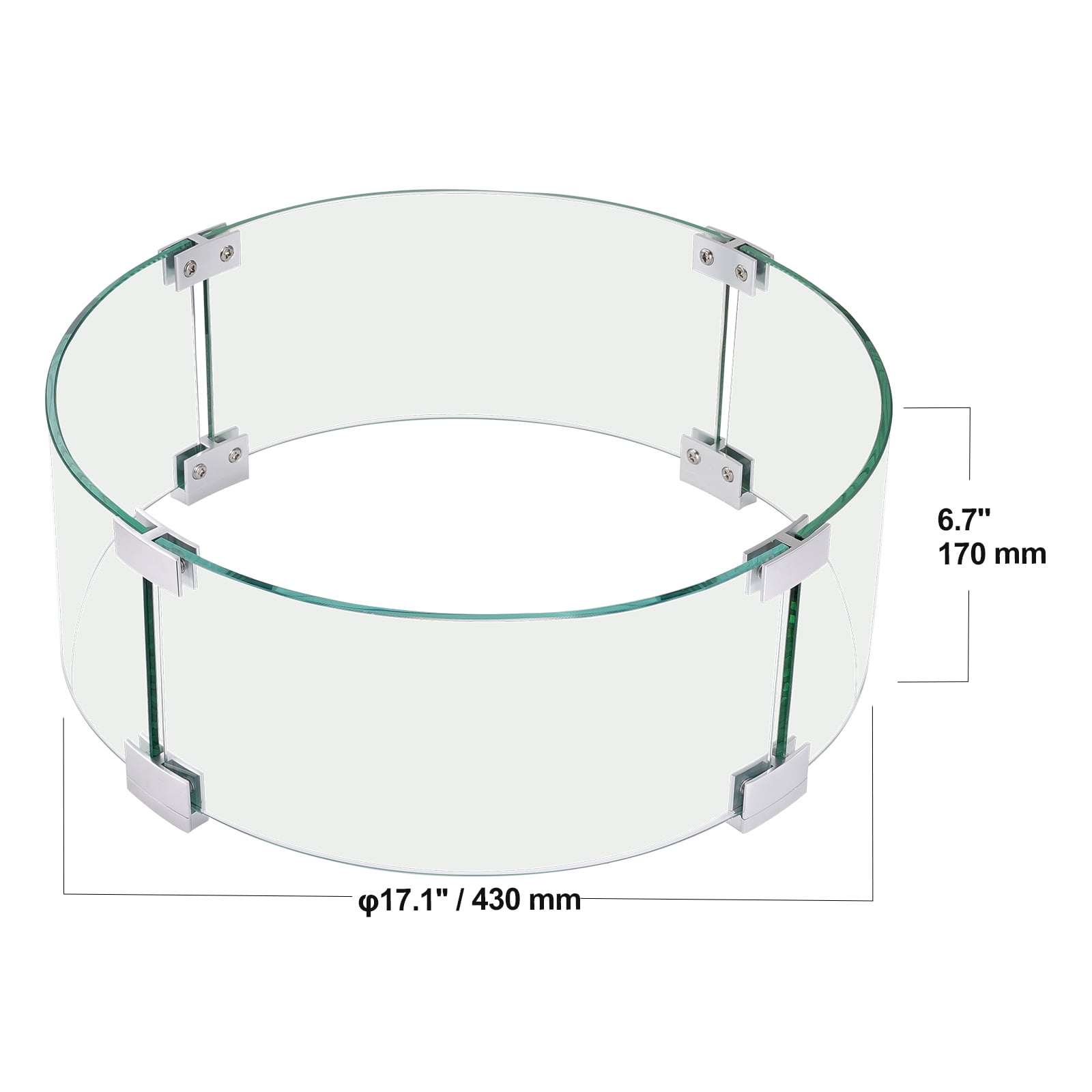 Product Description Effective and Safe Fire Pit Wind Guard Experience the ultimate wind protection for your fire pit with our innovative fire pit wind guard. Crafted with utmost precision, this wind guard ensures a stable flame even in the windiest conditions. Made from high-quality tempered glass and durable aluminum, it guarantees exceptional heat resistance and breakage prevention. With its practical and safe design, it is an essential accessory for courtyard and balcony parties, providing a cozy and warm atmosphere. Installing this wind guard is a breeze, thanks to the included screwdriver. Embrace the perfect fit for your fire pit and enjoy its sturdy and durable construction. Elevate your fire pit experience with our reliable fire pit wind guard. Sturdy, Secure, and Reliable Our fire pit wind guard effectively blocks the wind, ensuring a secure and reliable flame while providing a protective barrier for individuals and objects. Long-lasting Tempered Glass and Aluminum The fire pit wind guard is crafted with durable tempered glass and aluminum, offering longevity, stability, and resistance to high temperatures, ensuring a prolonged lifespan. Simple Installation Installation is a breeze with a screwdriver, and it can be easily accomplished by a single person. Functional and Secure Design Multiple functional and considerate design features enhance safety and provide a convenient user experience. Versatile for Various Environments Ideal for courtyard gatherings, balcony parties, and essential for use with a fire pit table. Effortless Cleaning Crafted from glass and metal materials, it can be effortlessly cleaned with mild soapy water. Specifications Model: VV-FPWG-Y-17*6 Main Material: Tempered Glass Windscreen Height: 6.7” / 170 mm Thickness: 0.24” / 6 mm Net Weight: 7.1 lbs / 3.22 kg Product Dimensions: ∅17.1” x 6.7” / ∅435 x 170 mm Package Content Glass Panels x 4 Bottom Bracket Components x 4 Sets Top Bracket Components x 4 Sets Screwdriver x 1 Instruction Manual x 1