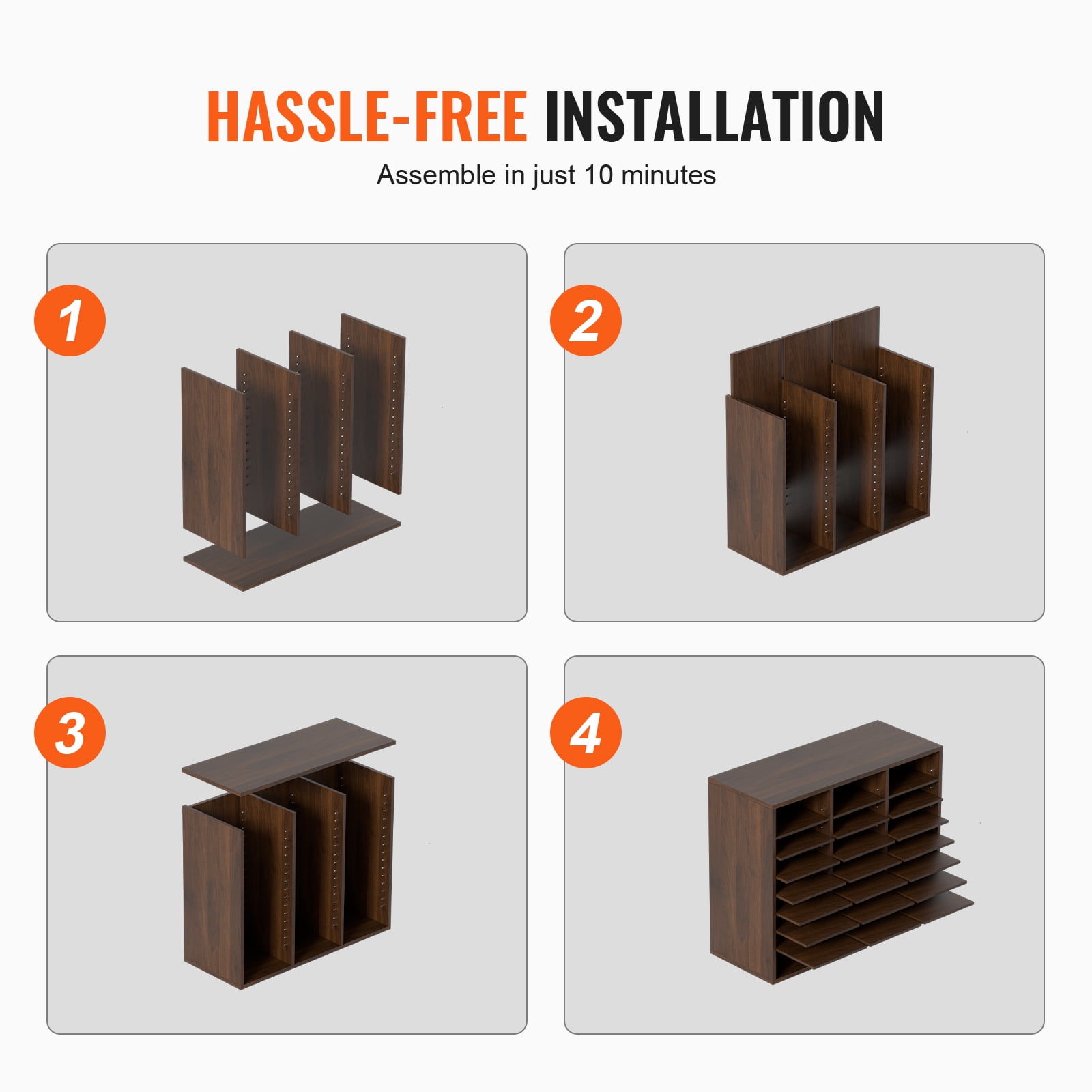 Product Description Get organized with KFFKFF and tidy up your workspace. KFFKFF’s 24-compartment literature organizer keeps your literature, files, and forms organized and easily accessible. Each compartment provides ample space to store your papers, and the removable shelves can be adjusted to create taller compartments for larger binders. Tidy up your space with KFFKFF. 24 Awesome Compartments With 24 spacious compartments, you’ll have plenty of room to store all your literature, comic books, files, student assignments, and more, while saving valuable space. Adjust with Ease Our file sorter is designed for easy adjustment, allowing you to remove layers and create taller compartments as needed, so you can fit all your important materials with ease. Use with Confidence Crafted from top-quality P2 chipboard that has been EPA certified, our wood literature organizer is both non-toxic and odorless, making it safe for use in any environment. 22 lbs Weight Capacity Thickened boards are applied, and our wood file organizer can hold 22 lbs in each compartment. Hassle-free assembly Simply follow the included instruction manual, and you’ll have it up and running in just 10 minutes. You will be ready to put it to work. Diverse Application Whether you’re using it in the home, office, classroom, or studio, our versatile organizer is an ideal solution for keeping all your important literature organized and within reach. Specifications Item Model Number: KL-FC09 Product Size: 29x12x24.4 inch/737x305x620 mm Single Compartment Size: 11.1×8.7×2.2 inch/282x222x55 mm Material: P2 Grade Chipboard and MDF Adjustable Shelf: 0.9-2.2 inches Load Capacity of single Compartment: 22 lbs/10 kg Package Content 1 x 24-Compartment Wood Literature Organizer 1 x Installation Accessories Kit