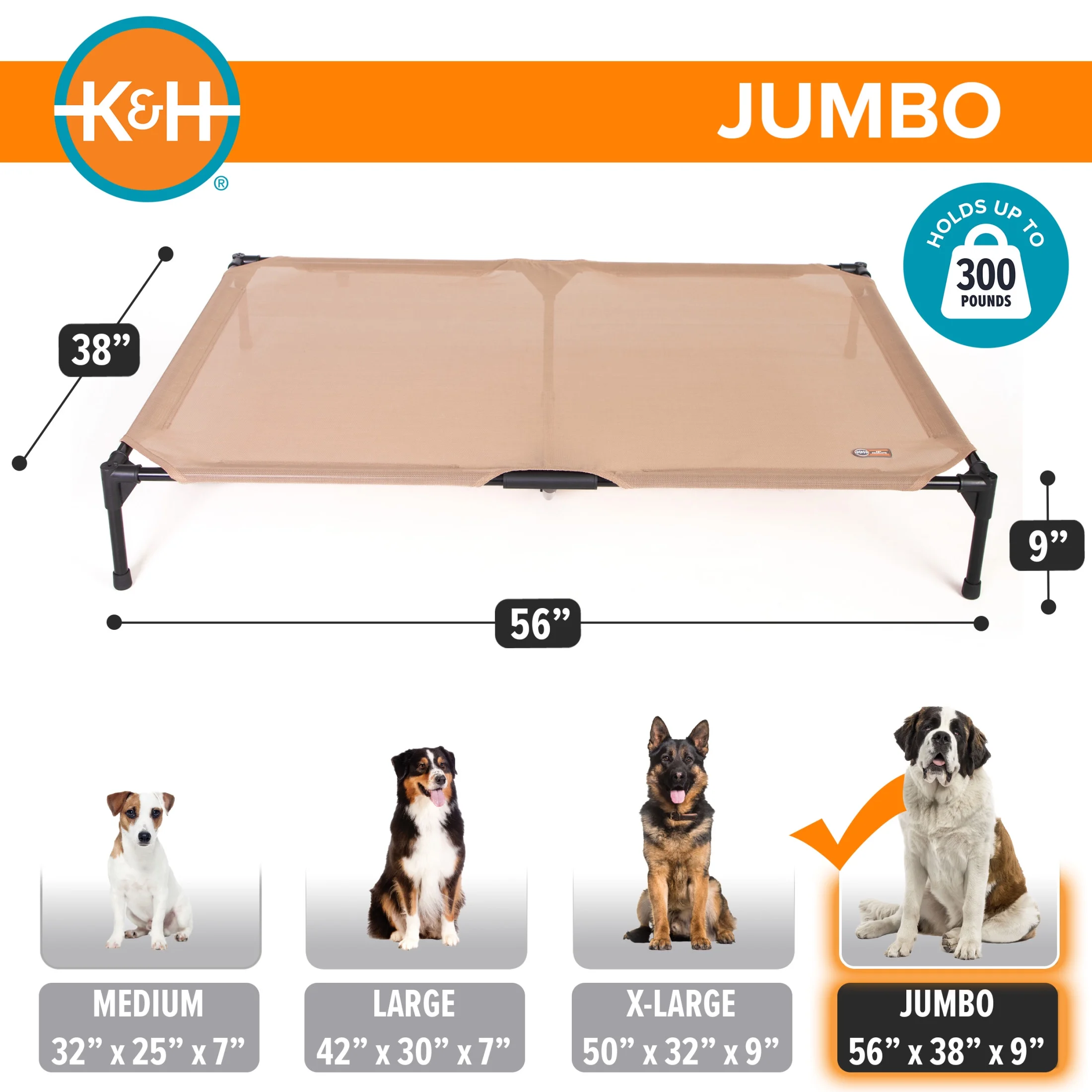 Raised dog bed helps pets stay cool in summer months by allowing air to circulate and keeps pets off wet/cold ground with maximum ground clearance Lifted pet bed with a breathable all-mesh waterproof cover is great for indoor and outdoor use and the hammock design aids pet with joint issues by relieving joint stress Dog cots lightweight metal frame and super strong all mesh cover is durable and tested for strength and holds up to 300 pounds depending on size Removable cover is machine washable and can even be hosed off outdoors, and replacement covers are available separately for easy swapping Easy to assemble and disassemble, no tools necessary making this bed great for use during travel, camping, picnicking and more Designed by K&H, the Colorado brand with OVER 25 years of experience in creating safe innovative, quality pet products; one-year limited warranty Jumbo measures 56 X 38 X 9, perfect for the world’s largest dog breeds like: Great Danes, Mastiffs, Leonbergers, Newfoundlands, St. Bernards, etc