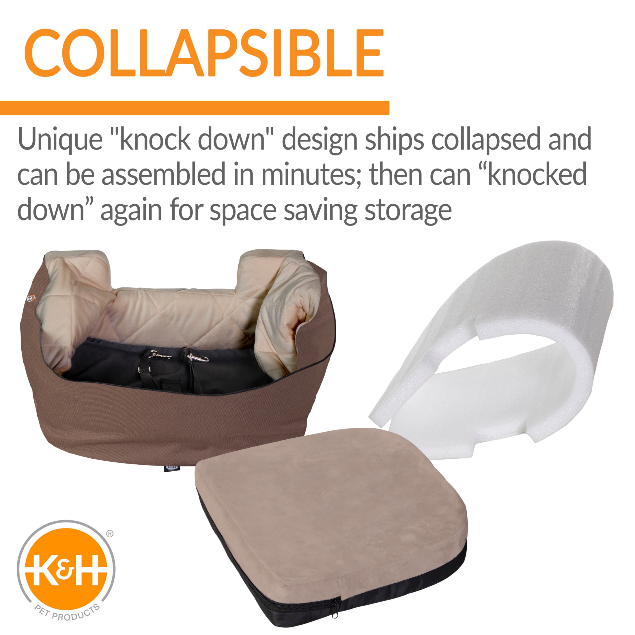Collapsible booster pet car seat elevates pet(s) for a better view, while the firm foam bolster around the edge keeps them in a safe and controlled spot for a distraction-free drive Compatible with any car seat belt to securely buckle in place with the seat belt hidden under the removable booster cushion plus comes with two adjustable security tethers to attached to dog harness Quick to install and uninstall and the front dips down so your pet can easily climb in and out before buckling up Removable, washable, plush quilted fleece cover ensures pet comfort and easy maintenance, and this model is collapsible, it knocks down for flat storage The contoured back is designed to fit snugly in the front or back seat of any size car. The small bucket booster is recommended for small pets and the large booster can fit up to two small pets or one medium sized breed This pet booster seat is just like the K&H Original Bucket Booster, but has a unique “knock down” design that ships collapsed and can be assembled in minutes; then can knocked down/collapse again for space saving storage Designed by K&H with OVER 20 years of experience in creating safe, innovative, quality products for pets