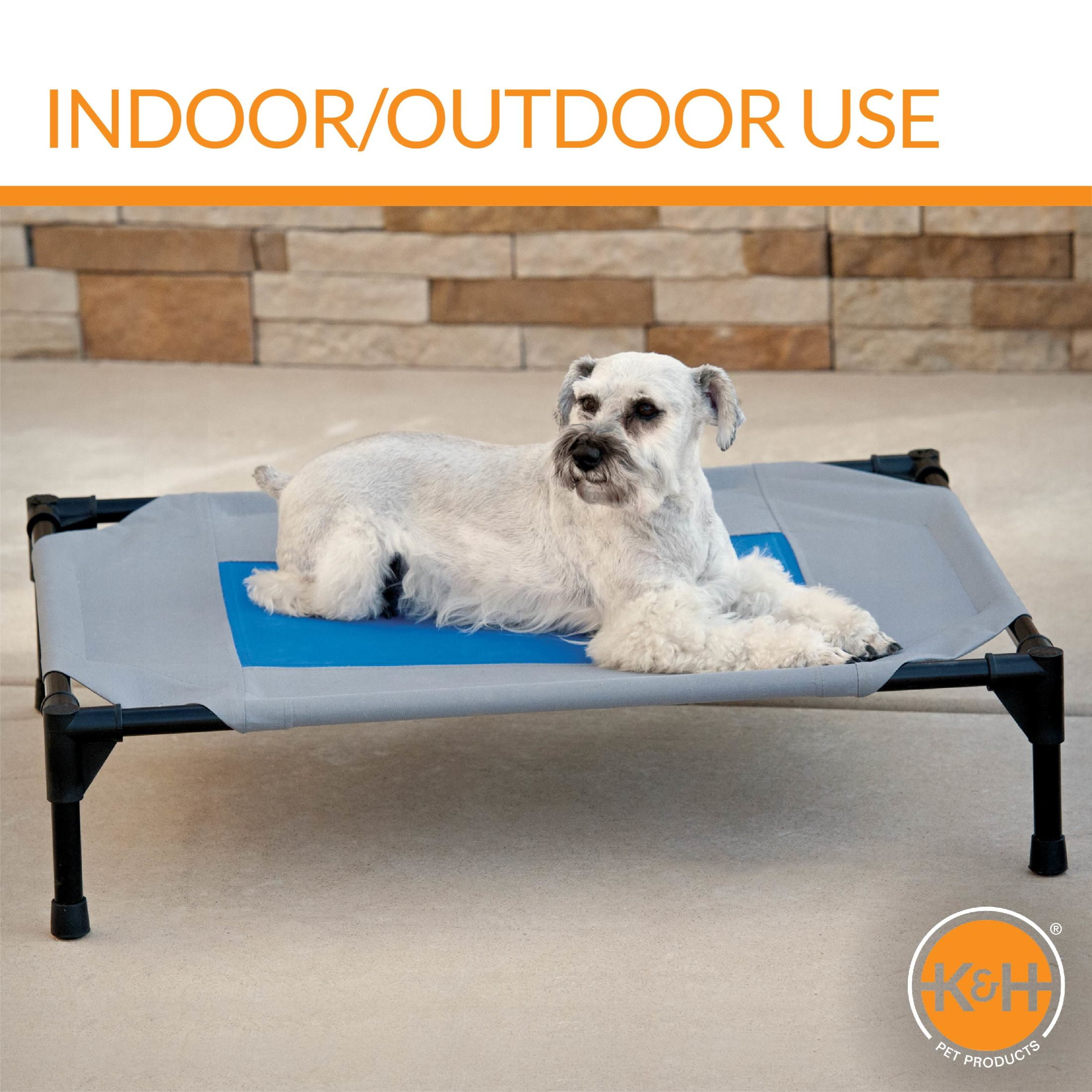 Dog cot made of waterproof, heavy-denier fabric Raised dog bed helps pets stay cool with its refillable coolin’ center Durable & tested for strength, holds up to 200 pounds Simple, tool-free assembly with non-skid rubber feet Removable, cooling cover Great for indoor, outdoor and travel use Medium size elevated dog bed measures 25 X 32 X 7 inches
