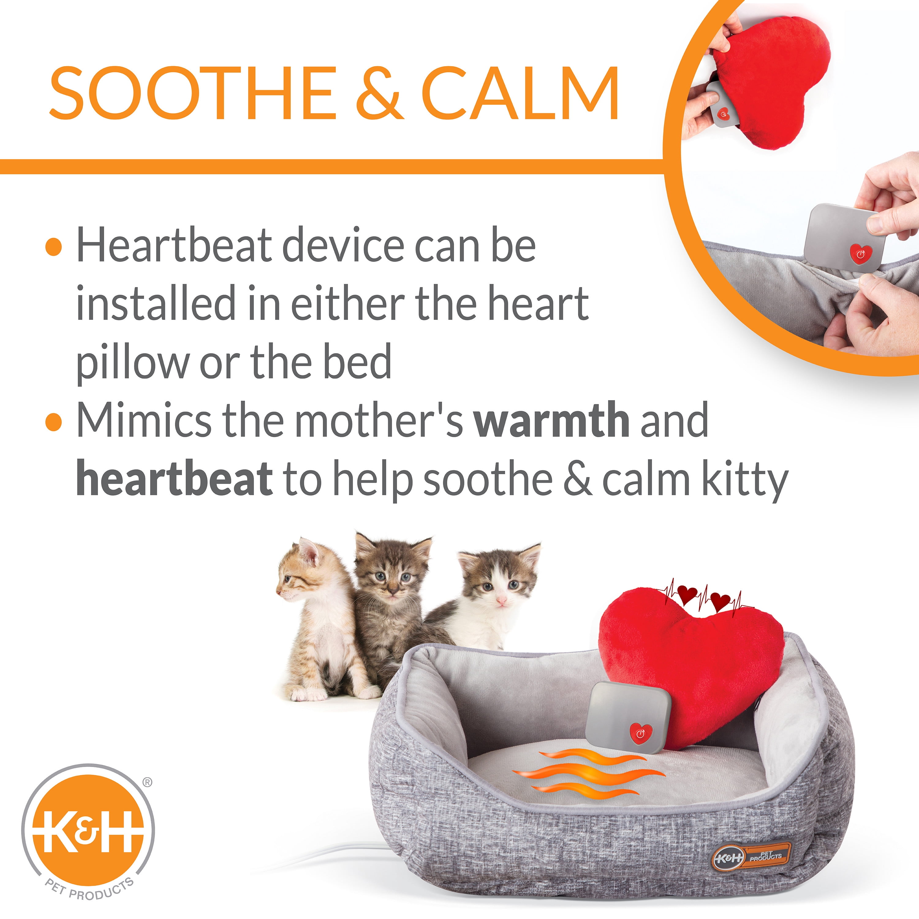 Kitten heartbeat set includes a heated cat bed, a heartbeat devise set exclusively for cats, and a heart pillow Mother cat heartbeat helps kittens transition to their new home and reduces anxiety and stress Heartbeat pack can be inserted into the heated cat bed or the included heart pillow This heated cat bed has been tested & certified by MET Labs to exceed USA/CA electrical safety standards One year manufacturer limited warranty Heartbeat rhythm is specifically designed to mimic the heartbeat of a mother cat