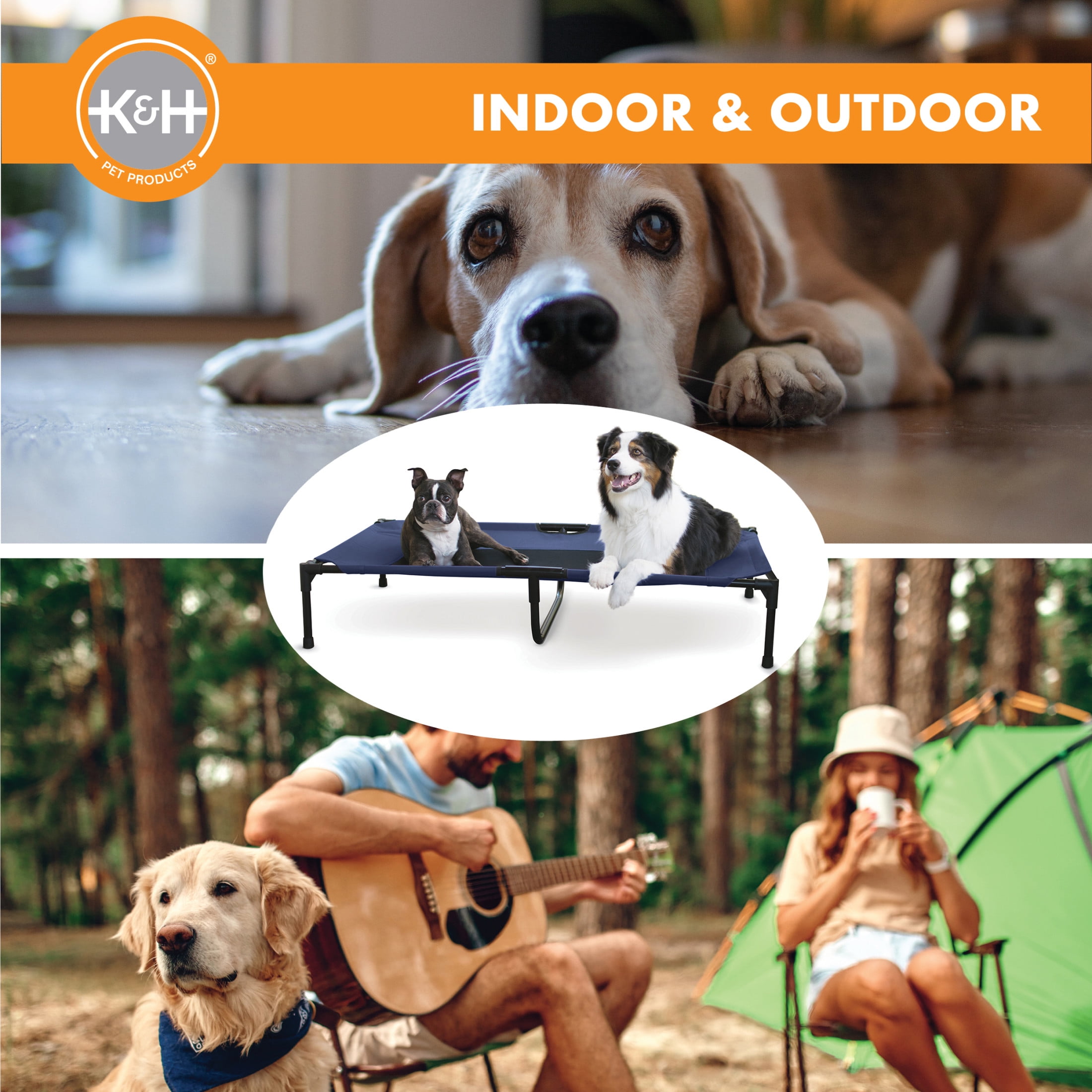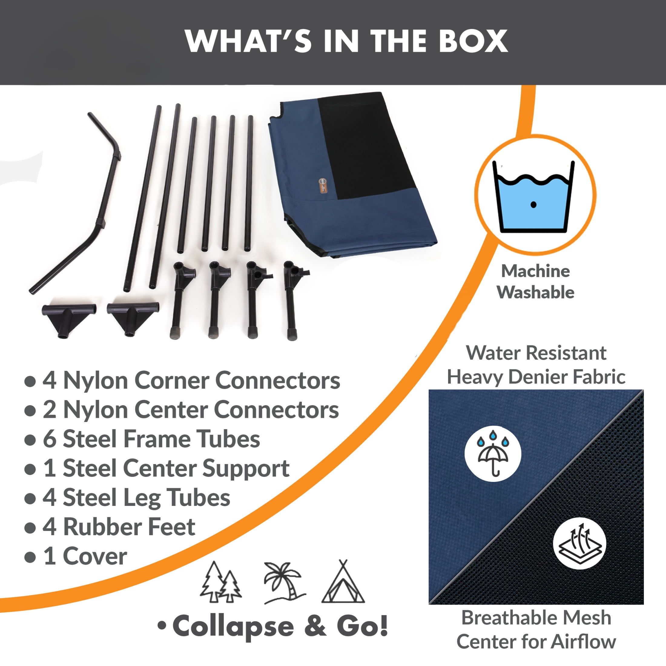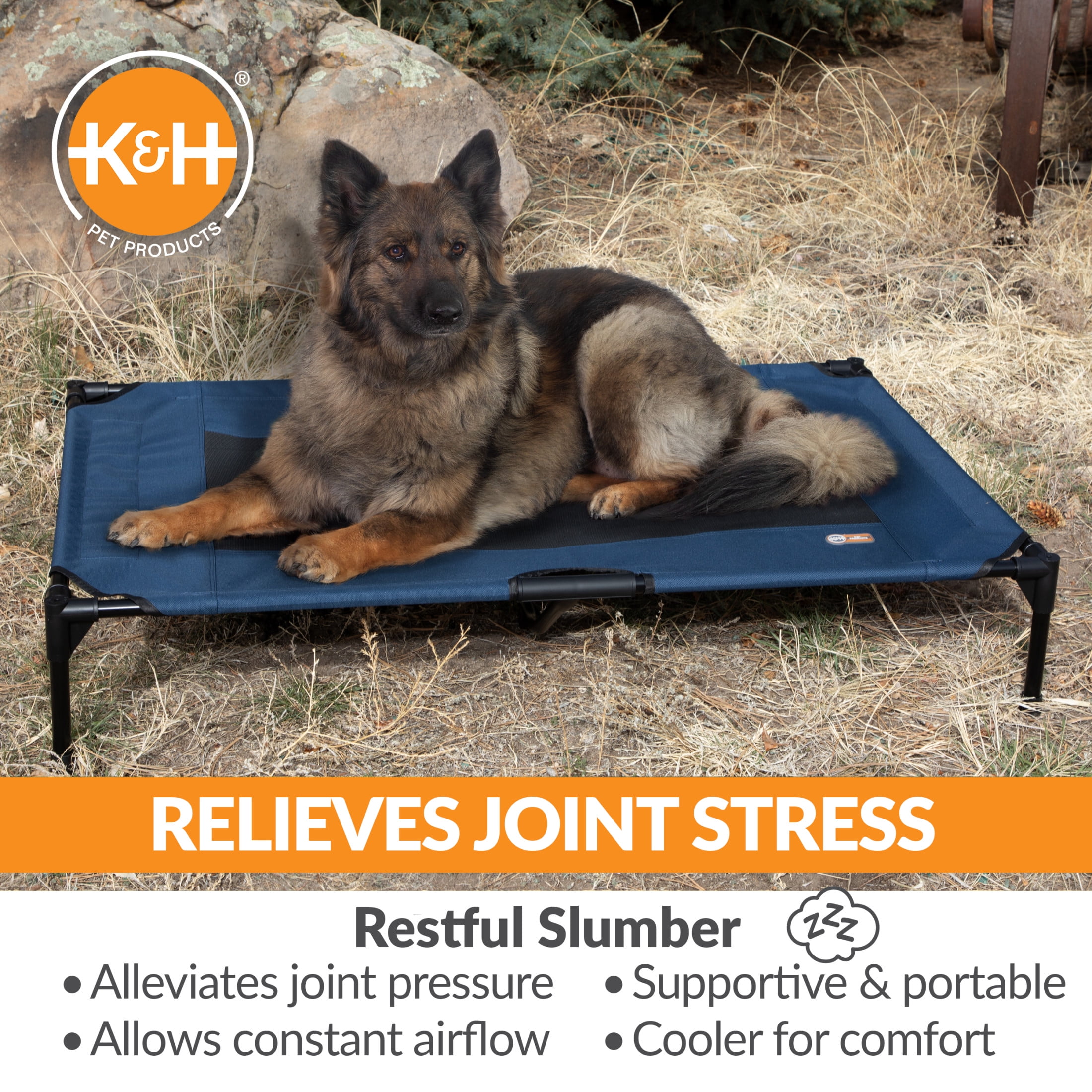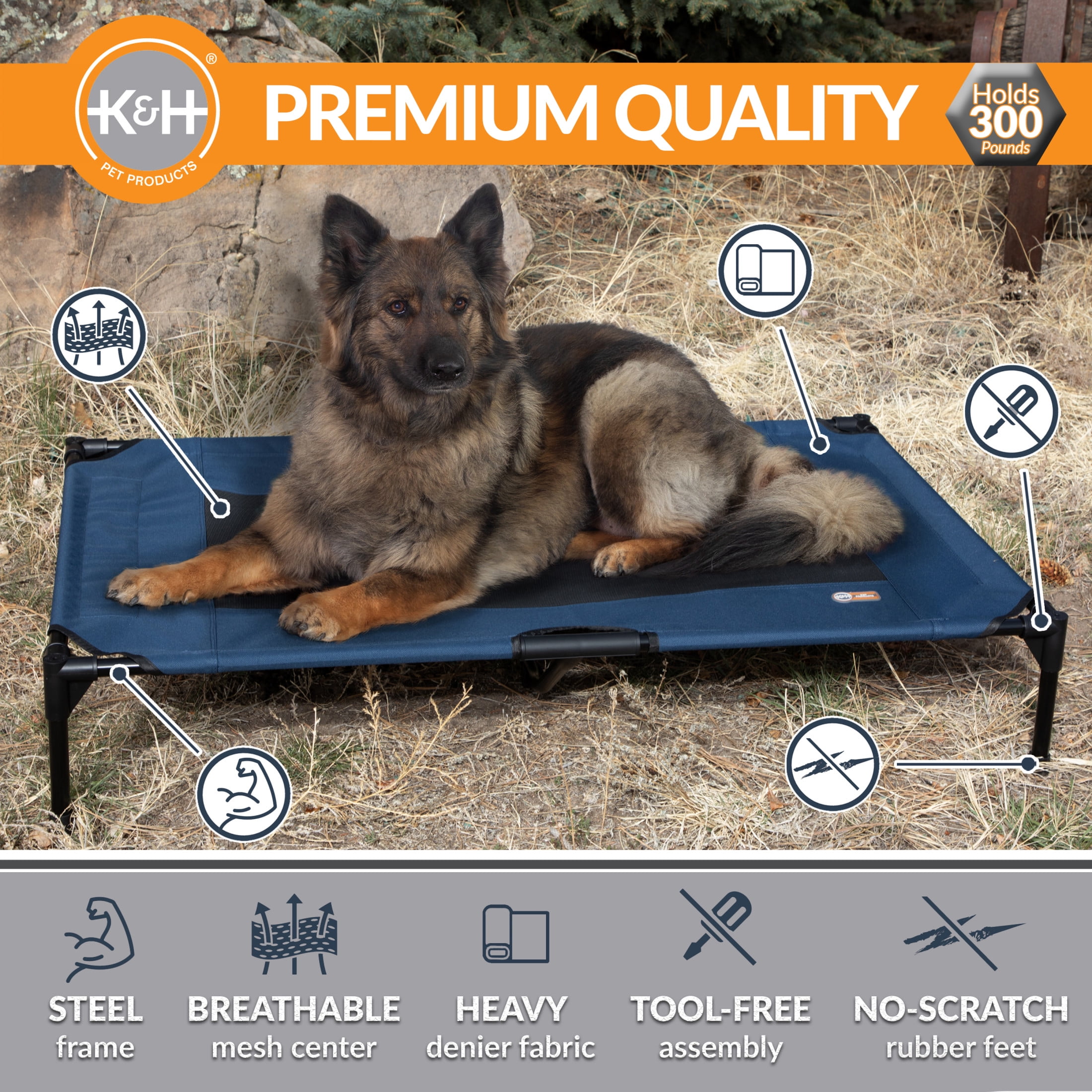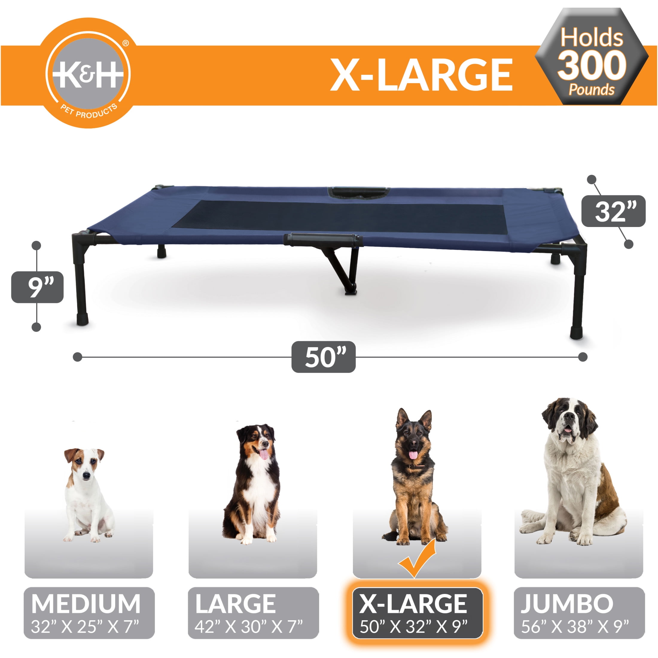 Raise pet bed promotes airflow, keeping pets cool in warm seasons, while providing ideal ground clearance to prevent contact with wet or cold surfaces, keeping them away from dirt, bugs, ticks, ants, etc This elevated pet bed with a breathable mesh center is perfect for both indoor and outdoor settings; slip-resistant rubber feet safeguard indoor flooring, while the water-resistant mesh center repels moisture Robust and durable, our dog cots feature a lightweight steel metal frame and heavy denier cover, capable of accommodating 200-300 pounds (depending on size), making them ideal for large dogs The removable cover is machine washable for easy maintenance, and it can also be hosed off outdoors for hassle-free cleaning Collapsible dog cot is easy to assemble and disassemble, no tools necessary making this portable bed great for use during travel, camping, picnicking, place board training and more X-Large measures 50 X 32 X 9, perfect for large and X-large sized breeds like: German Shepherds, Bernese Mountain Dog, Malamute, Akita, etc