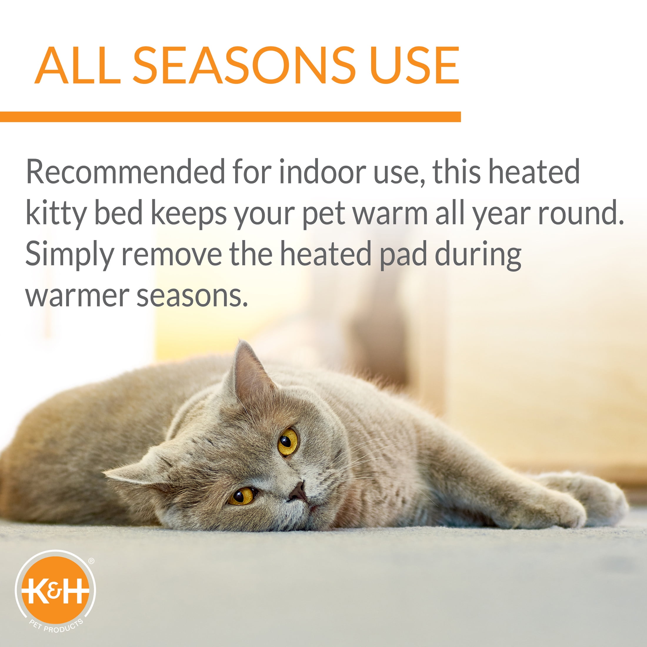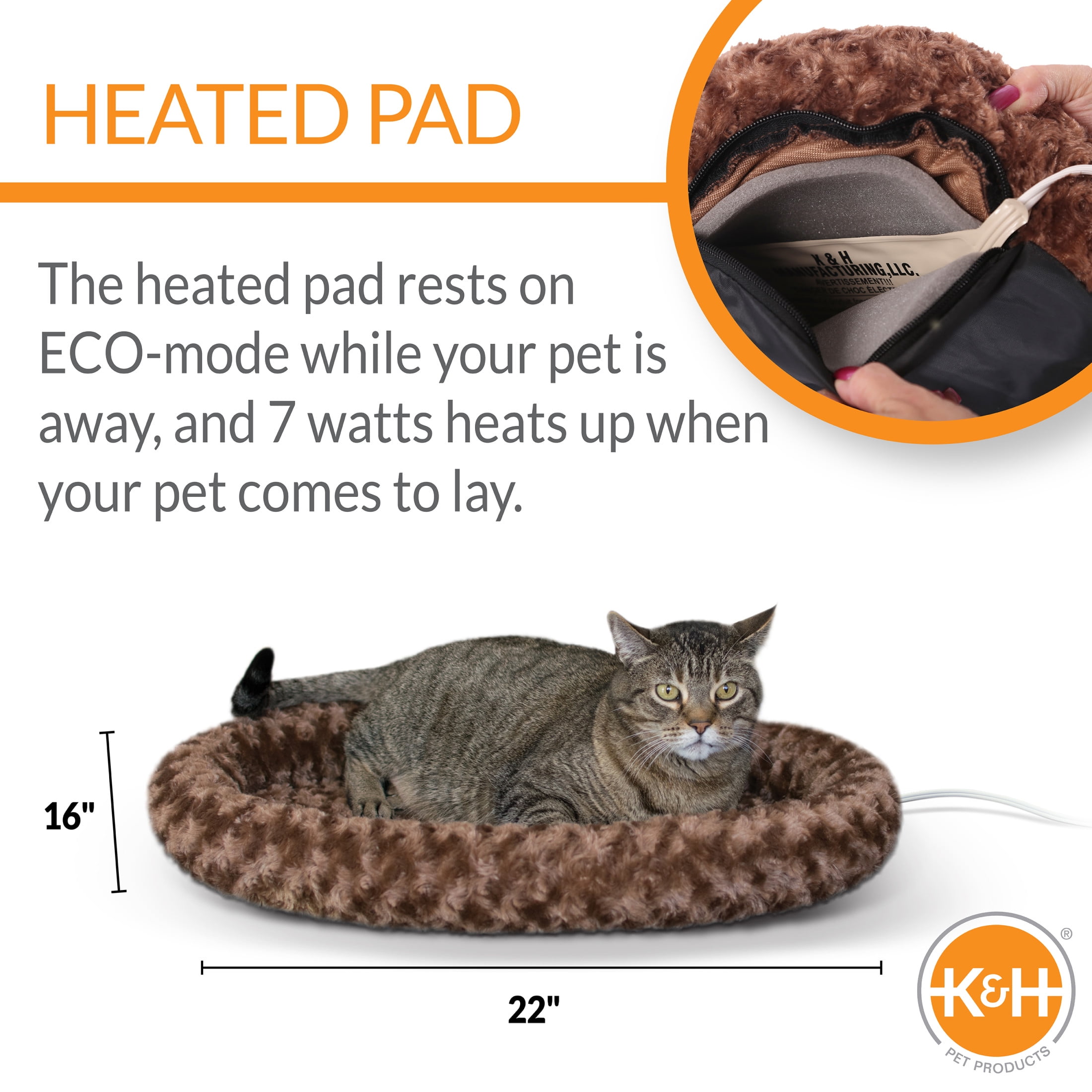 Heated cat bed features a soft orthopedic foam base and over-stuffed bolsters for security and comfort Electric heated cat bed is thermostatically controlled to automatically warm to your cat’s normal body temperature only when your kitty is in the heated pet bed Heated cat bed is low wattage and extremely energy efficient; the thermostatically controlled 4 watt heater is removable for use in all seasons K&H Thermo-Kitty fashion splash heated cat bed features a removable machine washable cover for easy wash and care K&H doesn’t just use safety listed parts, we safety certify the entire product. This heated cat bed has been tested & certified by MET Labs and exceeds USA/CA electrical safety standards The K&H Thermo-Kitty Fashion Splash is available in two colors and sizes; both sizes come in blue or mocha, the small measures 16″ in diameter, and the large measures 16″ x 22″