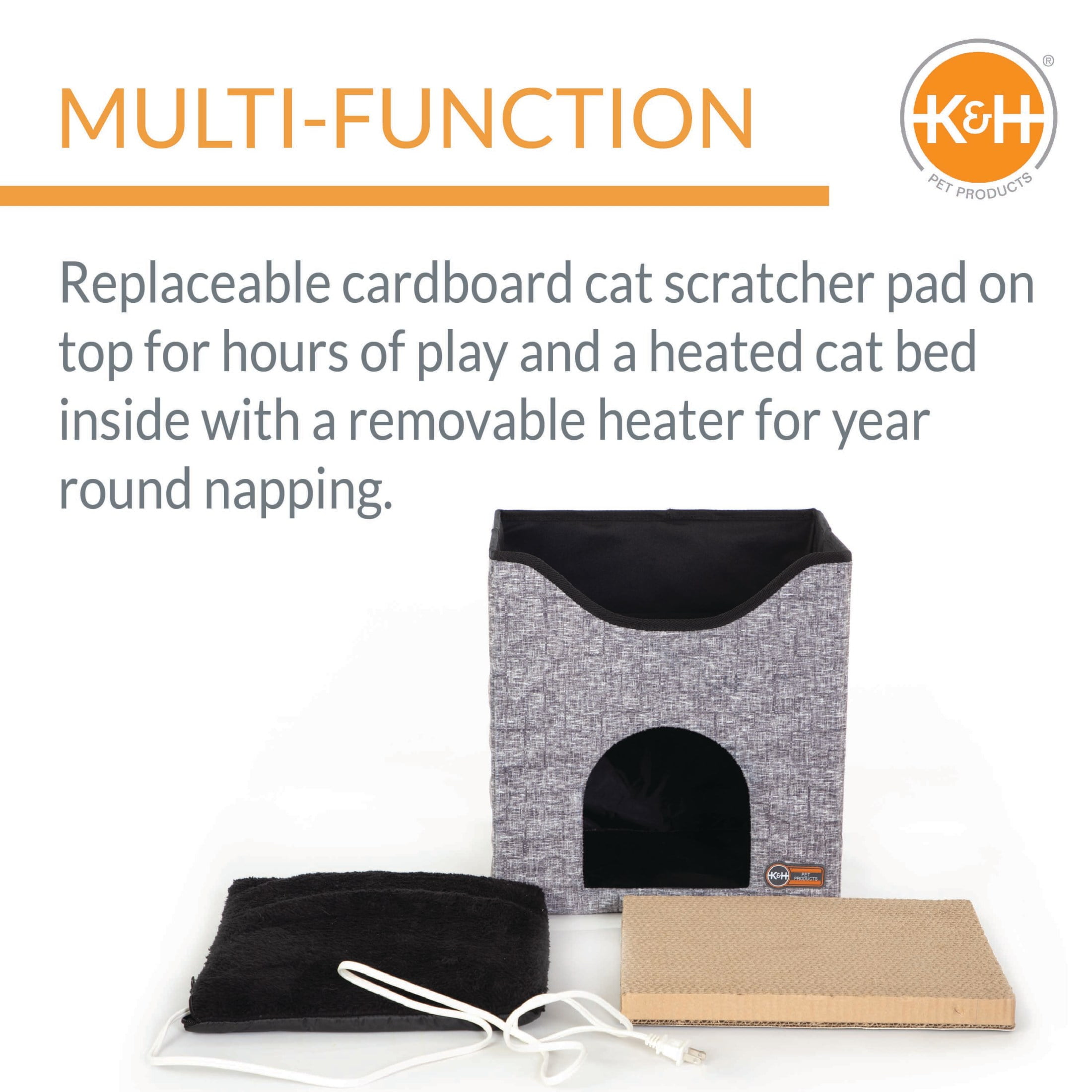 This amazing indoor cat house is a cat scratcher, a cat cave, and a heated cat bed all in one Replaceable cardboard cat scratcher pad on top for hours of play Heated cat bed inside features a removable heater for year round use Measures 12″ x 14″ x 15″, purrfect for most household cats This indoor heated cat house has been tested & certified by MET Labs to exceed USA/CA electrical safety standards.